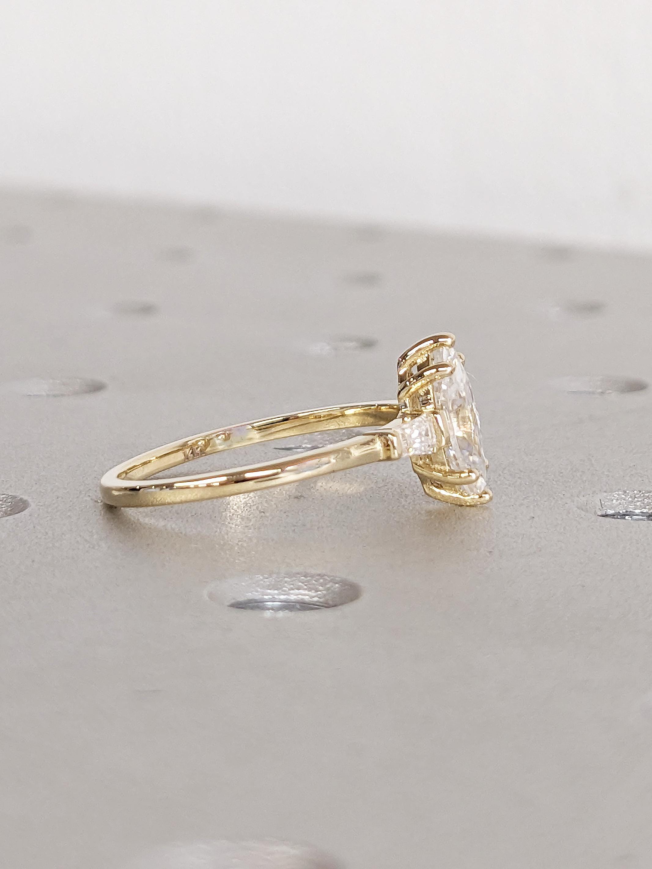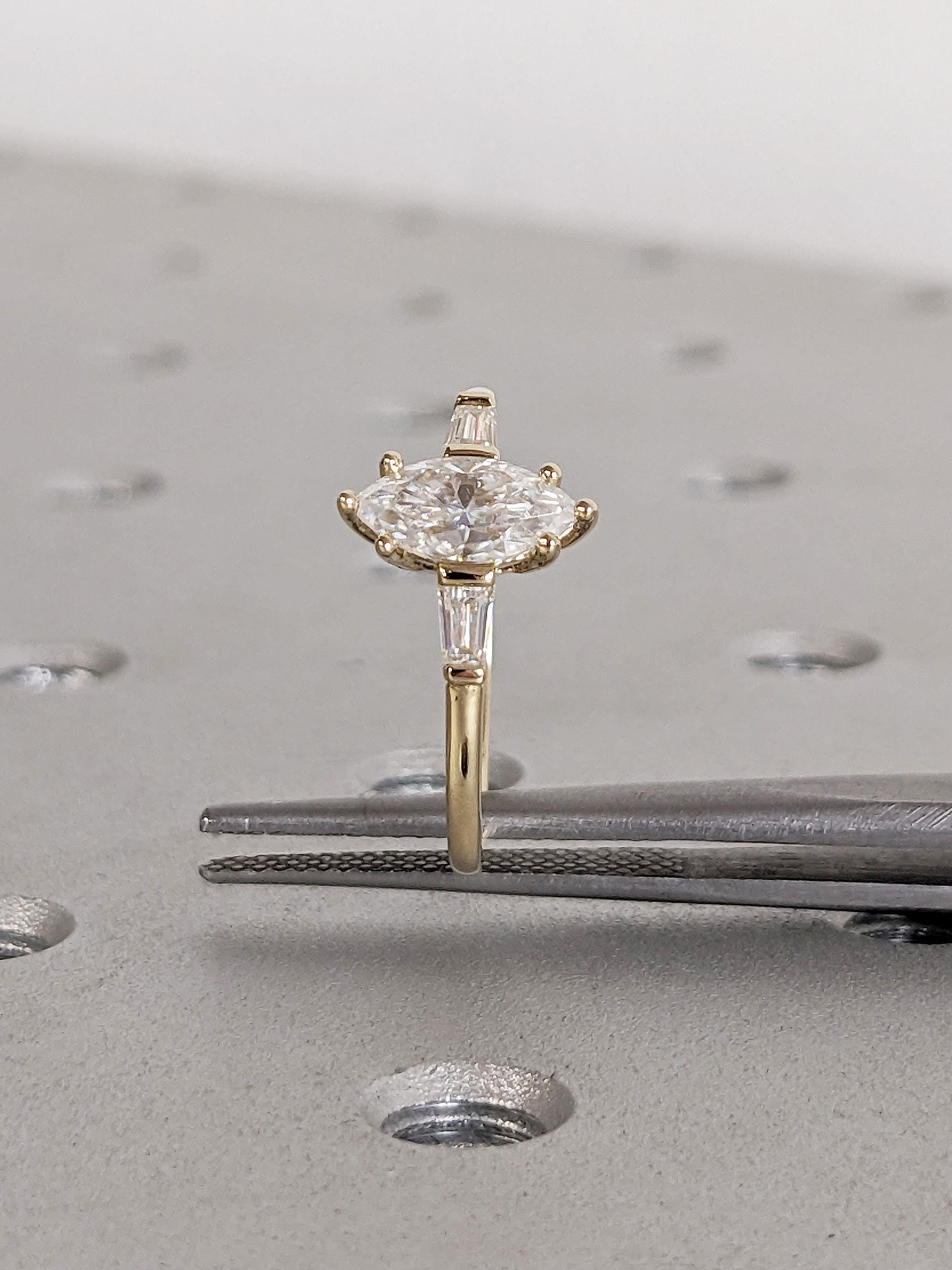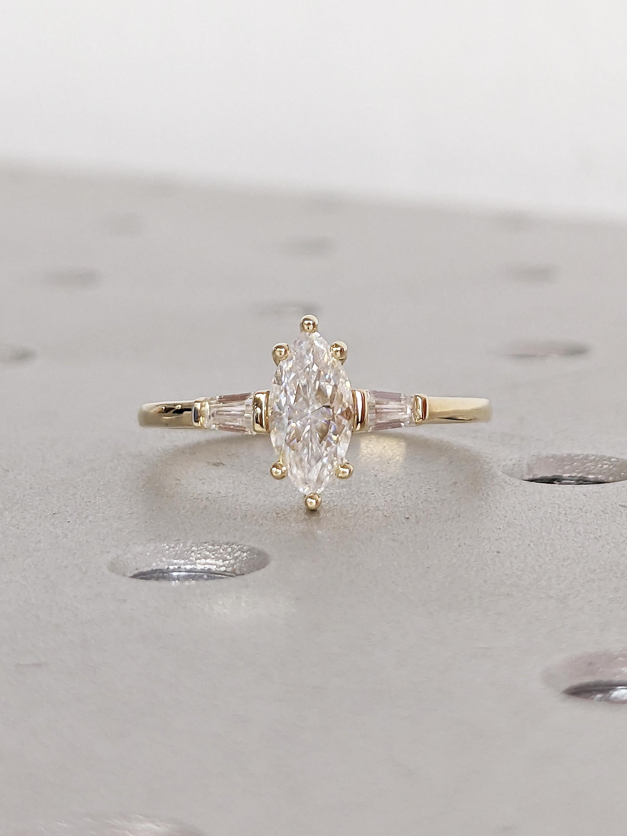 This exquisite engagement ring features a breathtaking marquise cut Moissanite at its center. Flanking each side, tapered baguette cut stones add a touch of sophistication and symmetry, available in your choice of dazzling Natural Diamonds or Moissanites. Set on a lustrous gold band, this timeless design combines elegance and modern allure, making it a perfect symbol of love and commitment.