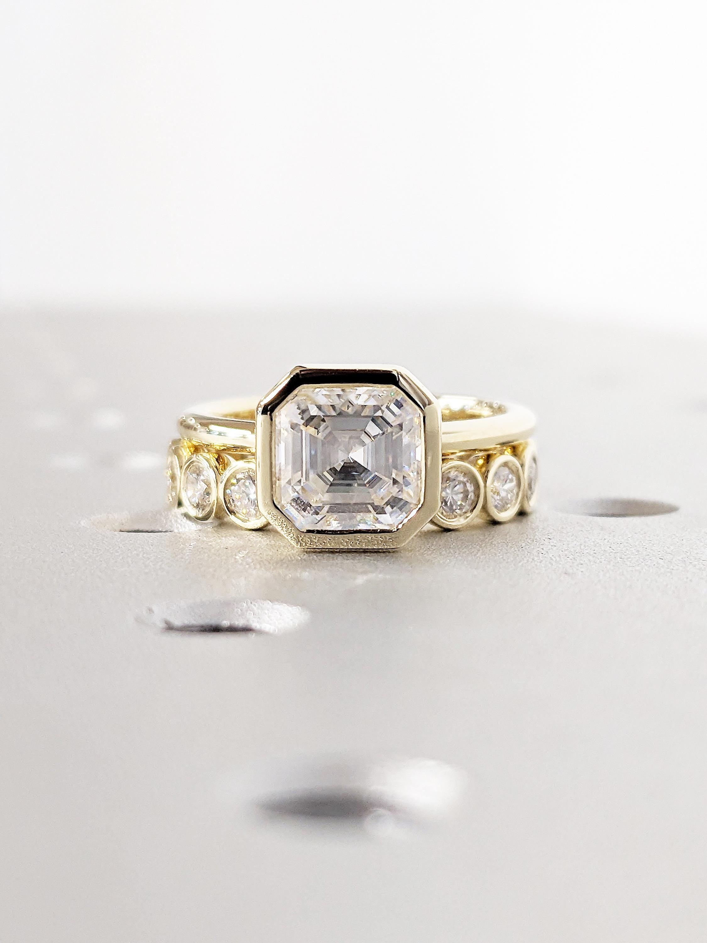 This elegant engagement ring set showcases an asscher-cut Lab Grown Diamond in a sleek bezel setting. Meticulously handcrafted, this timeless piece is the perfect statement ring to elevate your sophisticated style. Pair it with our full eternity band adorned with round-cut Diamonds in gold bezels. Together, these rings form a harmonious blend of contemporary and classic style, ideal for engagements or special occasions.