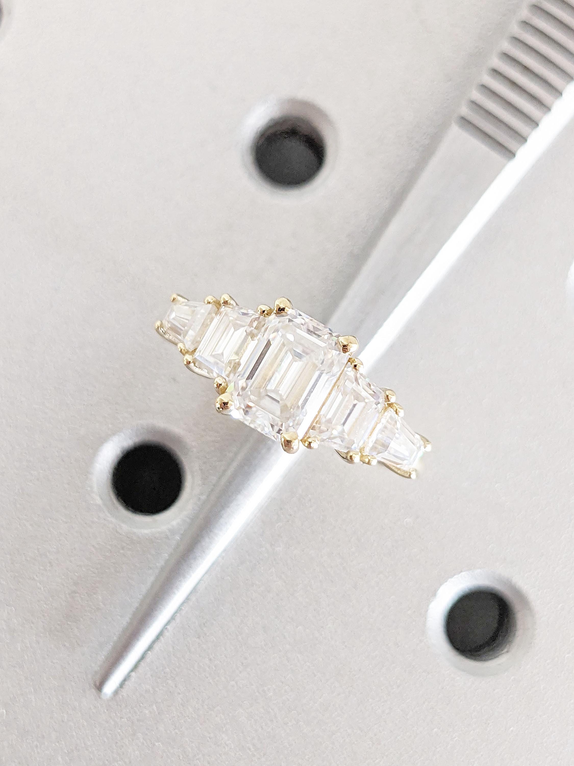 An exquisite geometrical masterpiece, this handmade ring features an emerald cut Moissanite center, accented by tapered baguette cut and trapezoid shaped side stones. Set on a thin band of 1.4mm width, this five stones ring is the perfect gift to celebrate wedding anniversary, as it symbolizes the 5 pillars of a relationship: love, trust, empathy, communication and commitment.