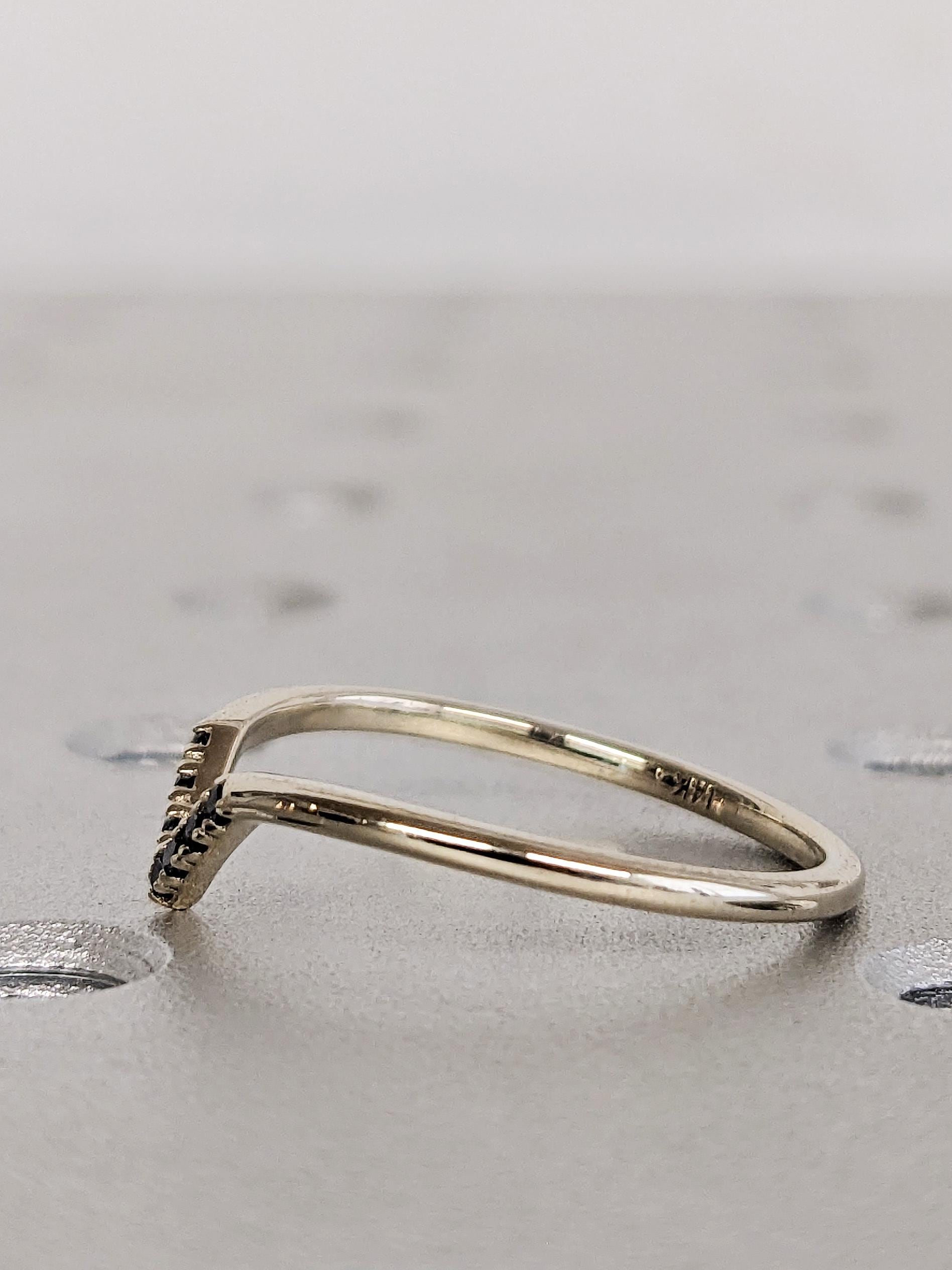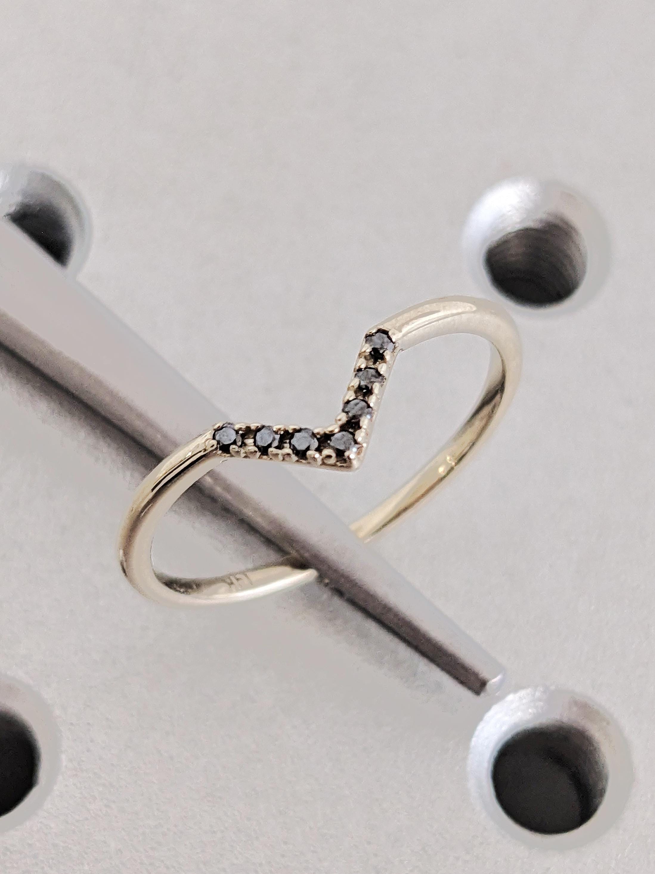 This elegant chevron ring is adorned with pavé set black diamond accents, offering a sleek, look that shines on its own or stacks effortlessly with your favorite bands. Perfect for everyday sophistication, this piece brings a contemporary edge to any collection.