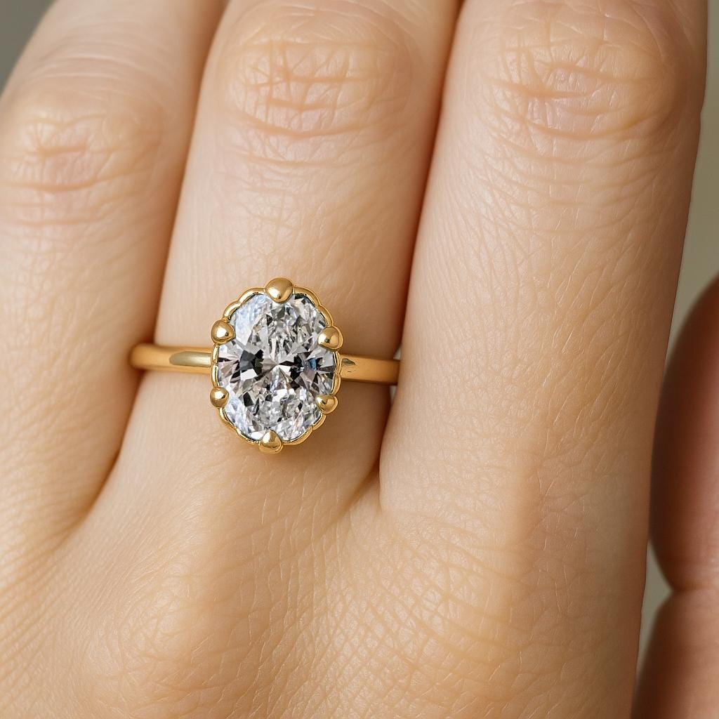 An ocean inspired ring, handmade with precision, features an oval cut Moissanite solitaire, gracefully cradled by a unique seashell shaped basket setting, on a rounded band of 1.5mm width. This minimalist ring exudes that little mermaid fairy tale vibe, that will definitely satisfy any ladies wising to be an underwater princess for the day wearing this delicate ring.