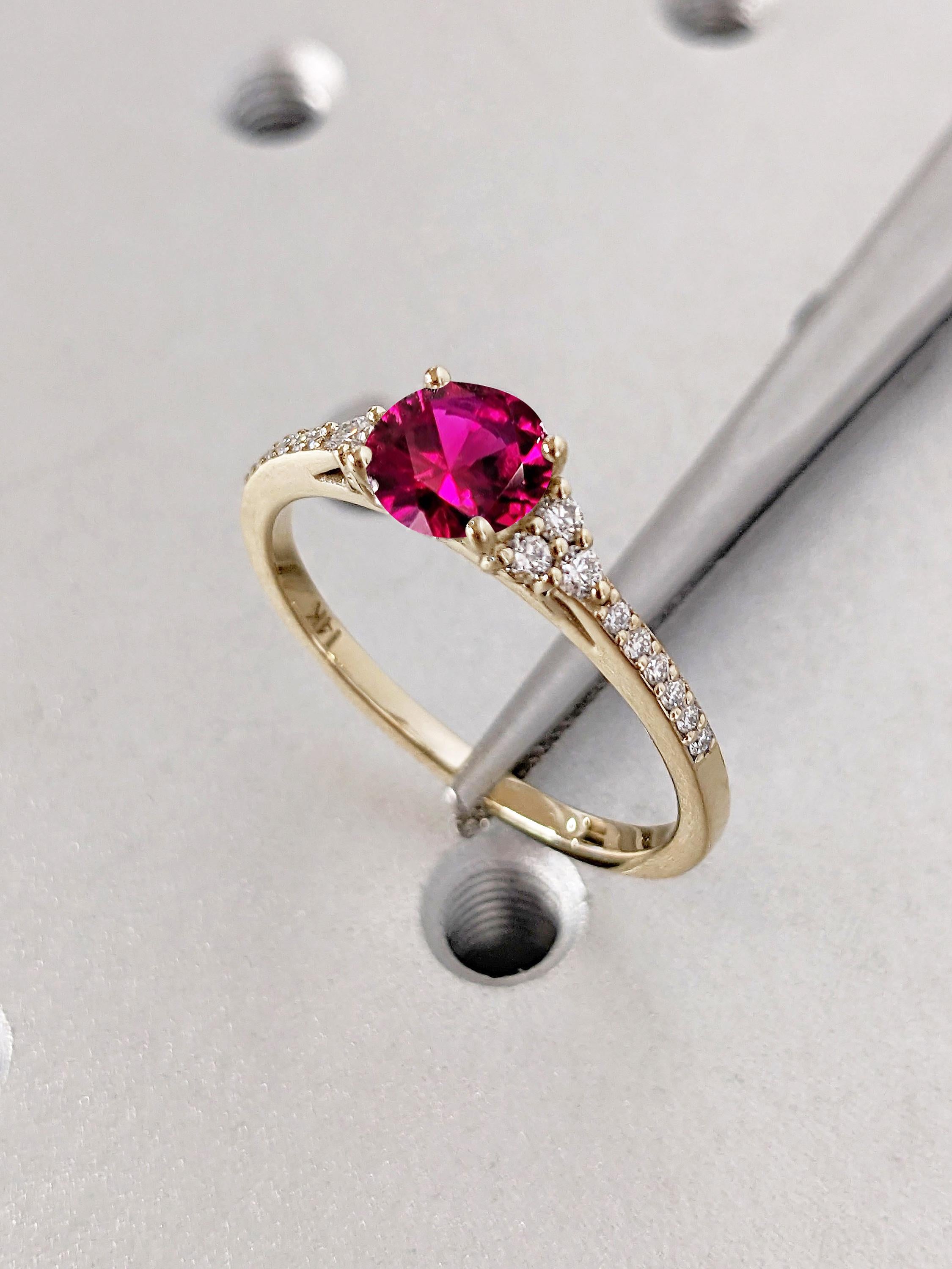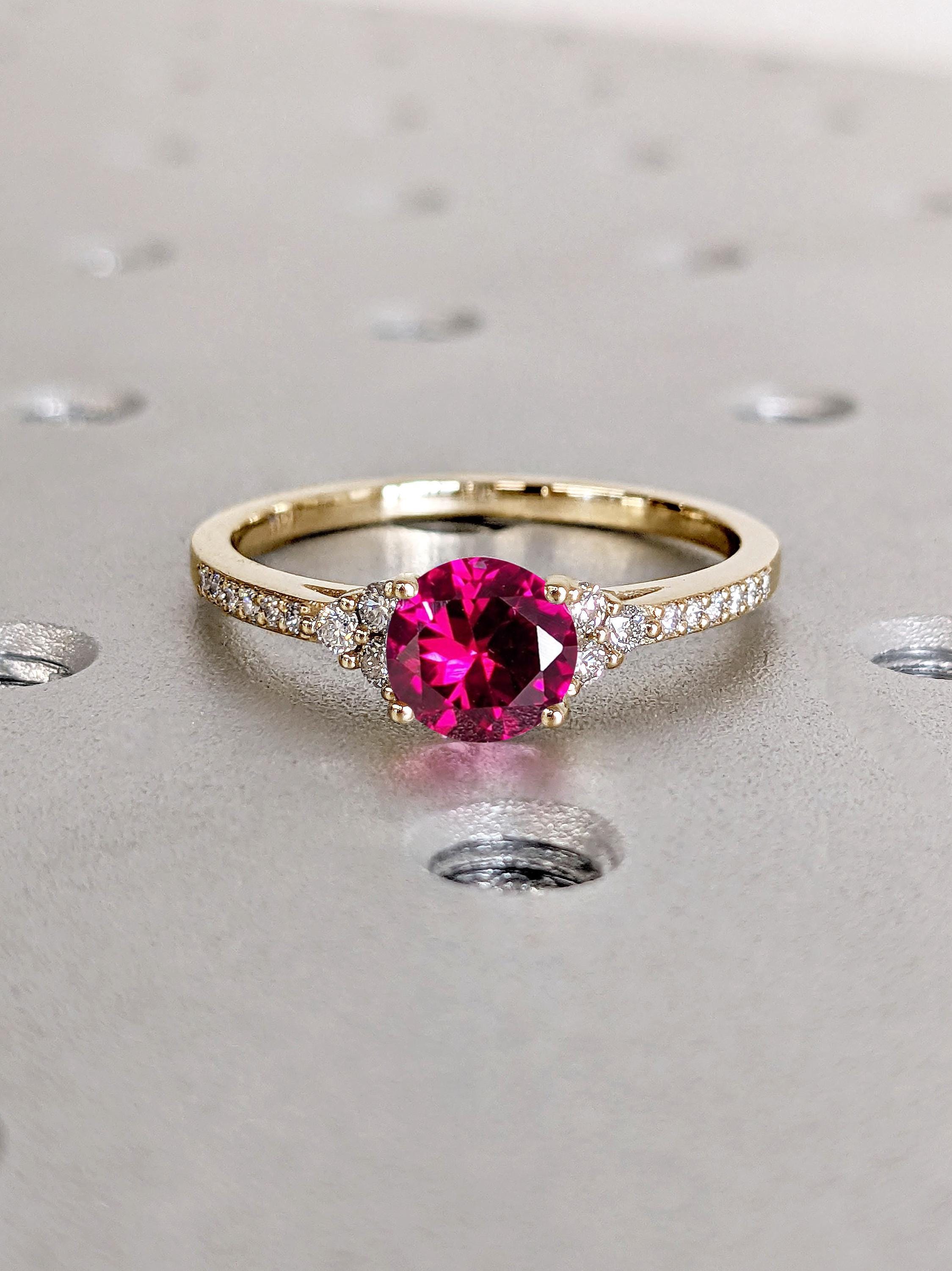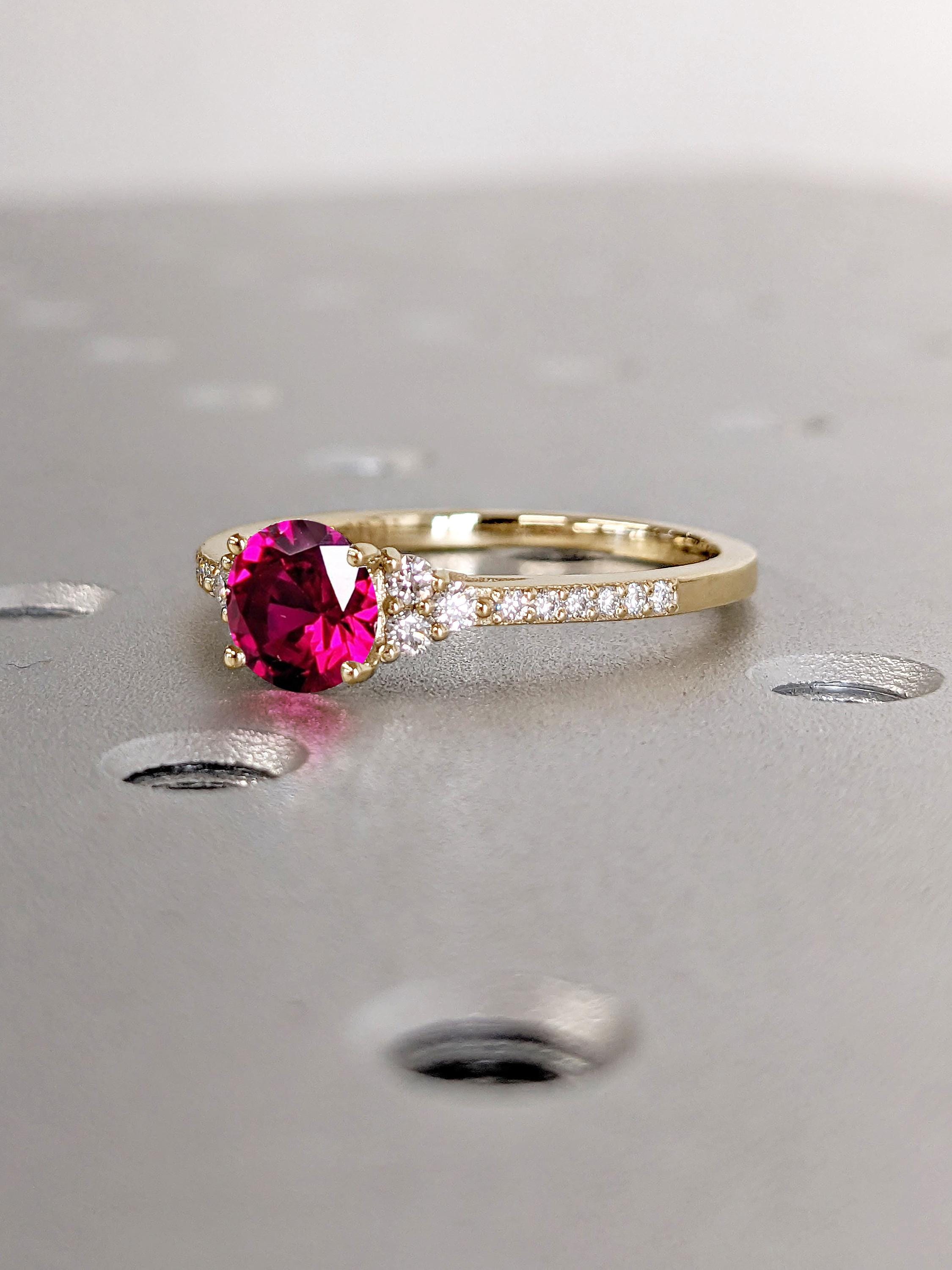 A dazzling handmade ring, featuring a round cut Lab Ruby center, accented by cluster of round cut side stones. Set on a thin band of 1.7mm width paved with tiny round white gemstones of natural diamonds, lab diamonds or moissanites. This luxurious sparkling ring is a wonderful statement piece to be added to your jewelry collections.