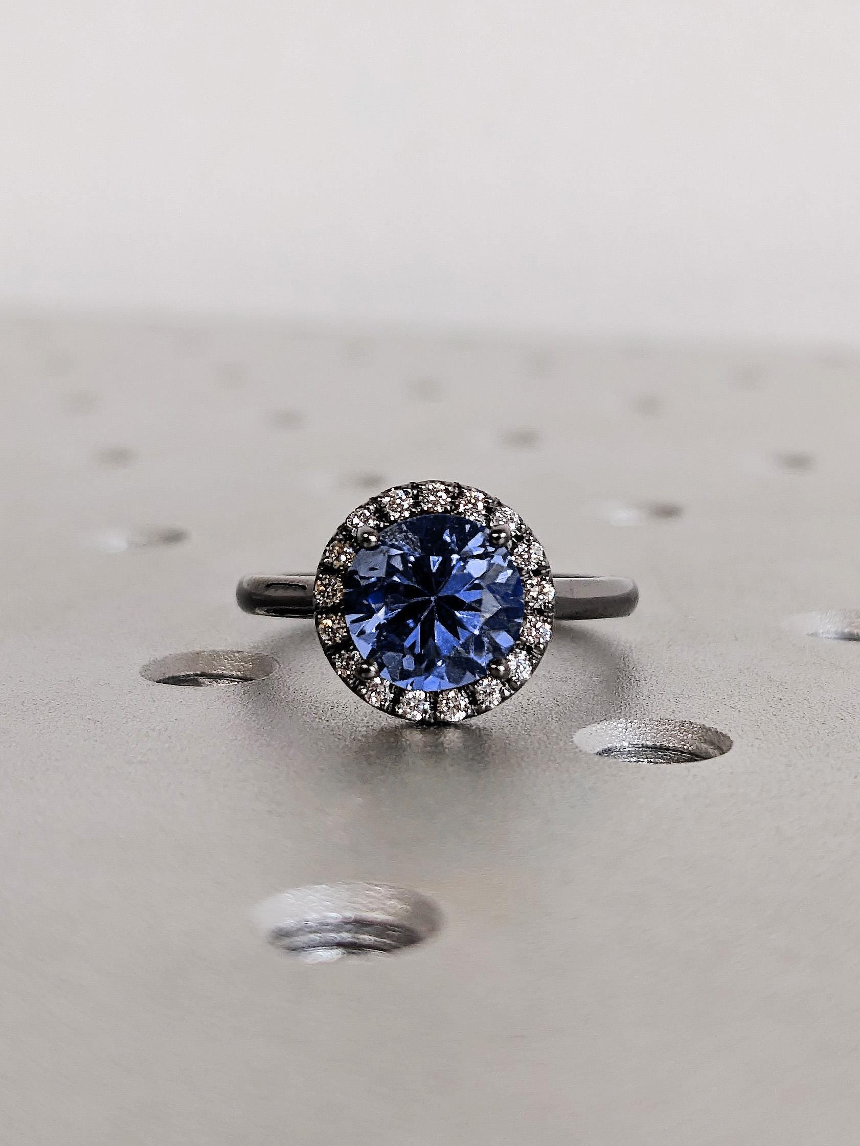 Diamond Halo Sapphire Engagement Ring, Blue Virgo Birthstone Women’s Black Gold Wedding Band