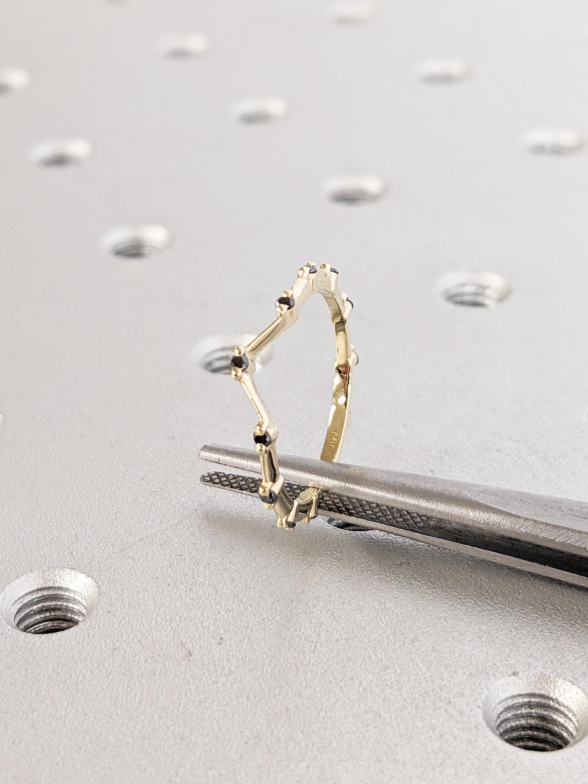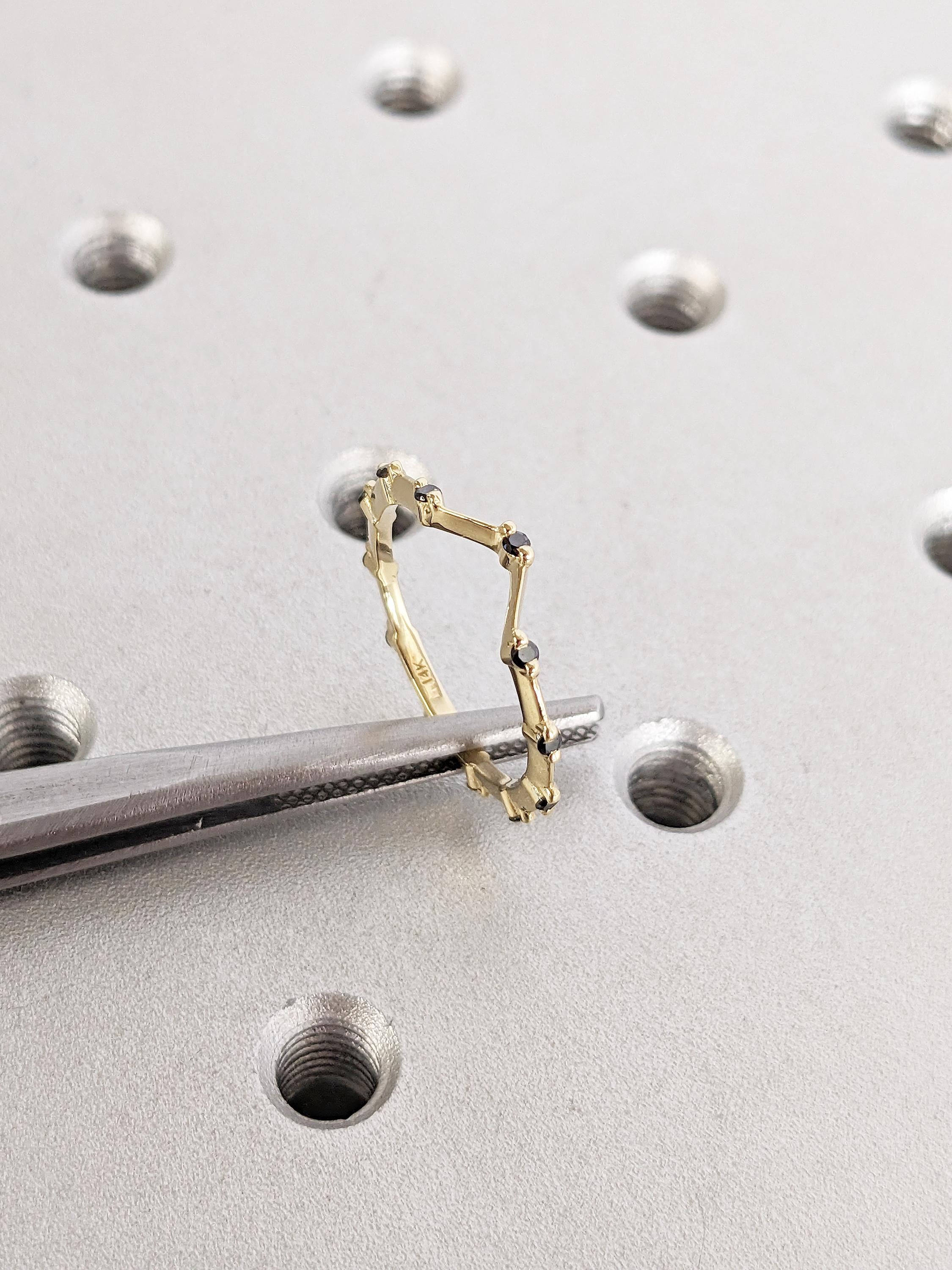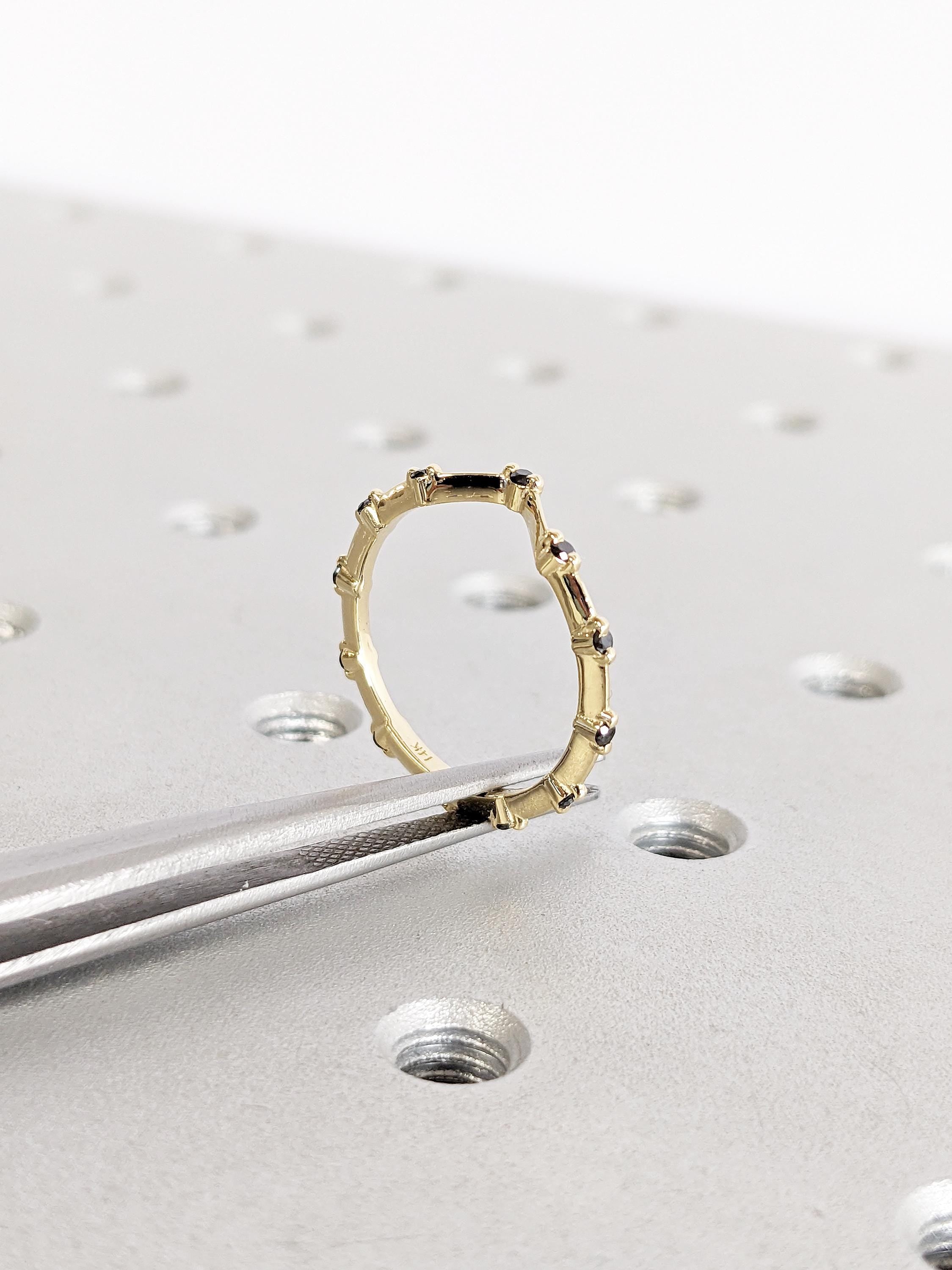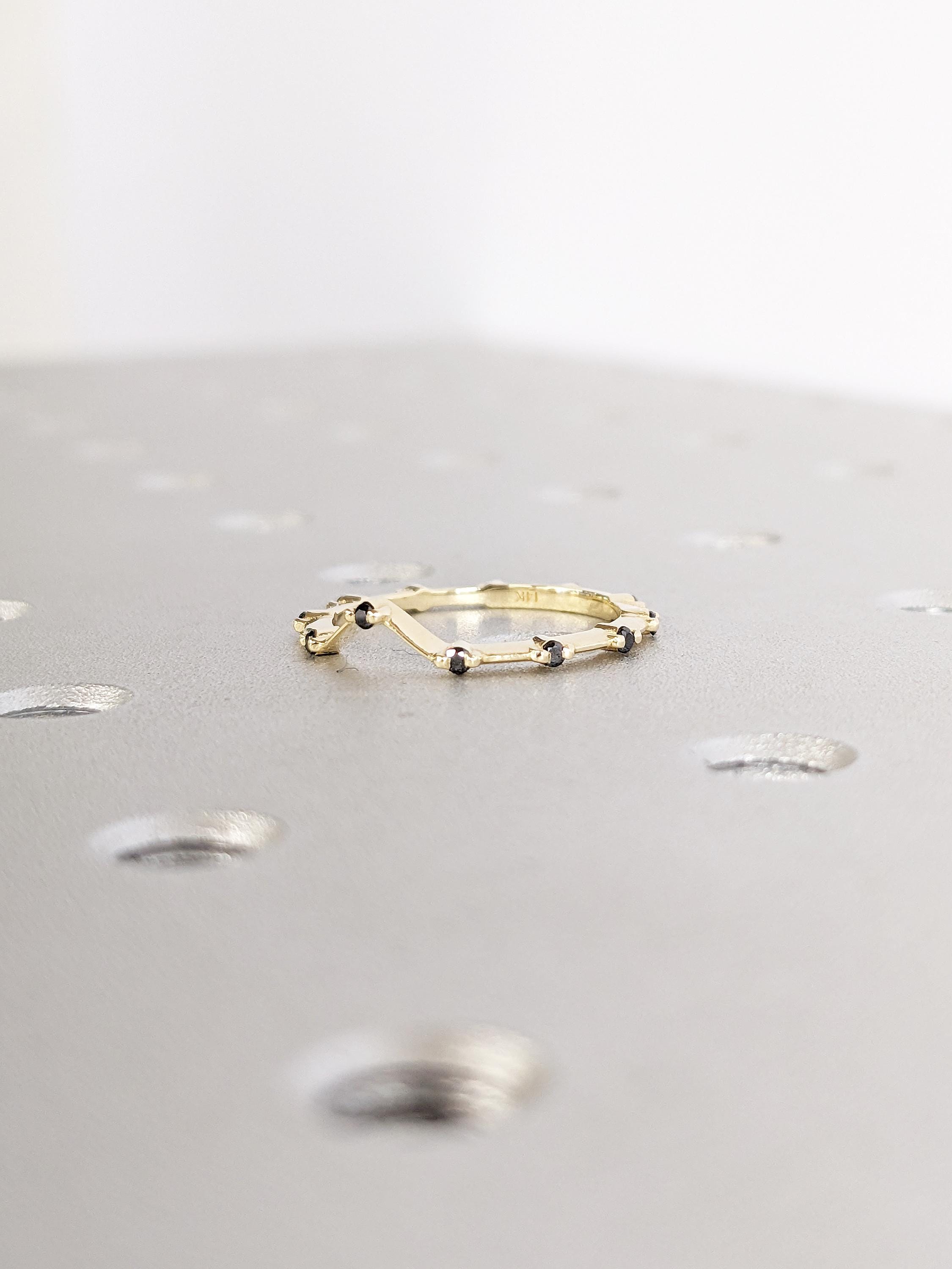 Discover the beauty of our delicate, thin curved band, featuring a captivating row of Black Diamonds along the band. Its elegant design is sure to dazzle, making it perfect for any occasion.