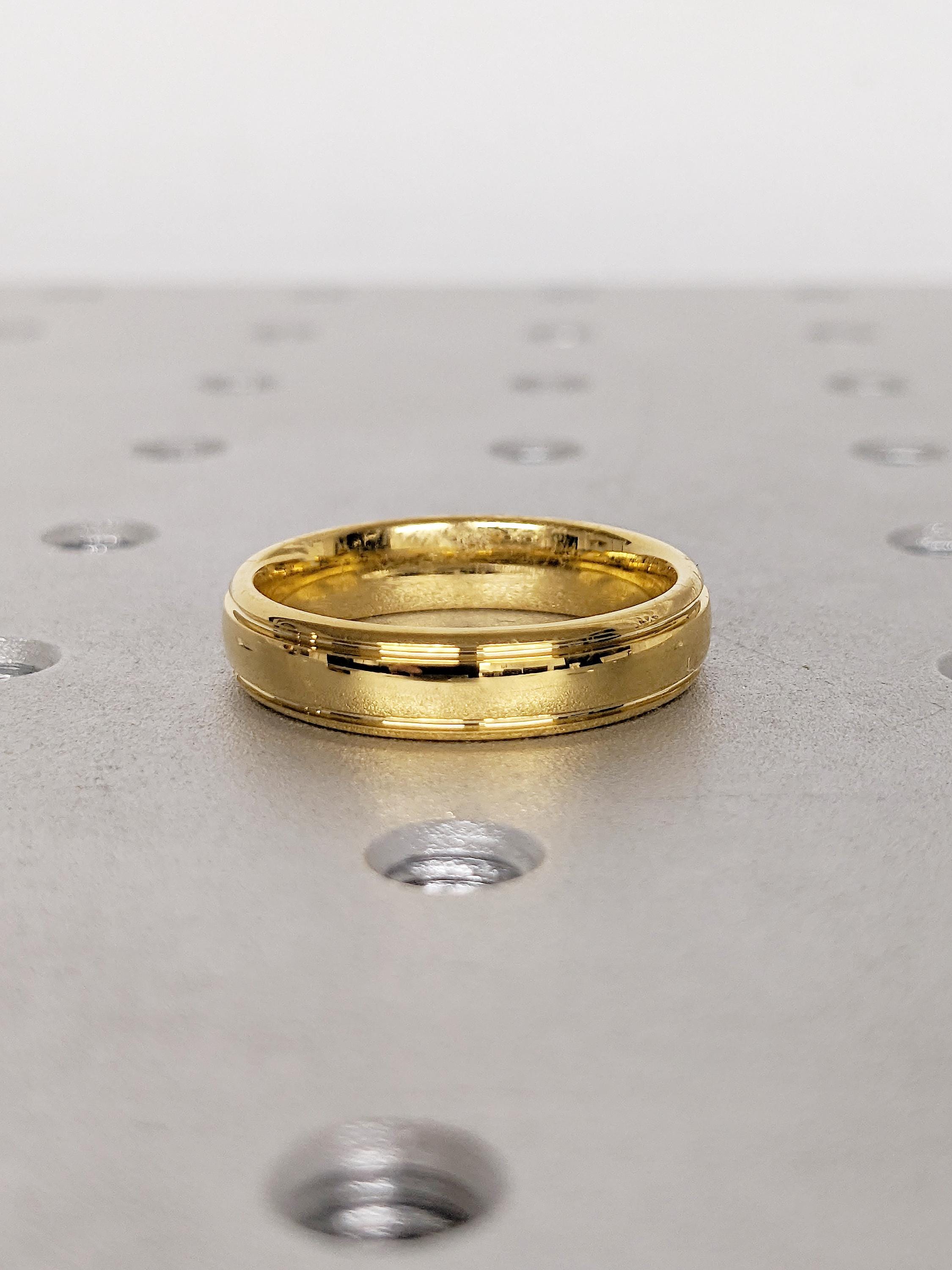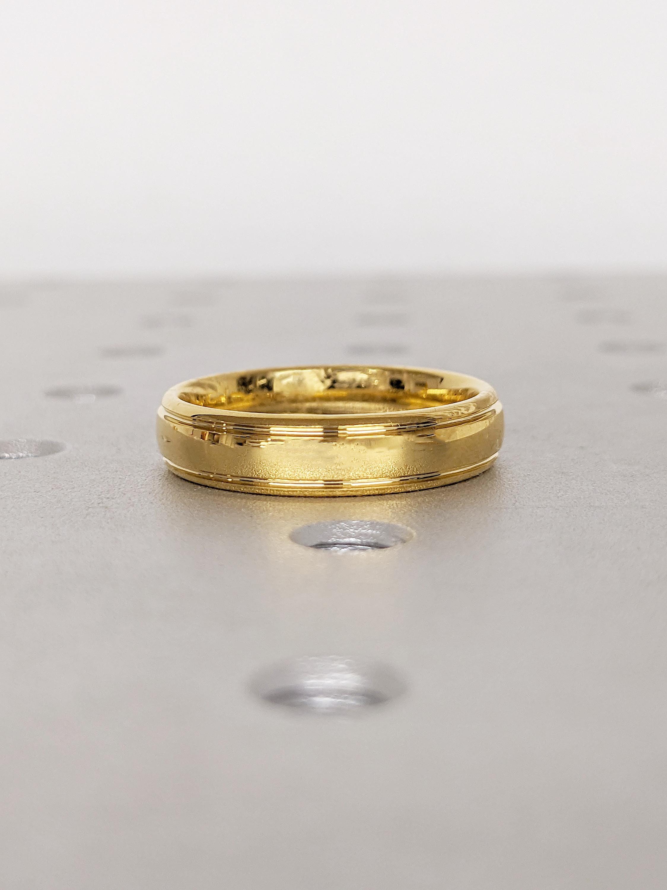 This 5mm dome wedding band is crafted from durable tungsten and finished with a polished yellow gold plating. Its subtle texture and classic dome profile offer a refined, modern look that is perfect for everyday wear and special occasions.