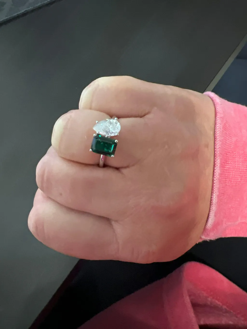 A beautiful dual emerald and pear shaped moissanite, set with a super delicate and thin setting the unique and delicate
