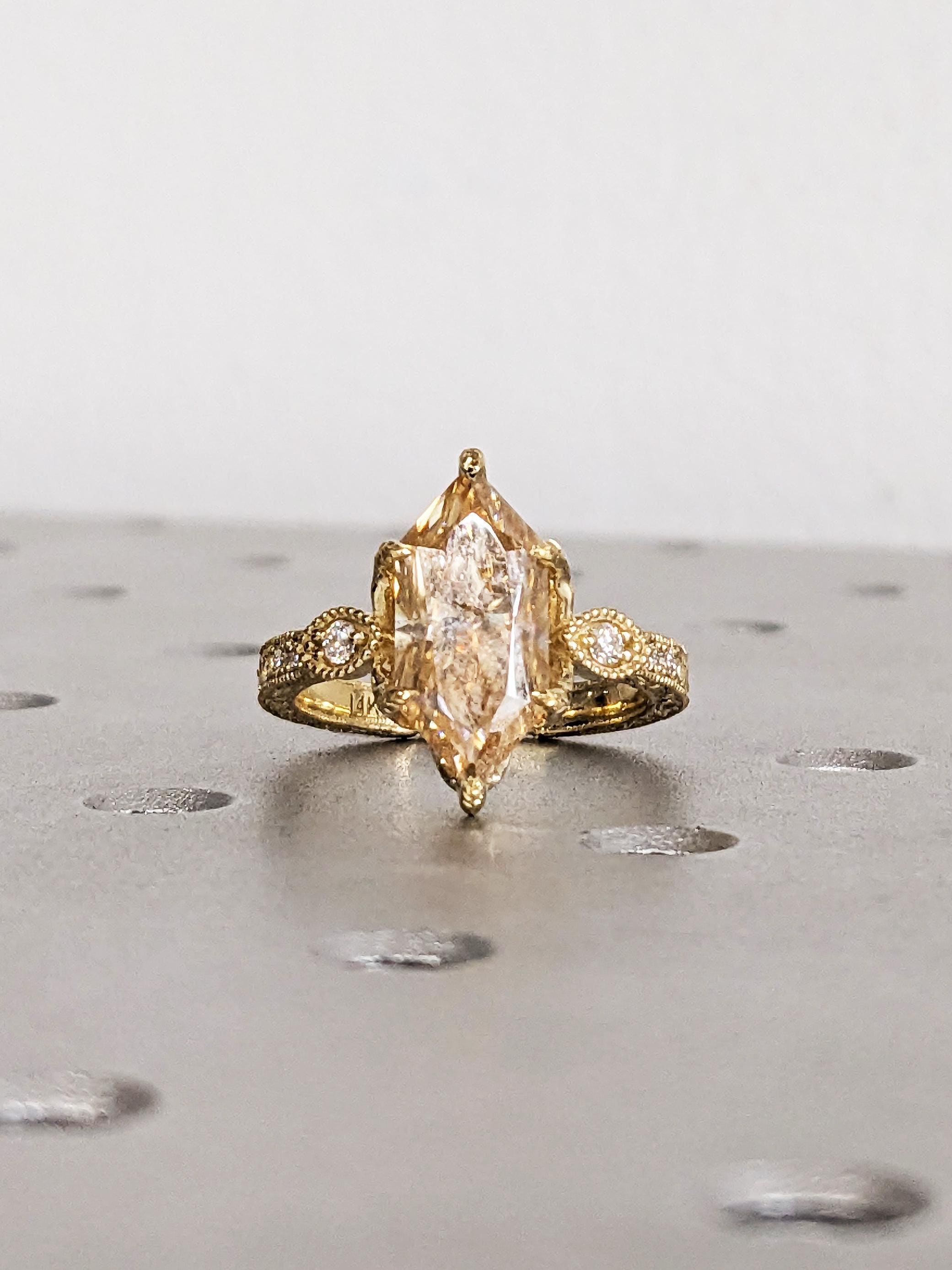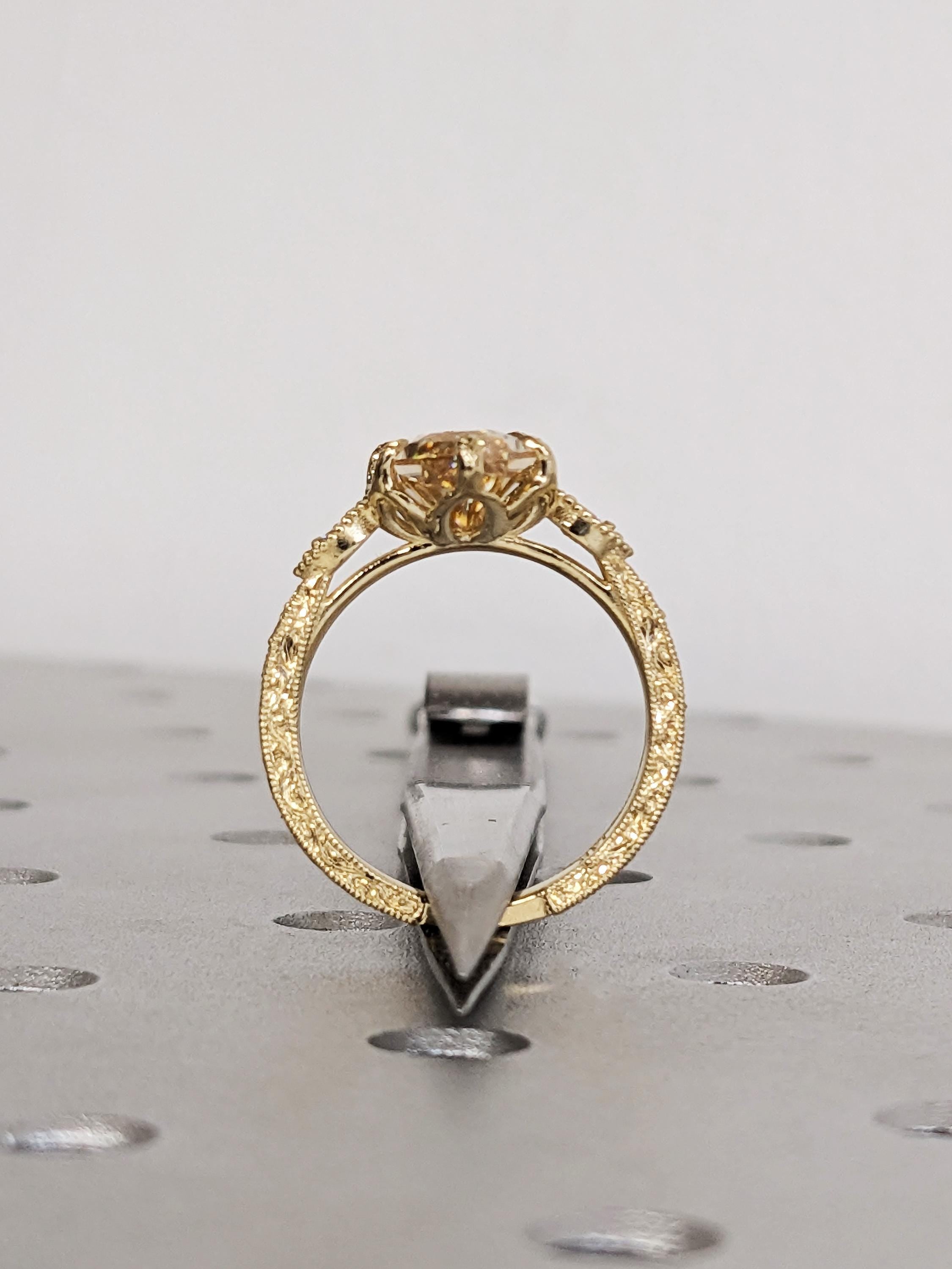 This vintage engagement ring showcases a Dutch marquise cut Moissanite held in an elegant, lifted cathedral design with a refined yet delicate tulip prong setting. The filigree details enhance the structure, adding depth, charm and old world romance.