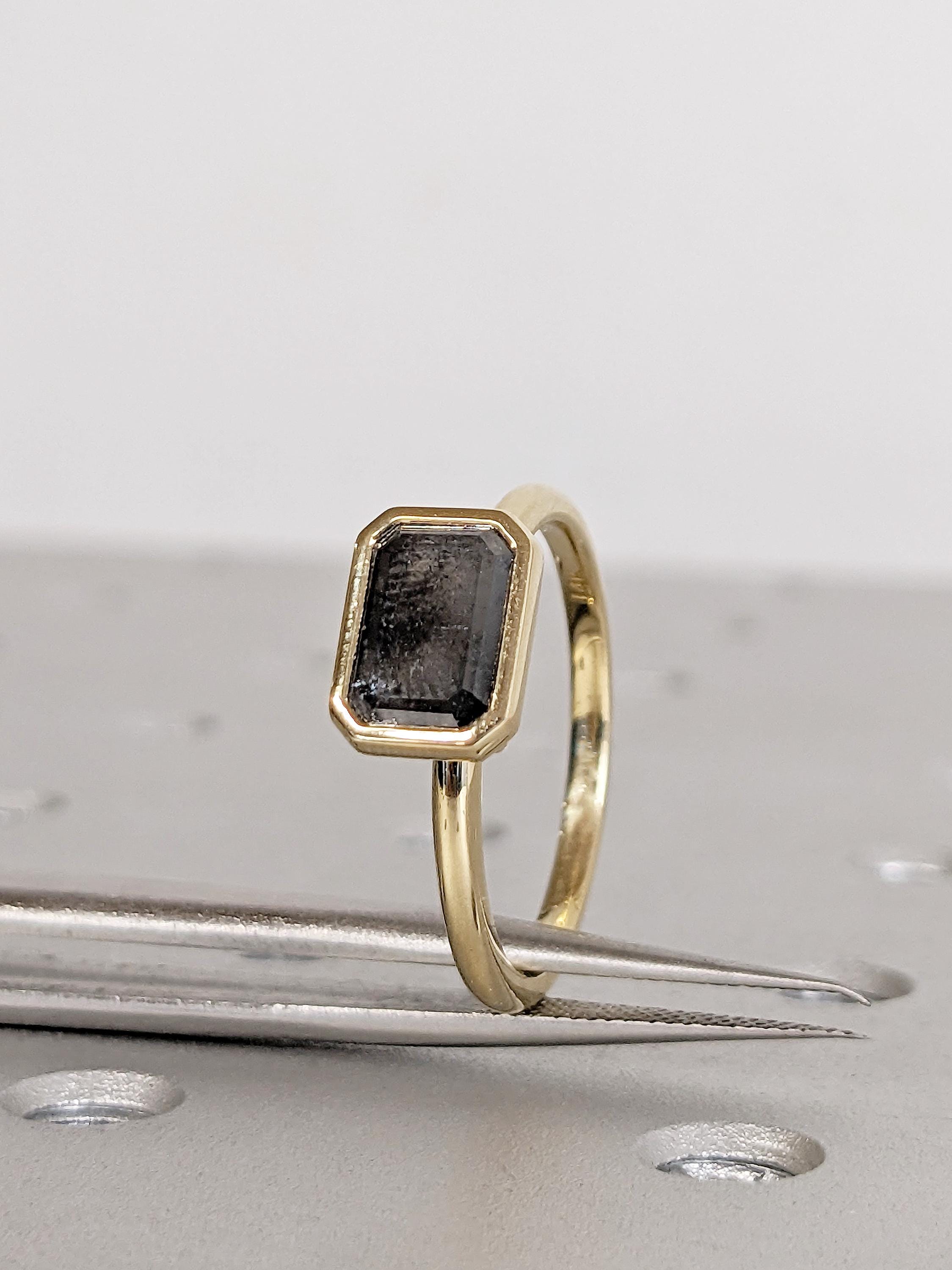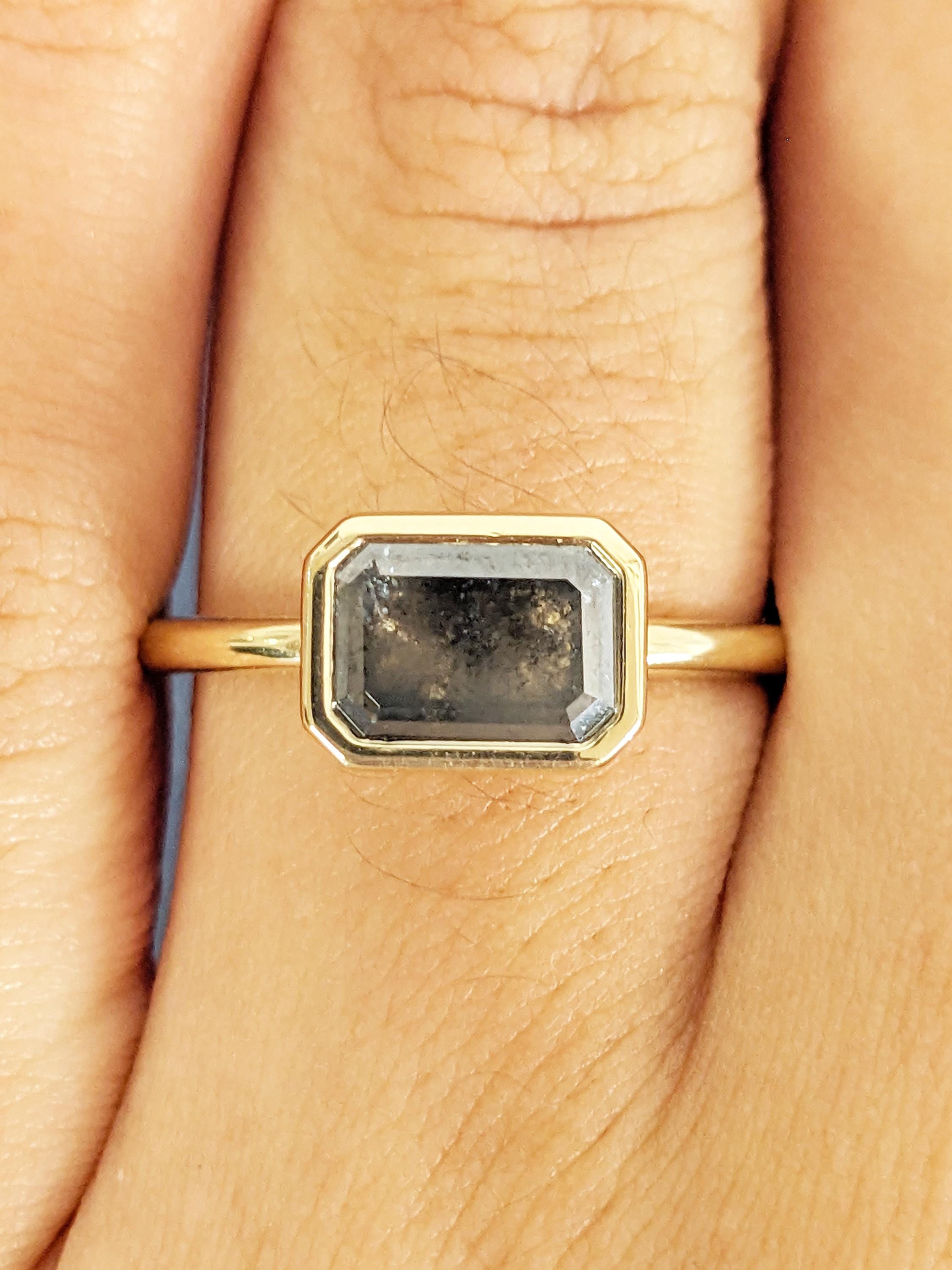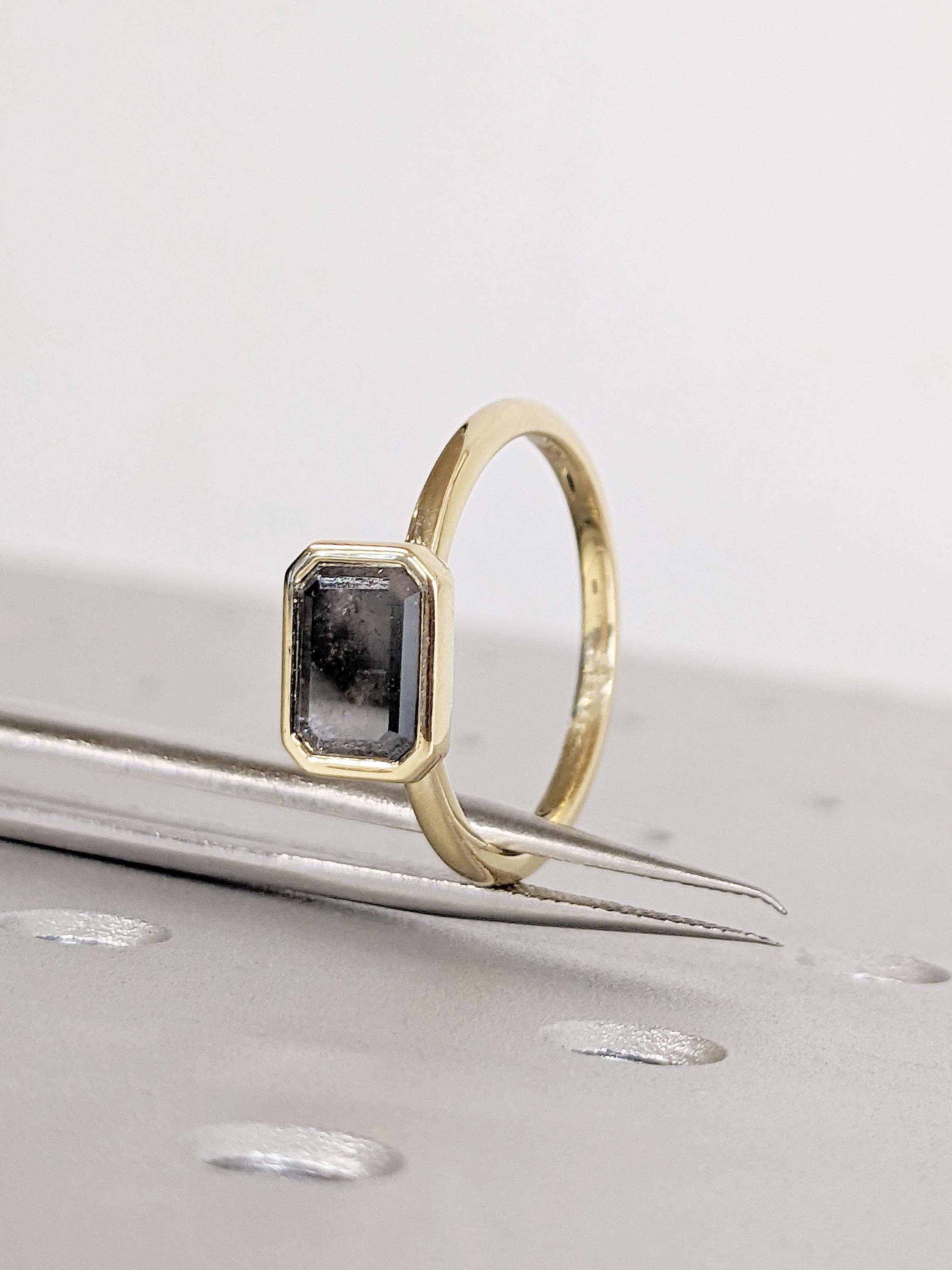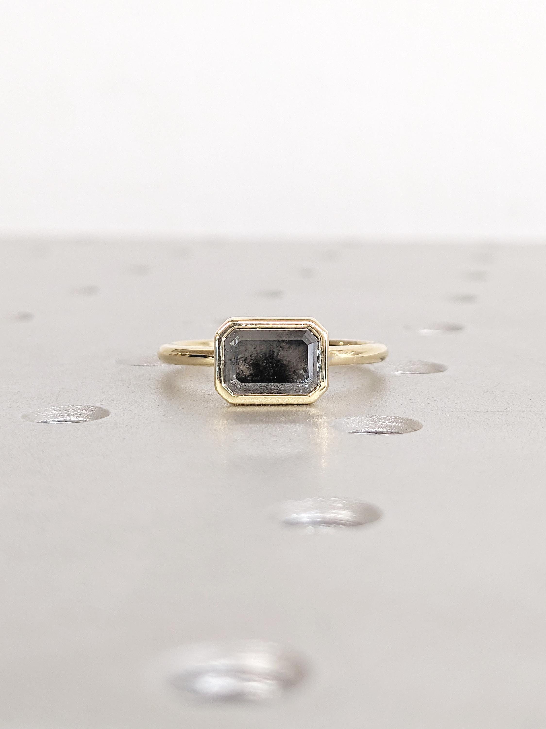East West Bezel Ring, Emerald Cut Salt and Pepper Diamond Engagement Ring, 14k Yellow Gold Solitaire Rings, Dainty Promise Ring for Her