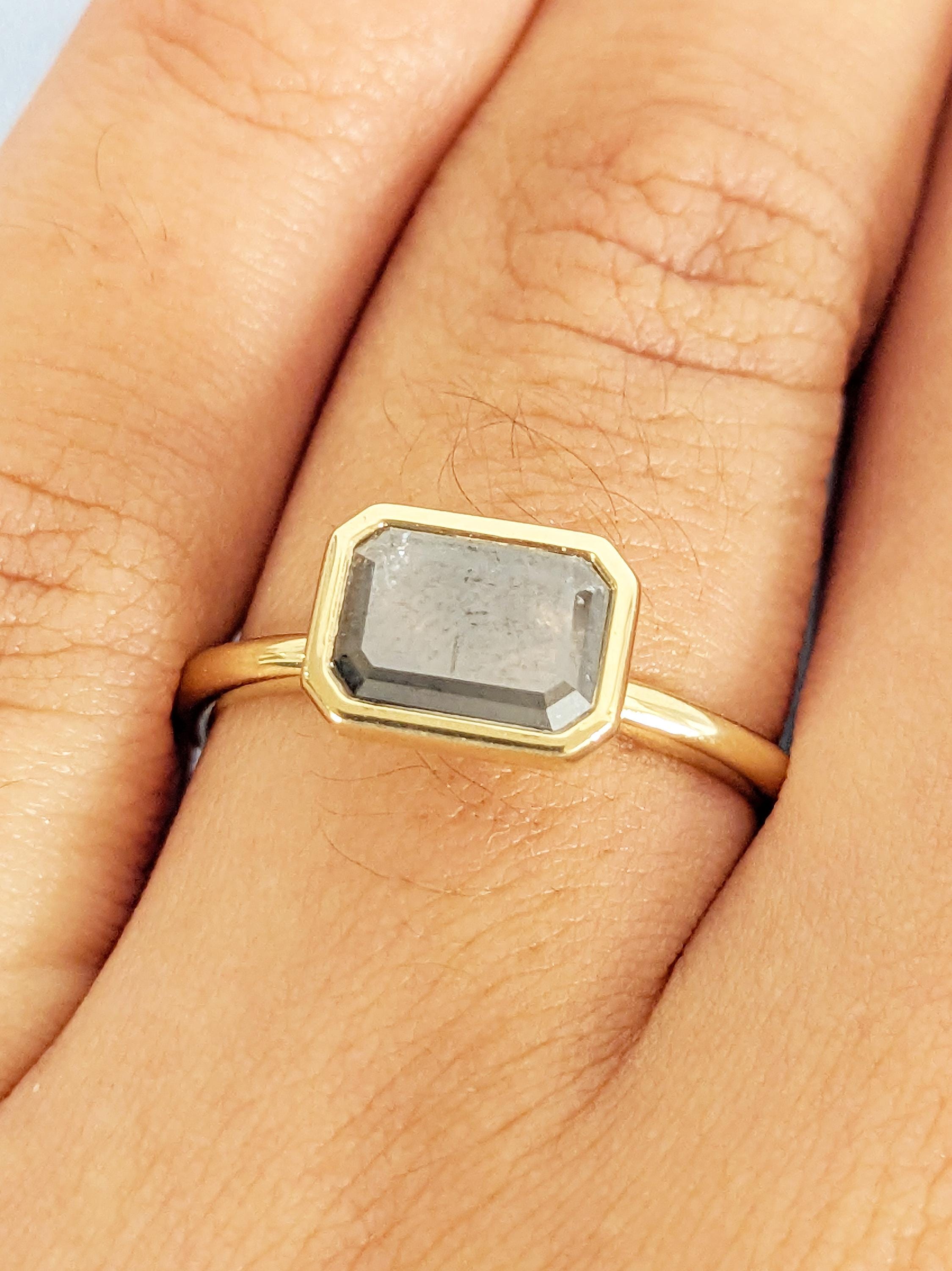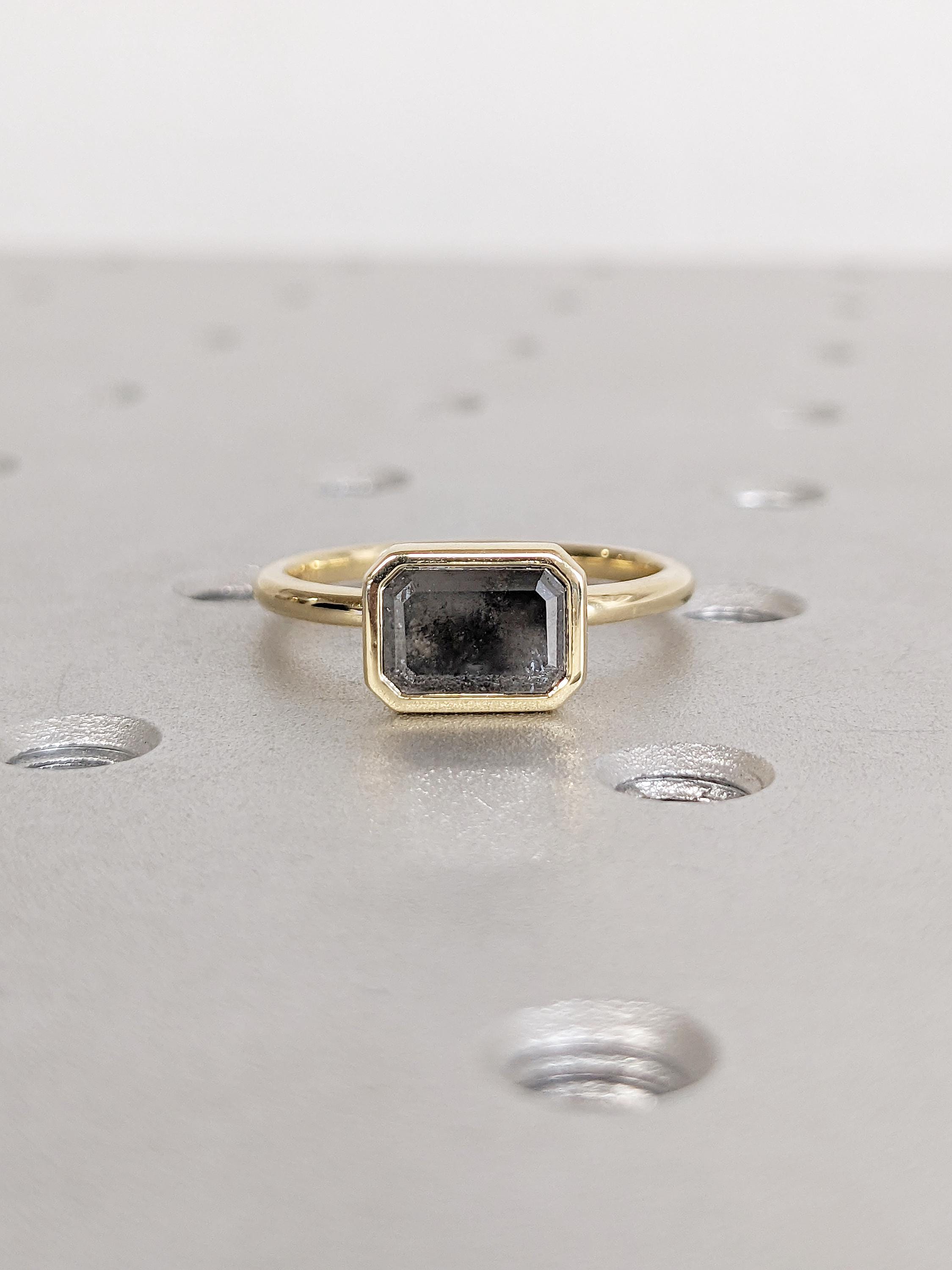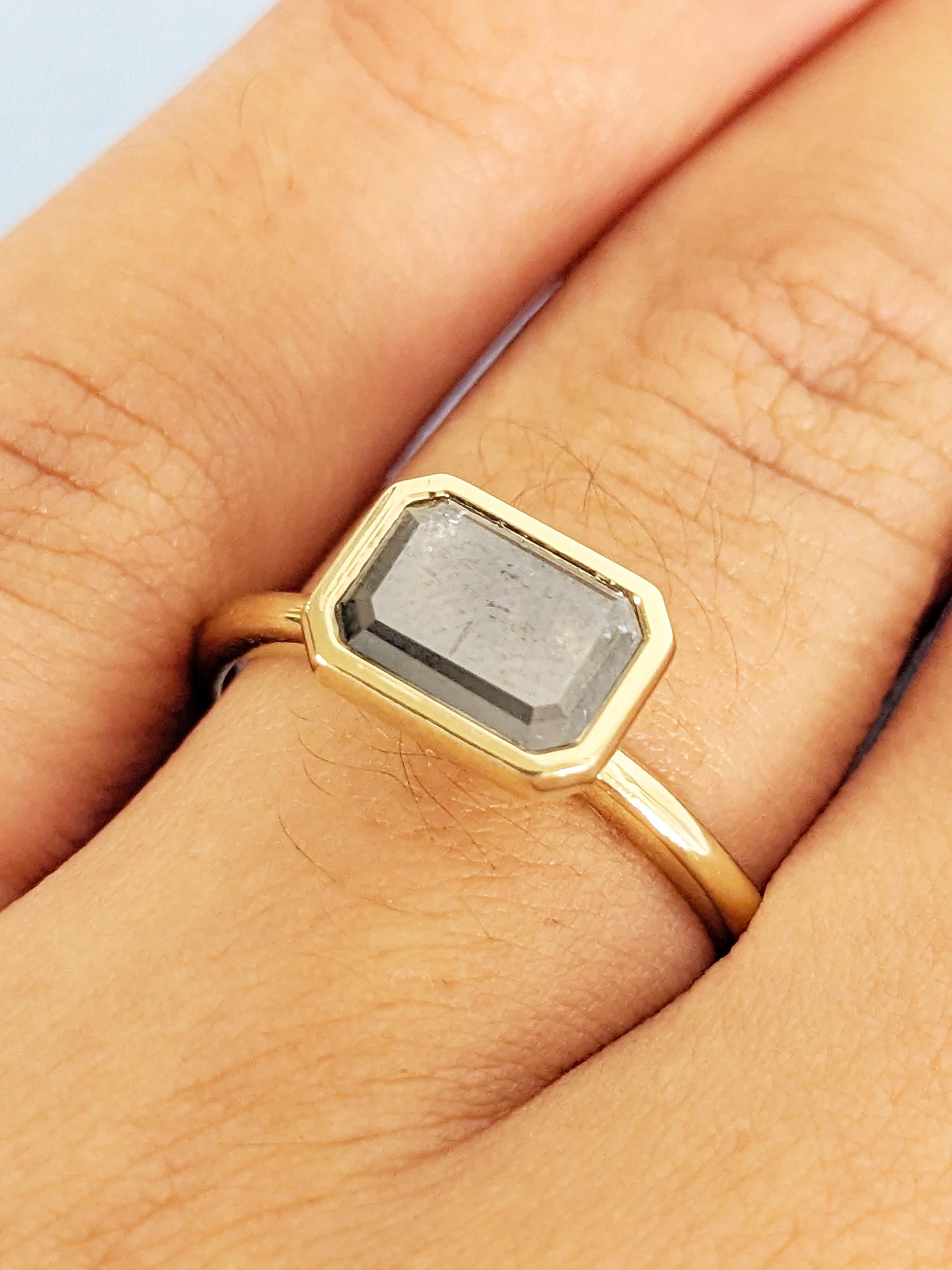 East West Bezel Ring, Emerald Cut Salt and Pepper Diamond Engagement Ring, 14k Yellow Gold Solitaire Rings, Dainty Promise Ring for Her