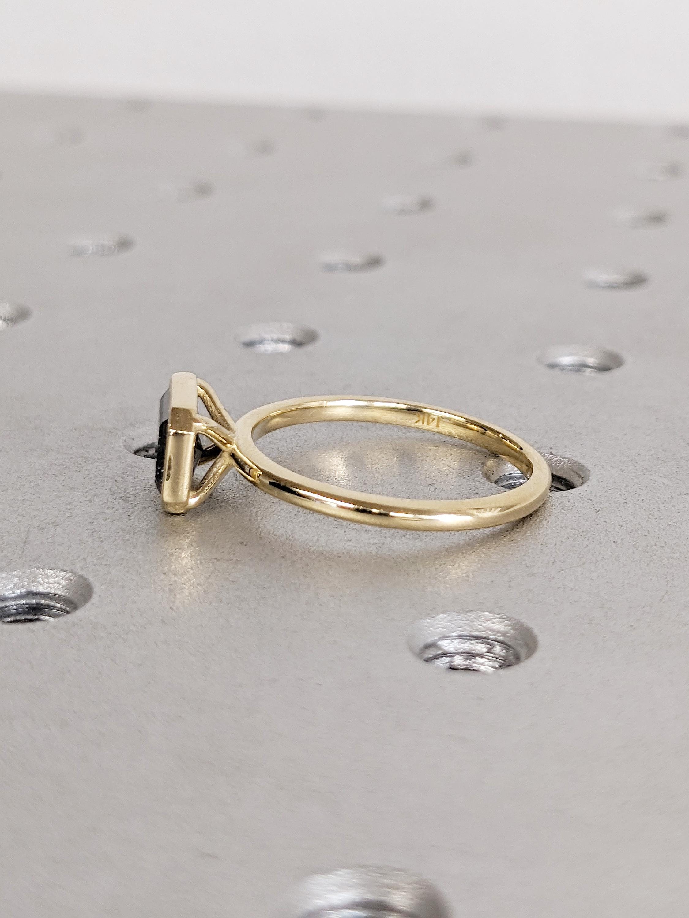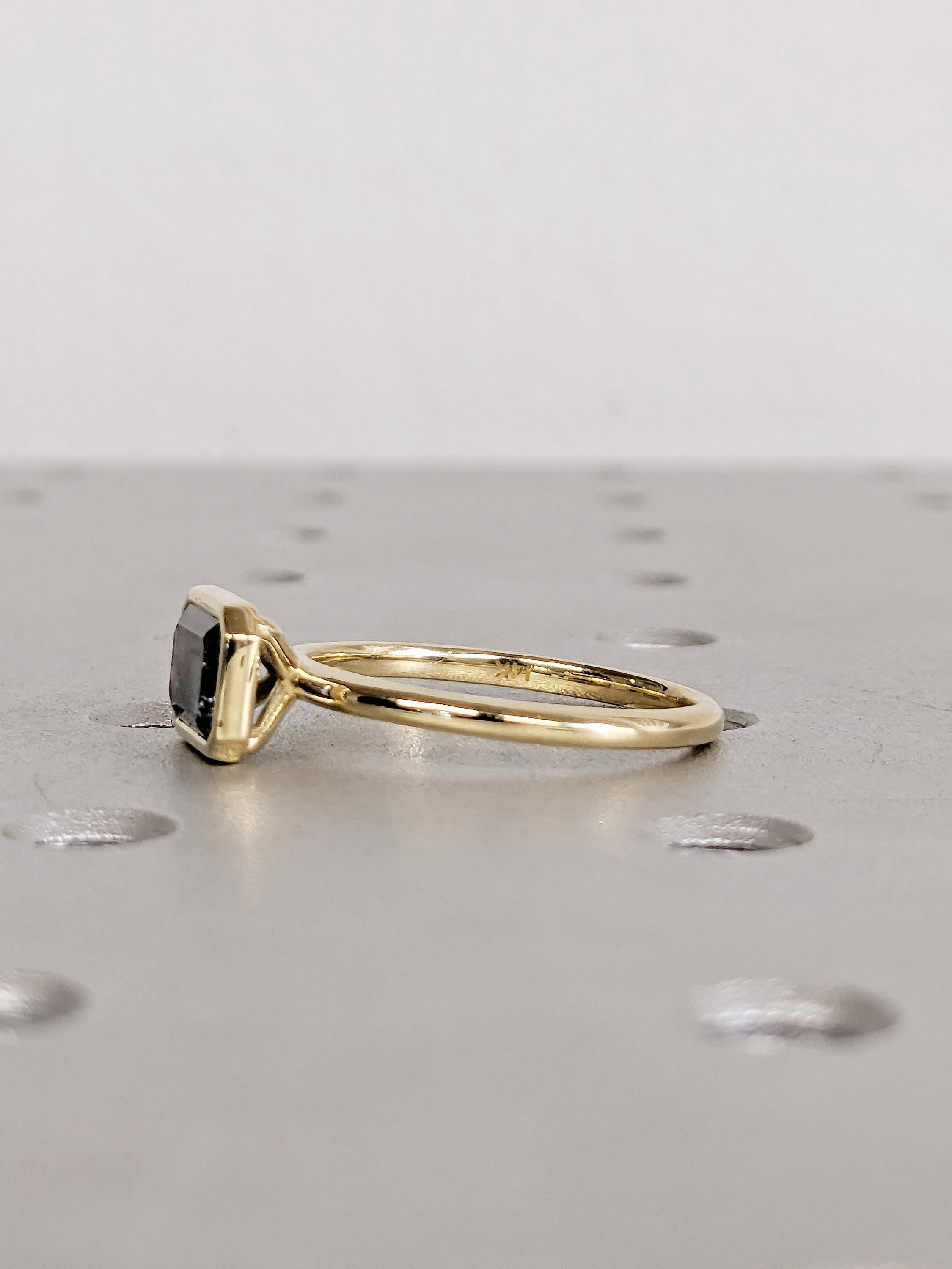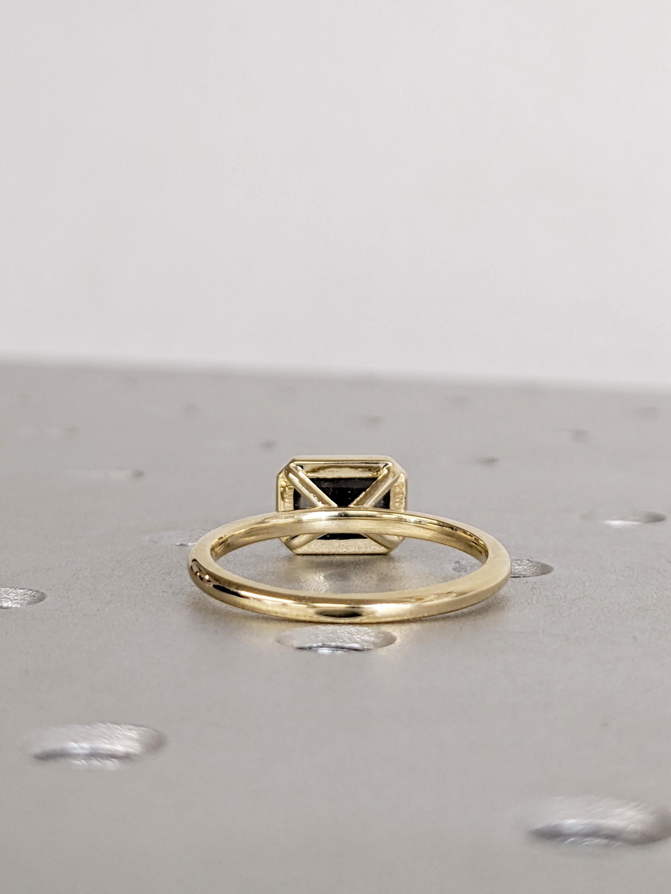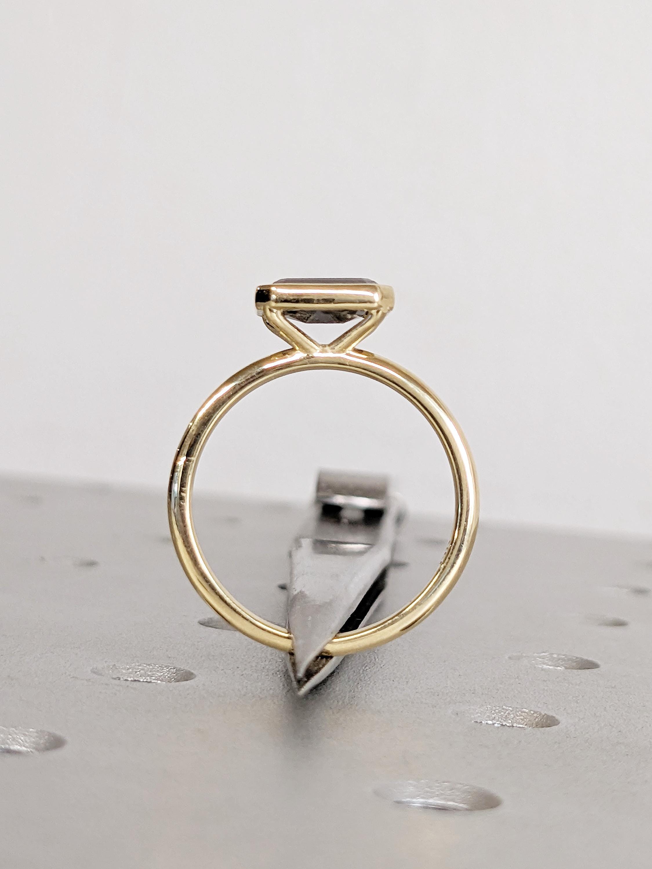 East West Bezel Ring, Emerald Cut Salt and Pepper Diamond Engagement Ring, 14k Yellow Gold Solitaire Rings, Dainty Promise Ring for Her