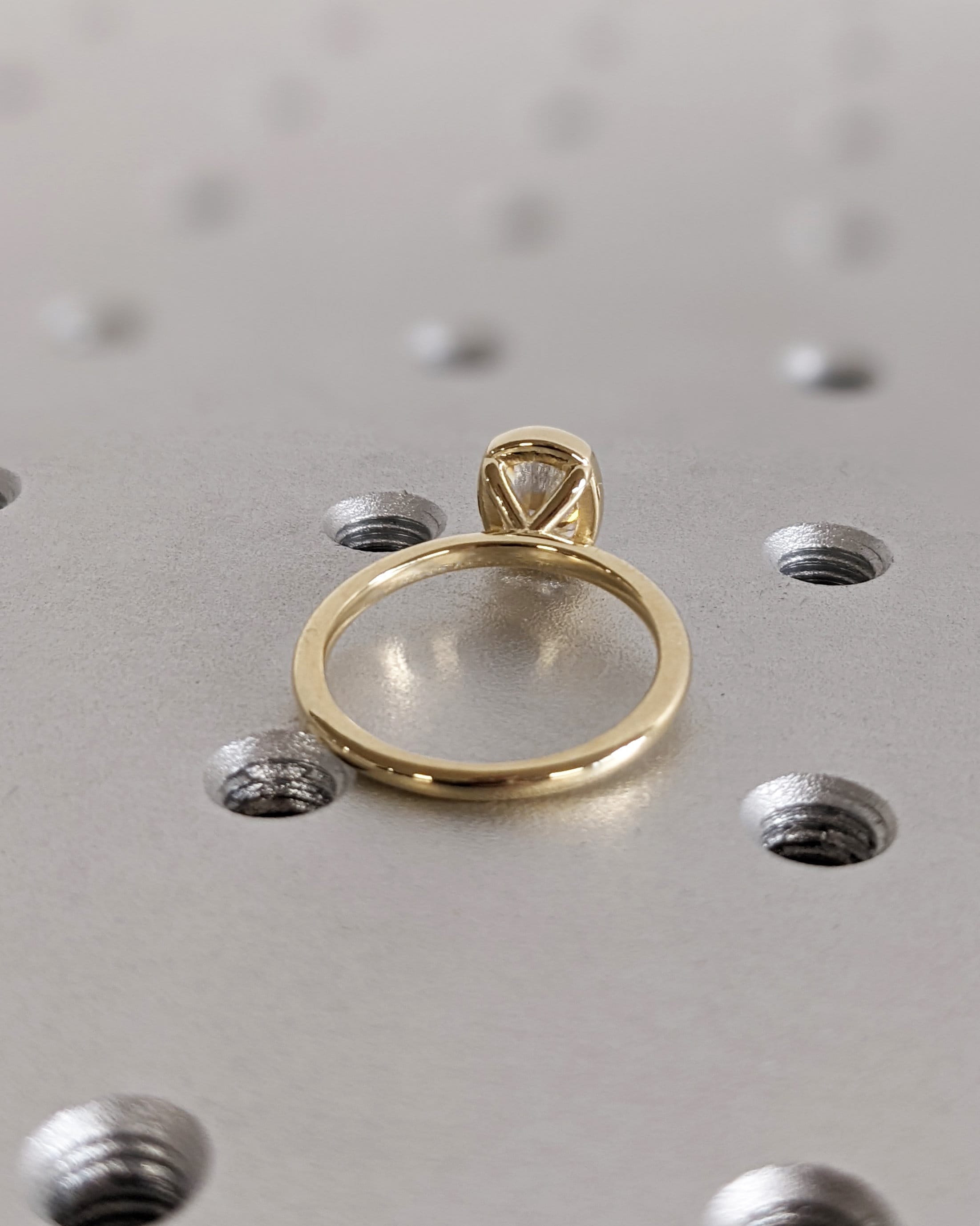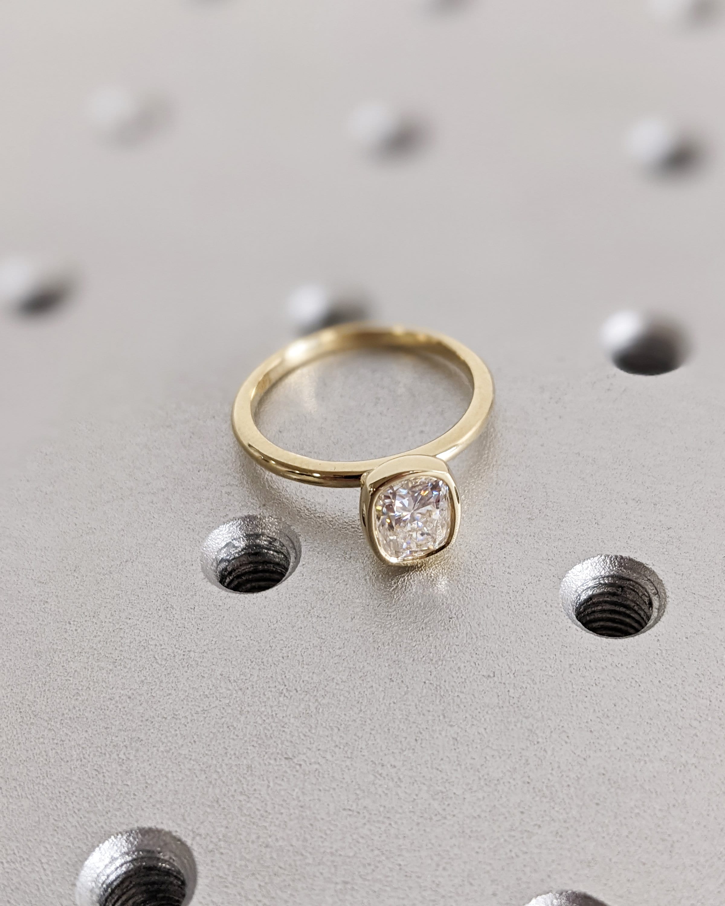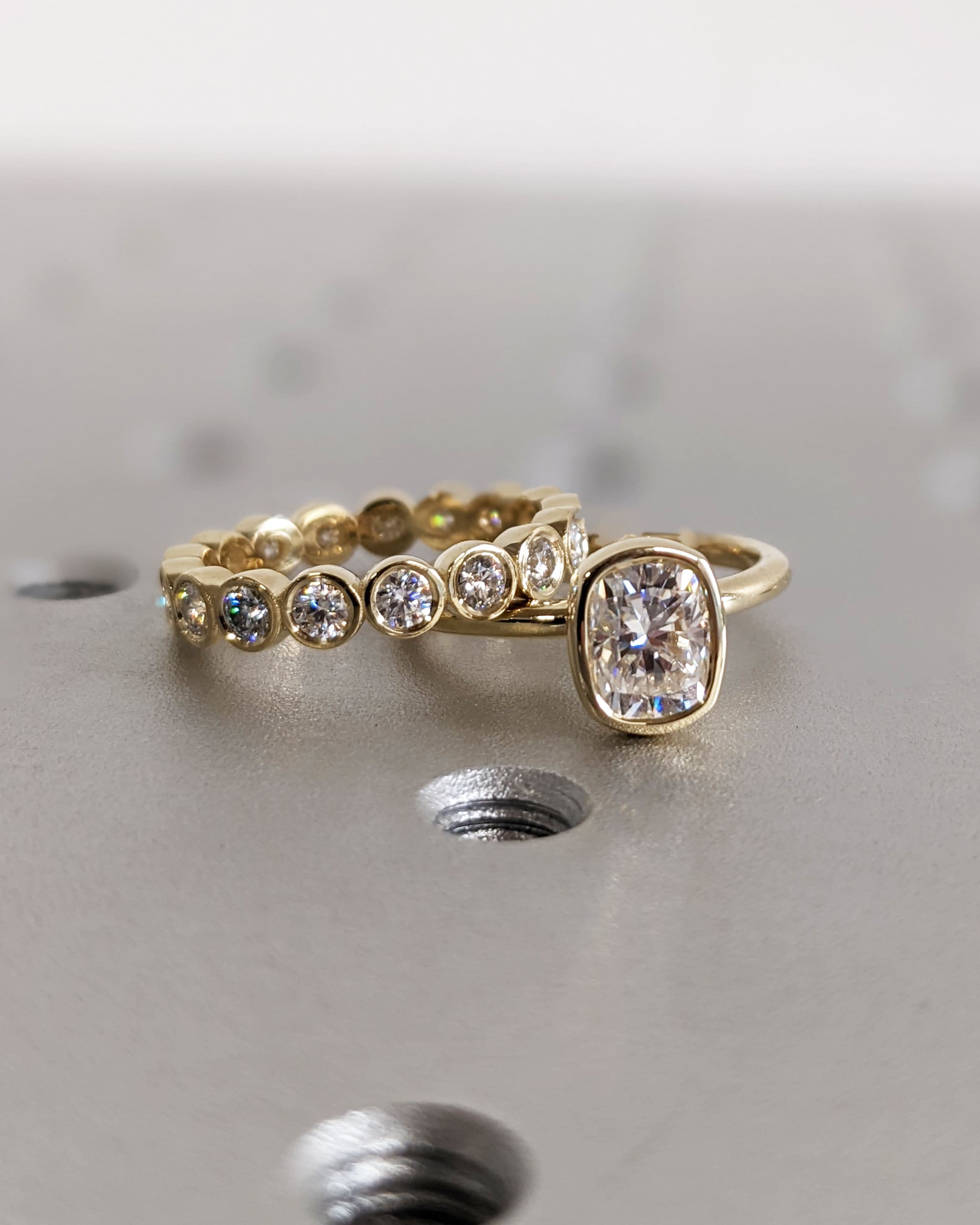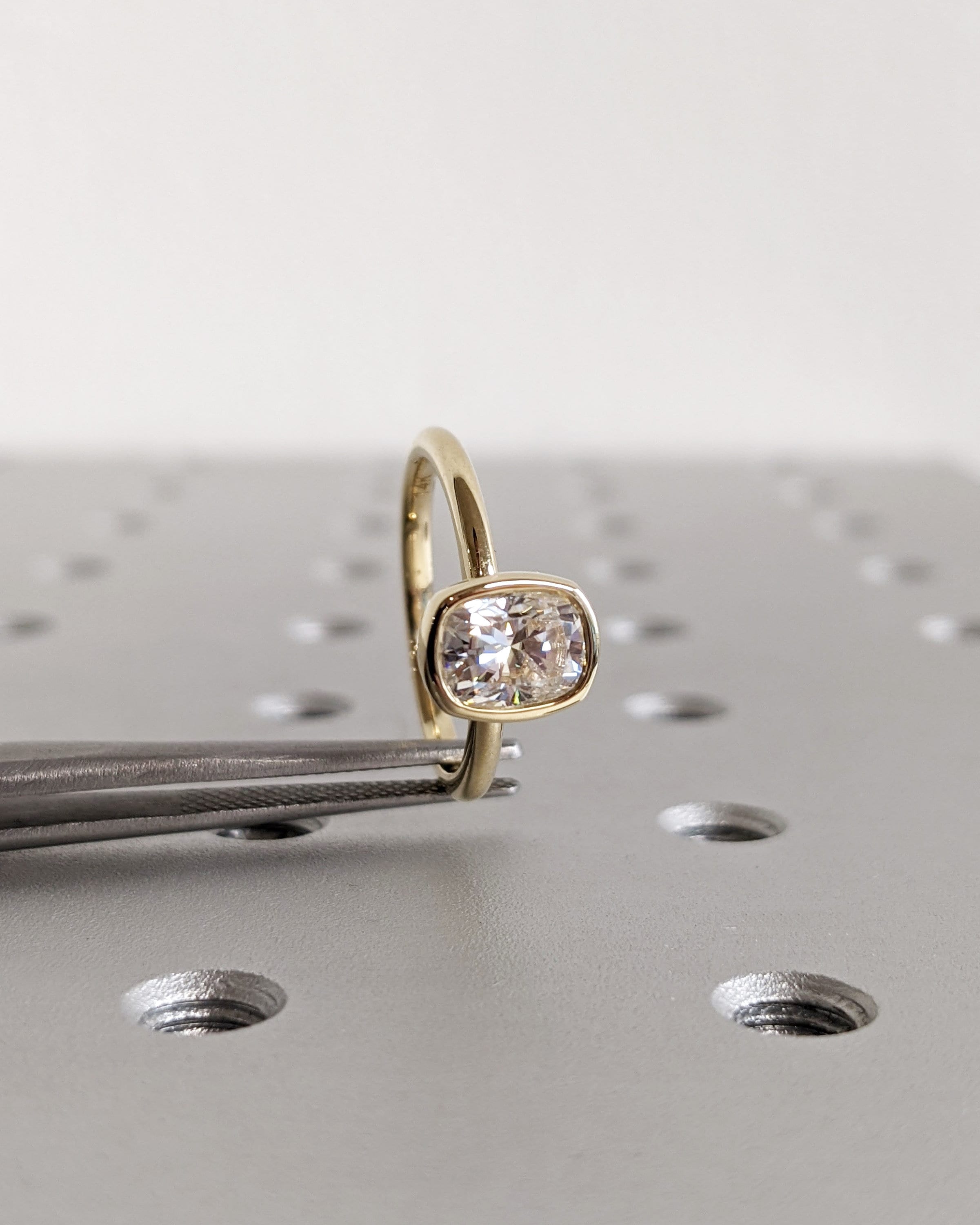 Elevate your style with this exquisite engagement ring showcasing an elongated cushion cut in a stunning bezel setting, resting gracefully on a slender rounded band. Complete your look by pairing it with a matching full eternity moissanite band.