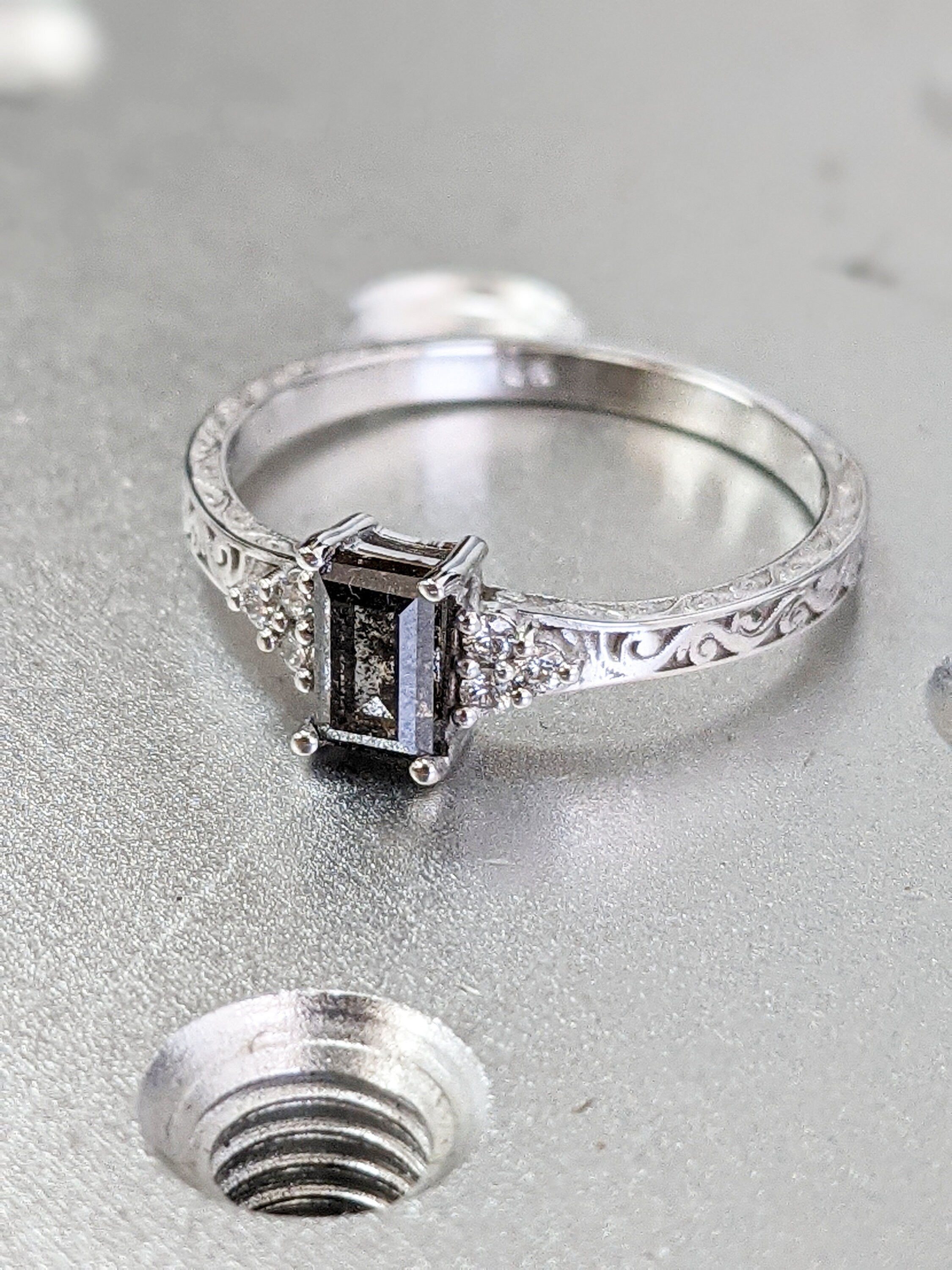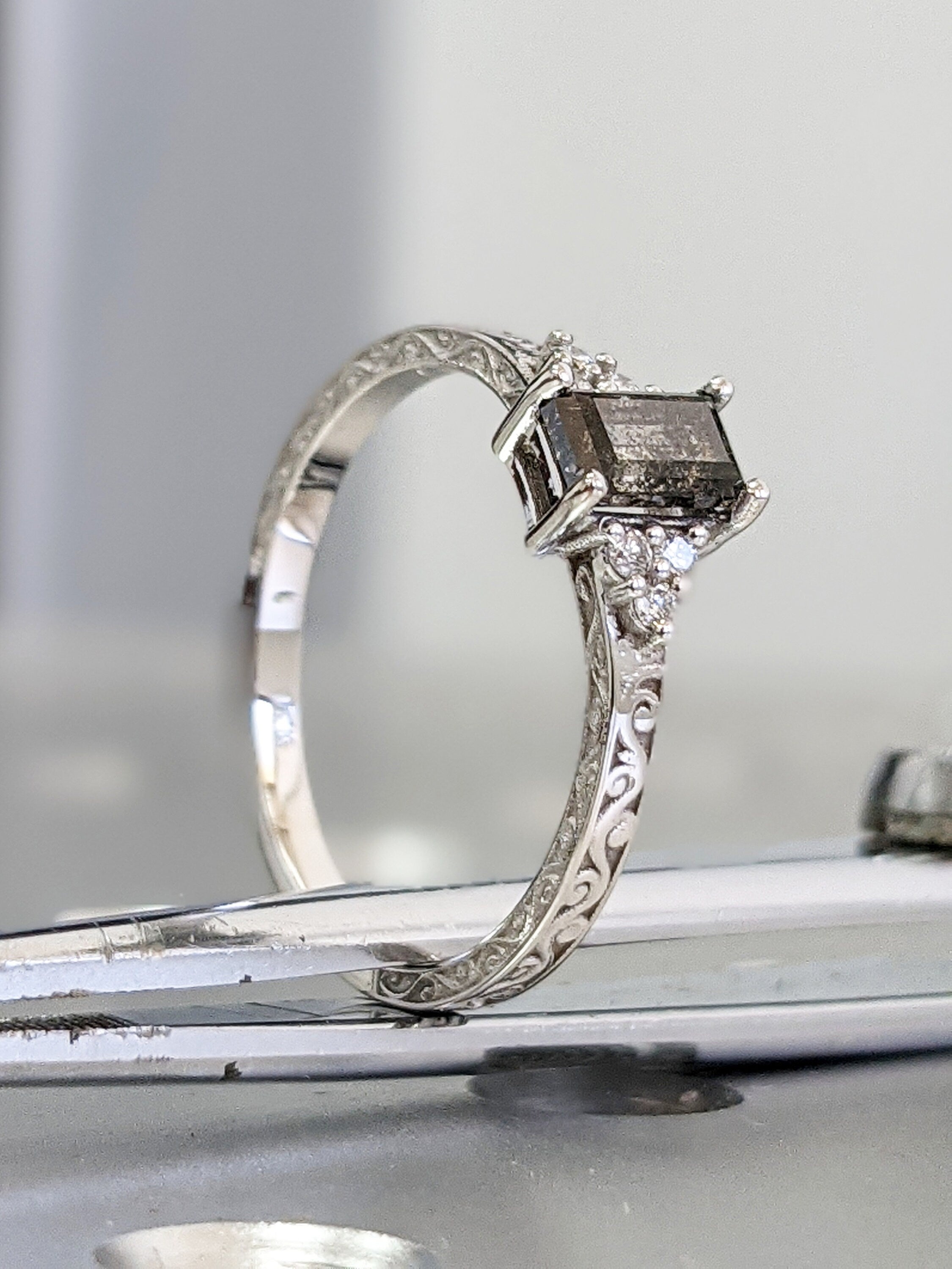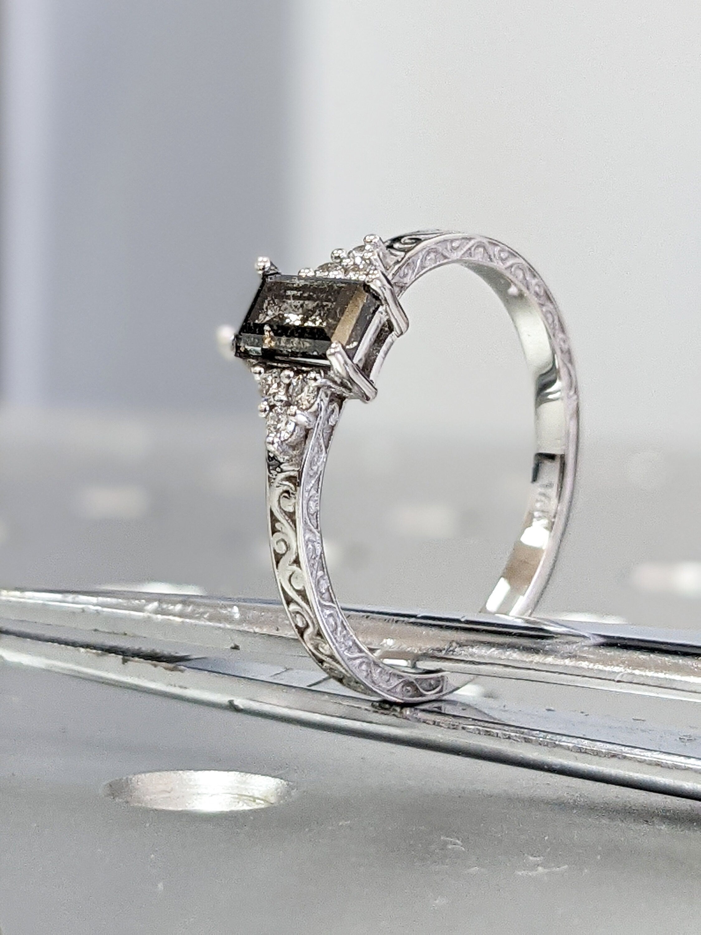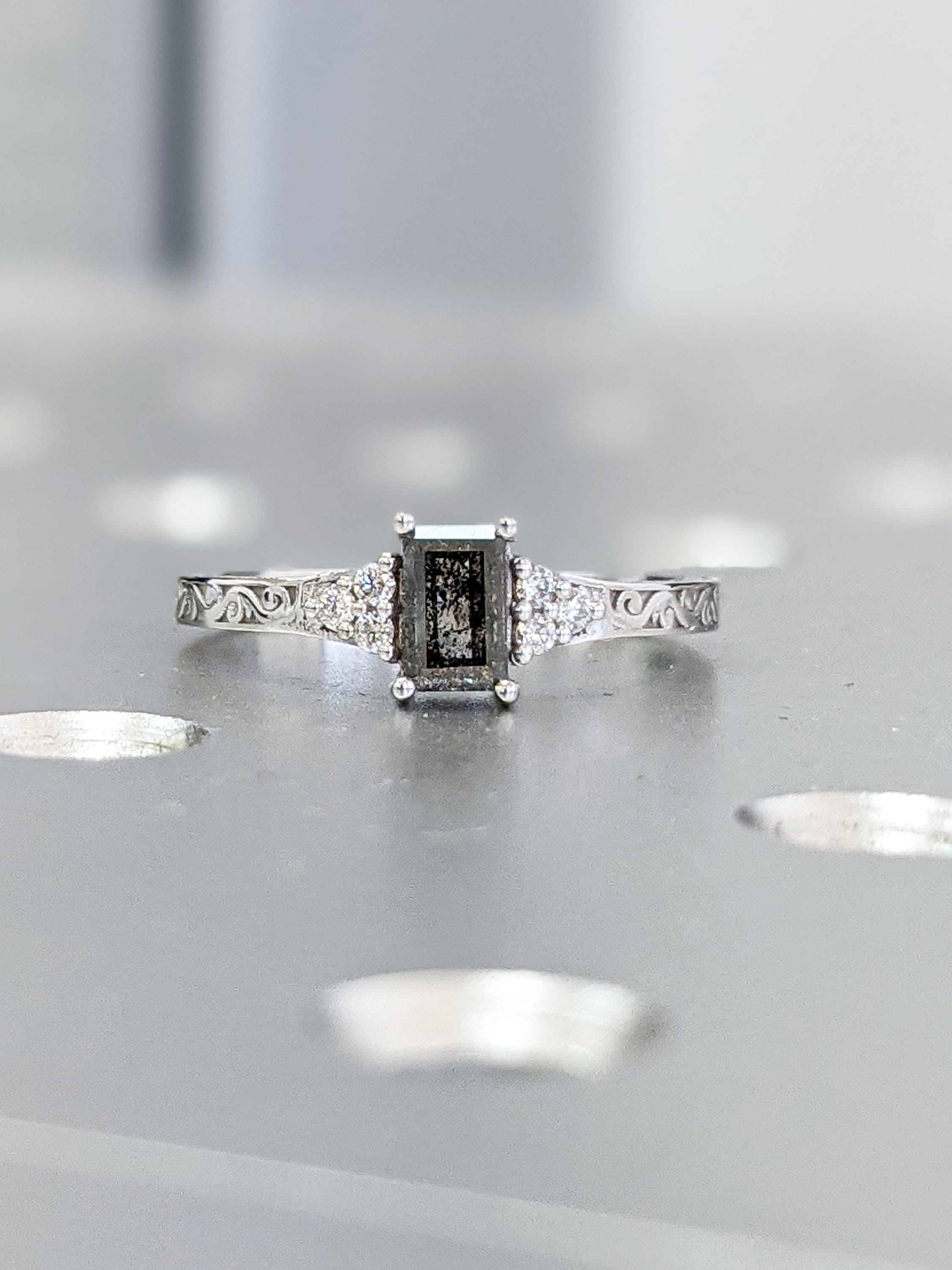 This hand made ring is crafted of the finest quality 14k gold. This antique-inspired engagement ring features a cluster of 6 round brilliant cut diamonds, with brilliant sparkle and luster, accompany the center salt and pepper diamond, with a baguette/emerald cut, that gives a strong presence of vintage scent. This beautiful ring is made to order from hand selected and cut diamonds, held on a square-shaped band, adorned with undulating wave filigree and edged with milgrain.