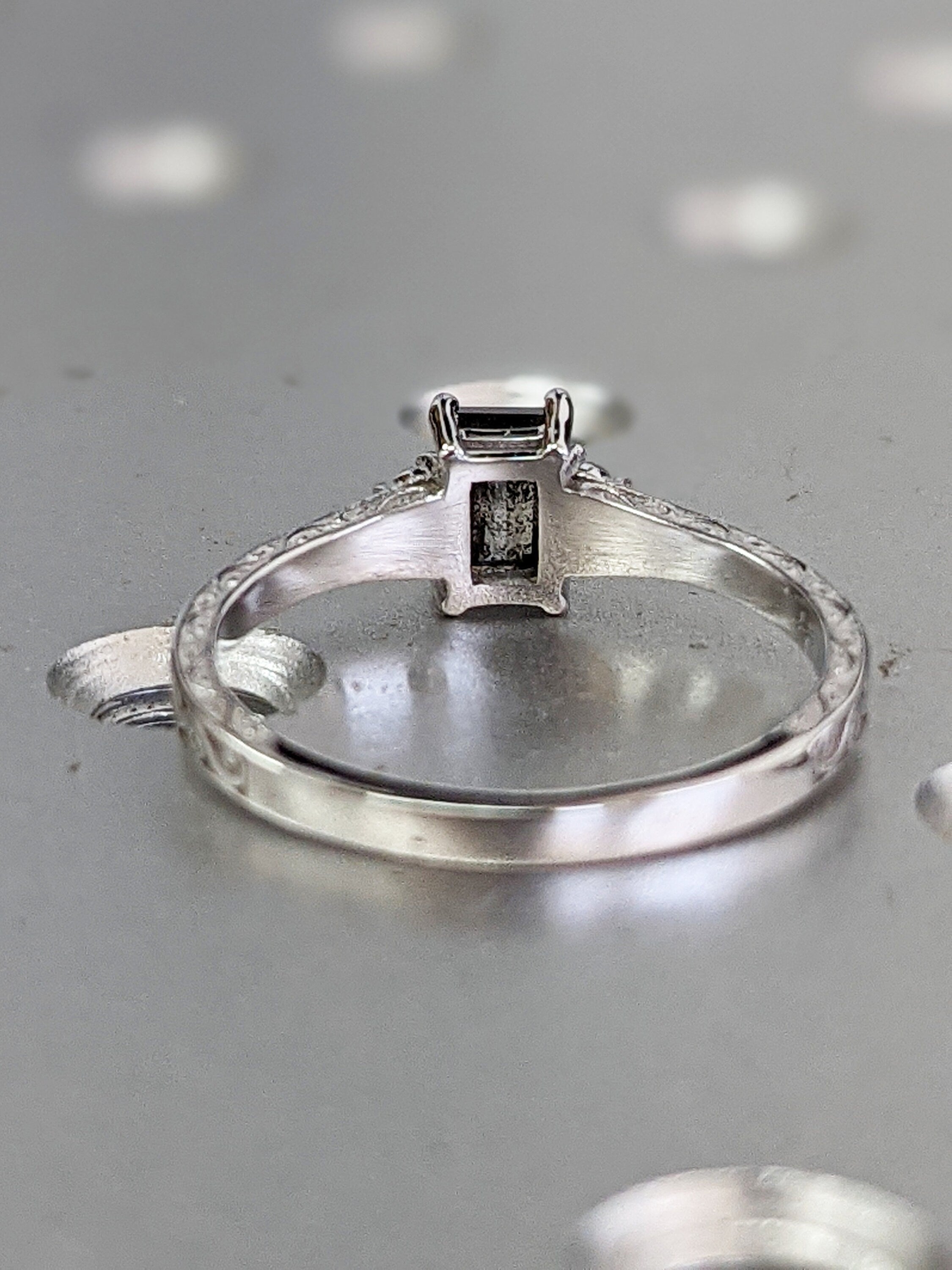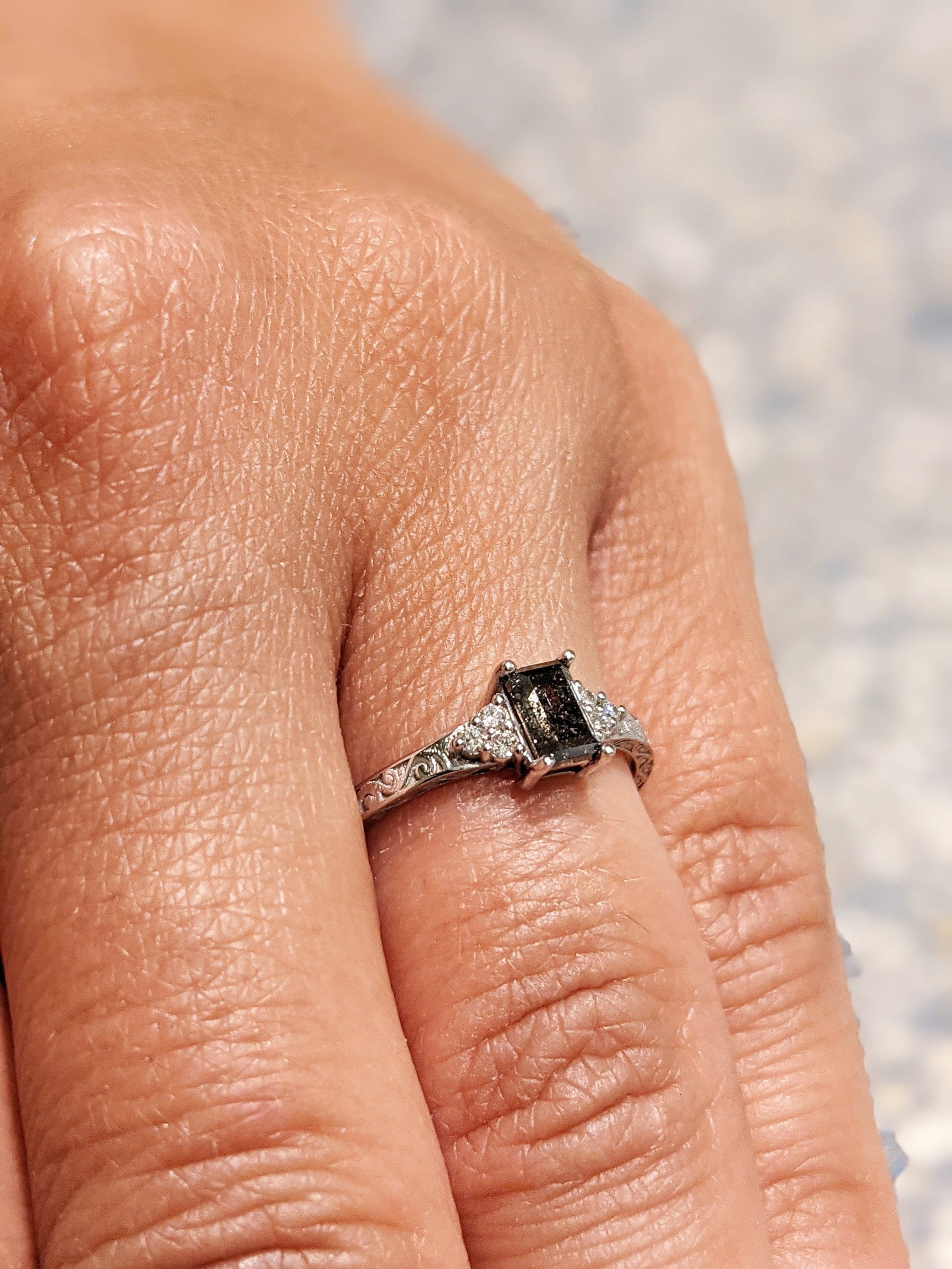 Emerald Baguette Raw Salt and Pepper Diamond Rose /White /Yellow Gold Engagement Ring Art Deco 1920's Inspired Thin Petite Band 14k Unique