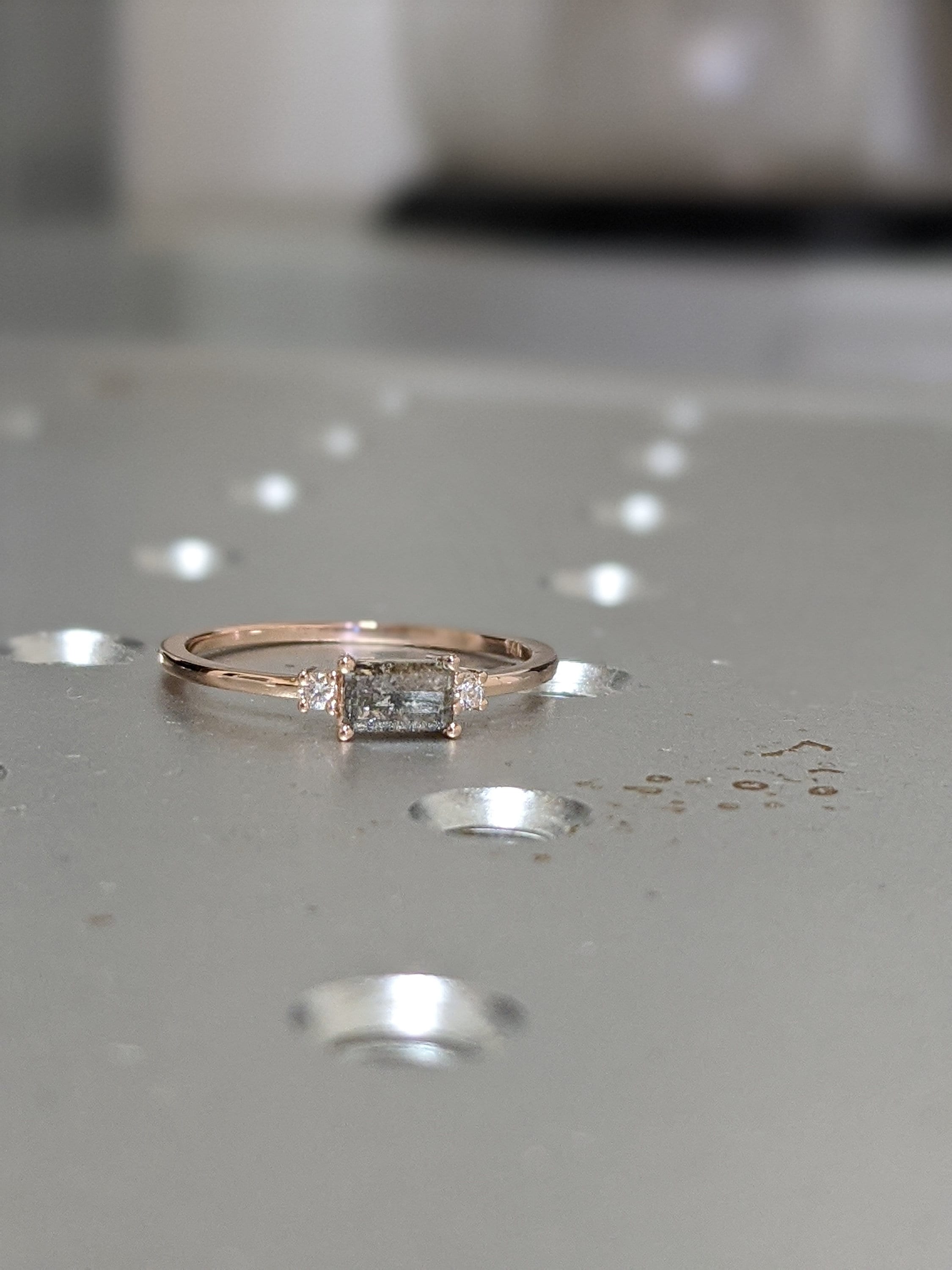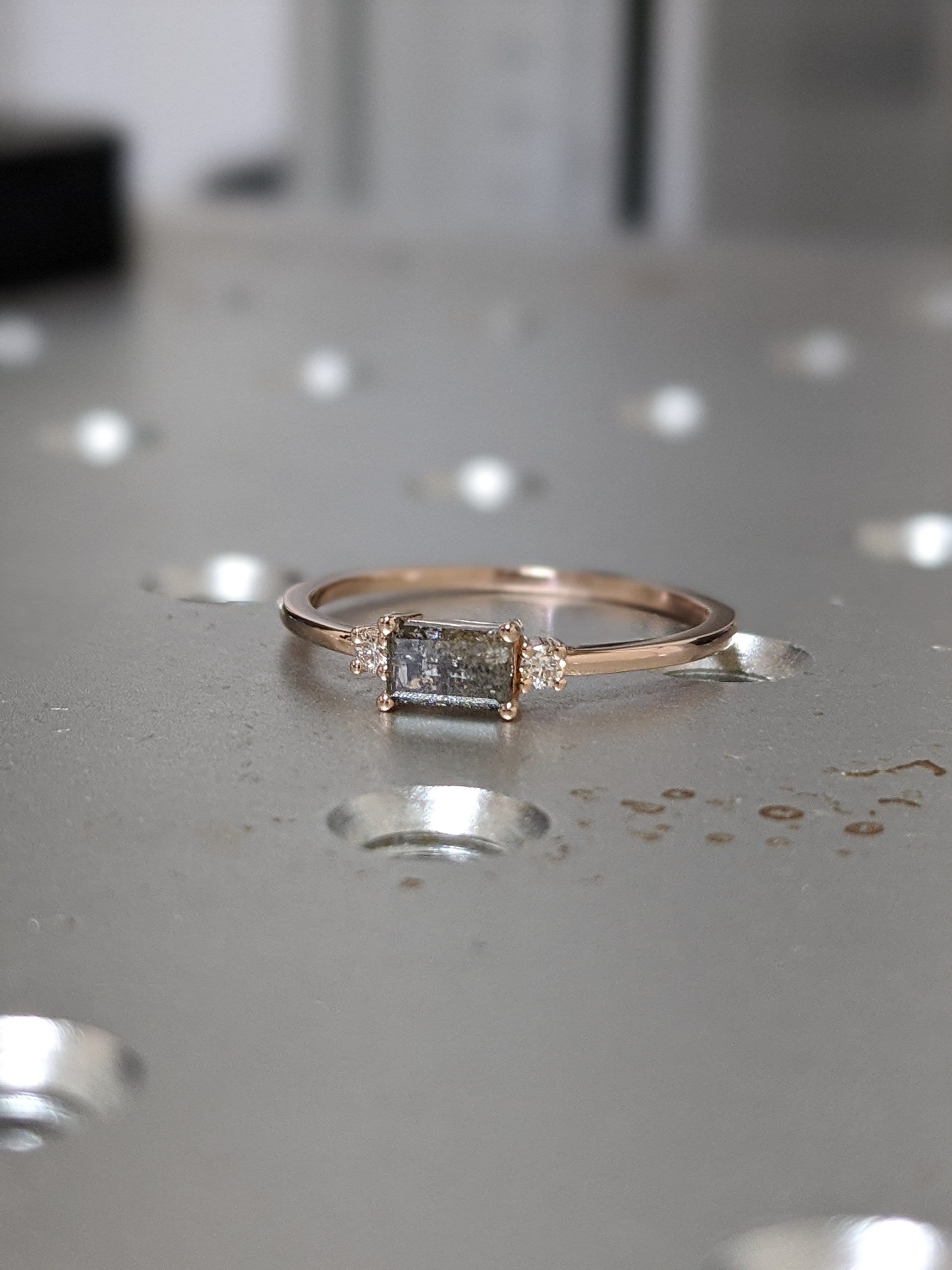 Emerald Baguette Raw Salt and Pepper Diamond Gold Engagement Ring Art Deco 1920's Inspired Thin Petite Band 14k Unique Ring for Her