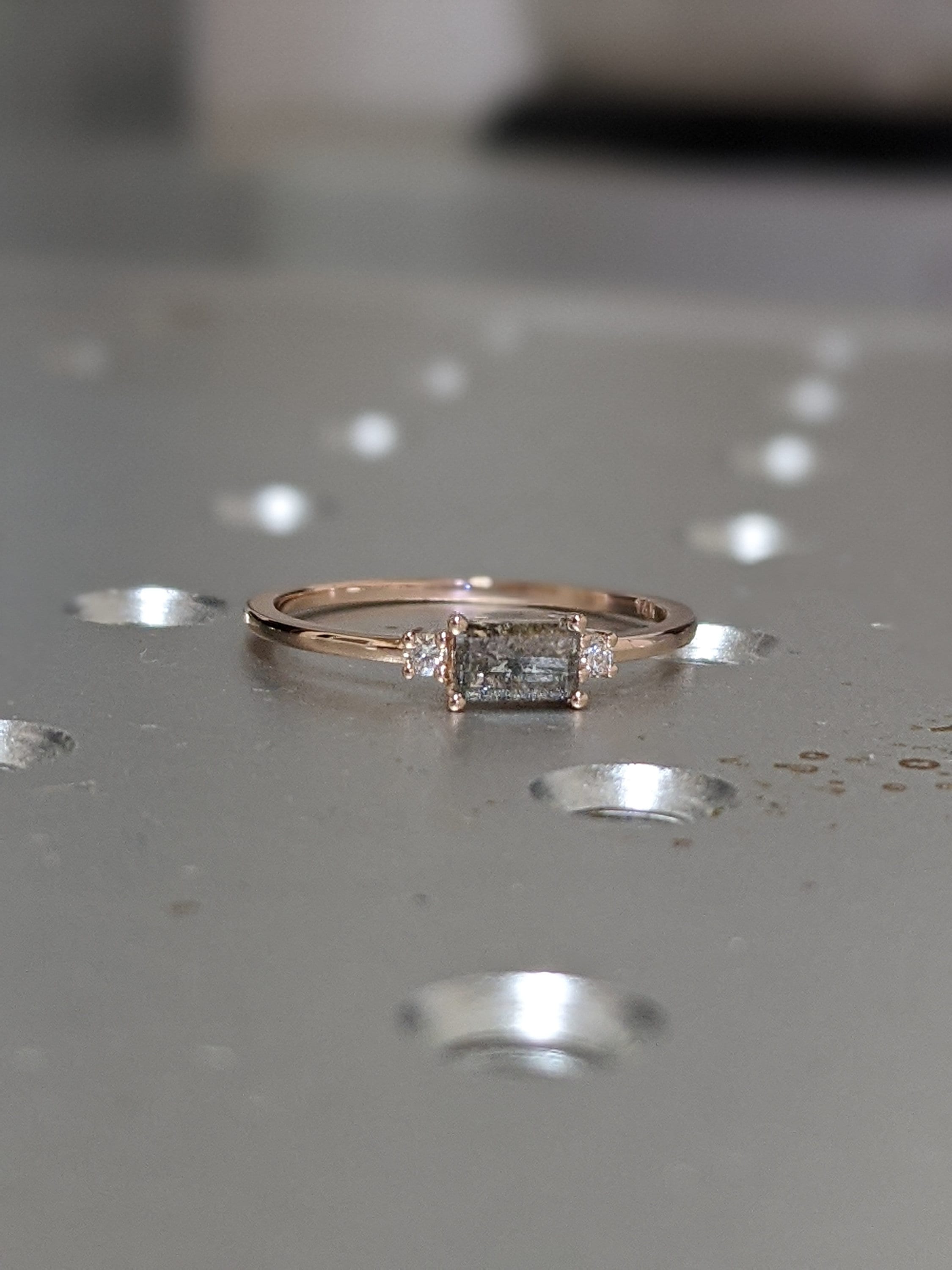 A stunningly beautiful vintage inspired design, petite band with a baguette cut Salt & Pepper diamond, adorned by 2 beautiful diamonds to contrast the center diamond.
