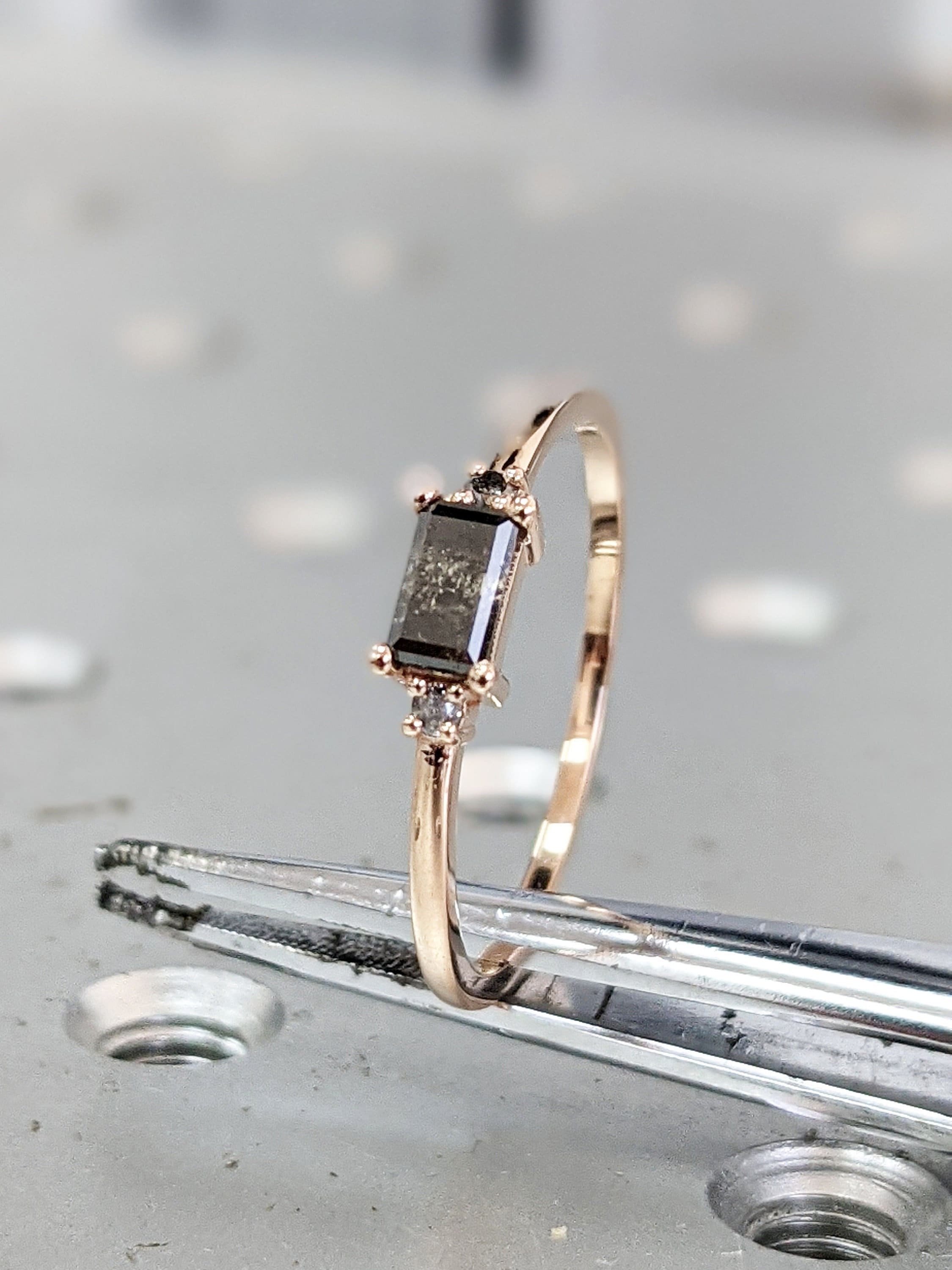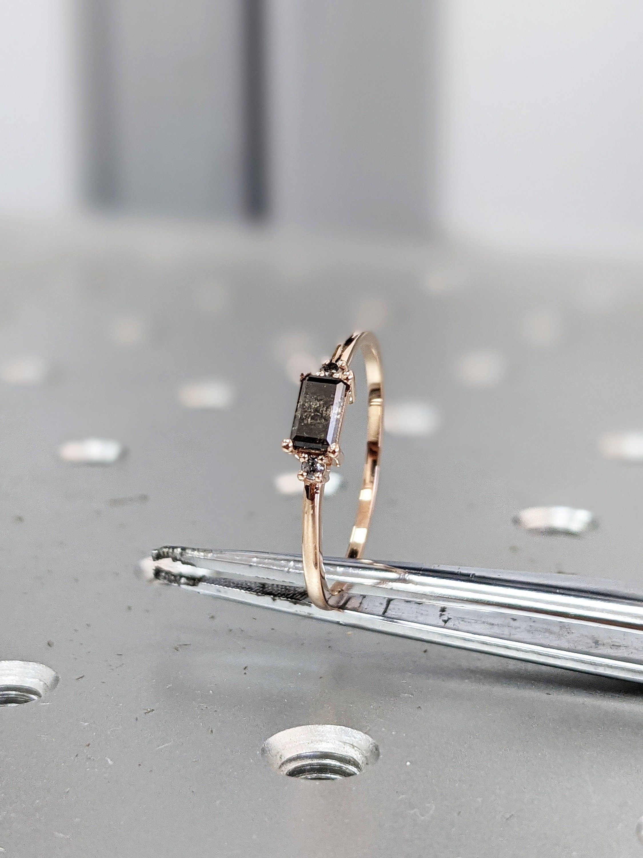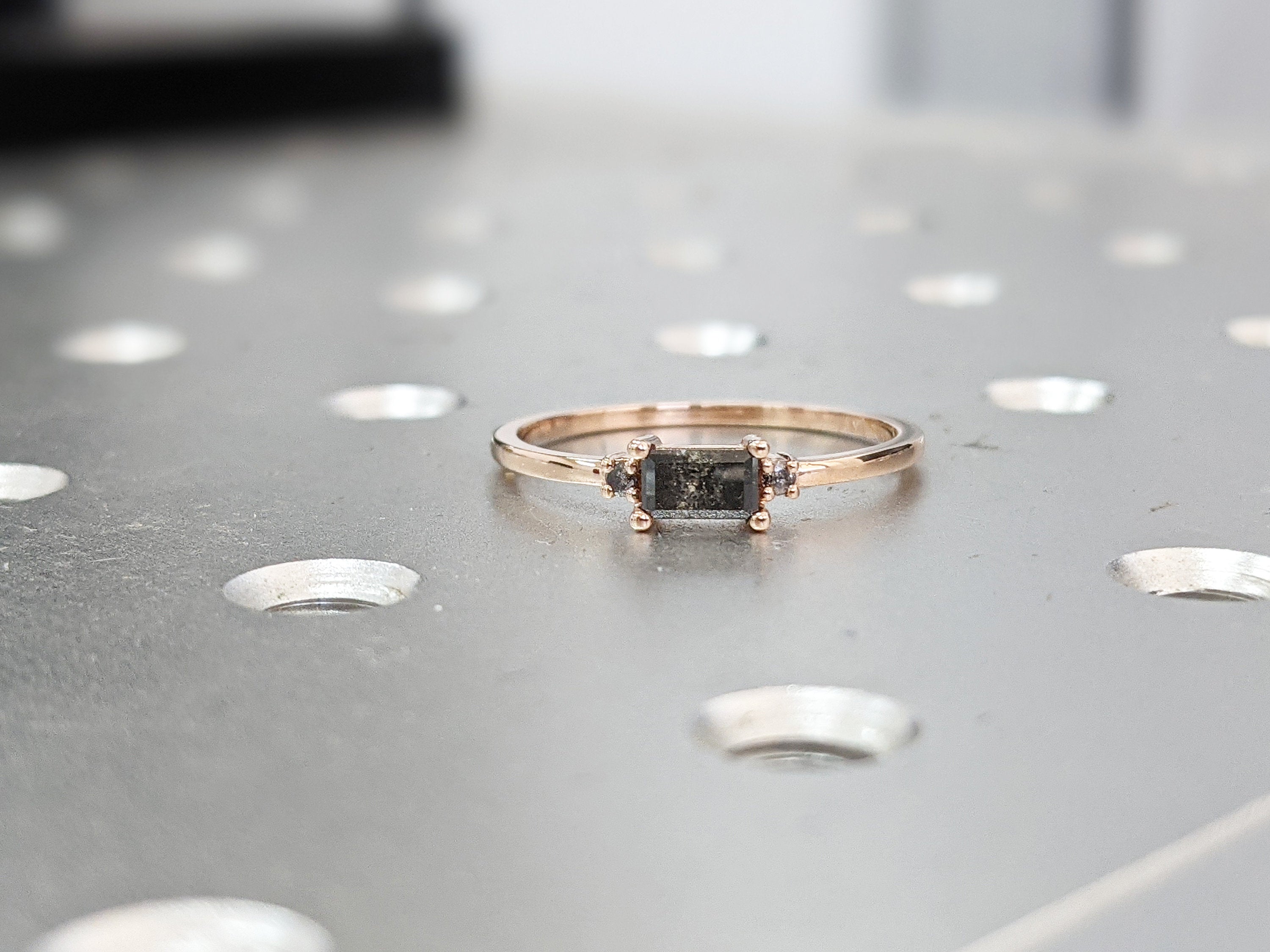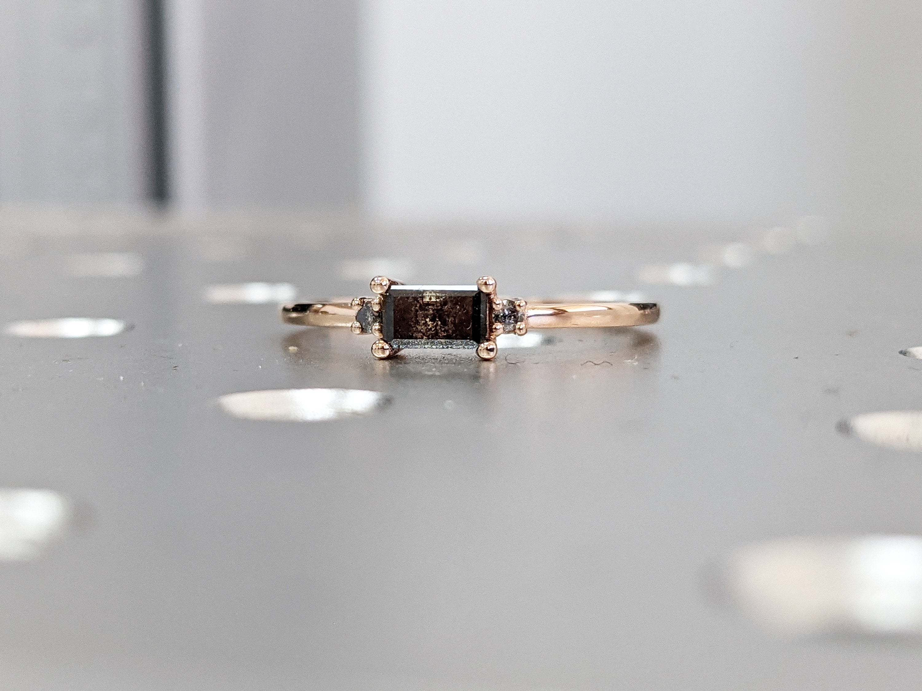 A stunningly beautiful vintage inspired design, petite band with a baguette cut Salt & Pepper diamond, adorned by 2 beautiful diamonds to contrast the center diamond.