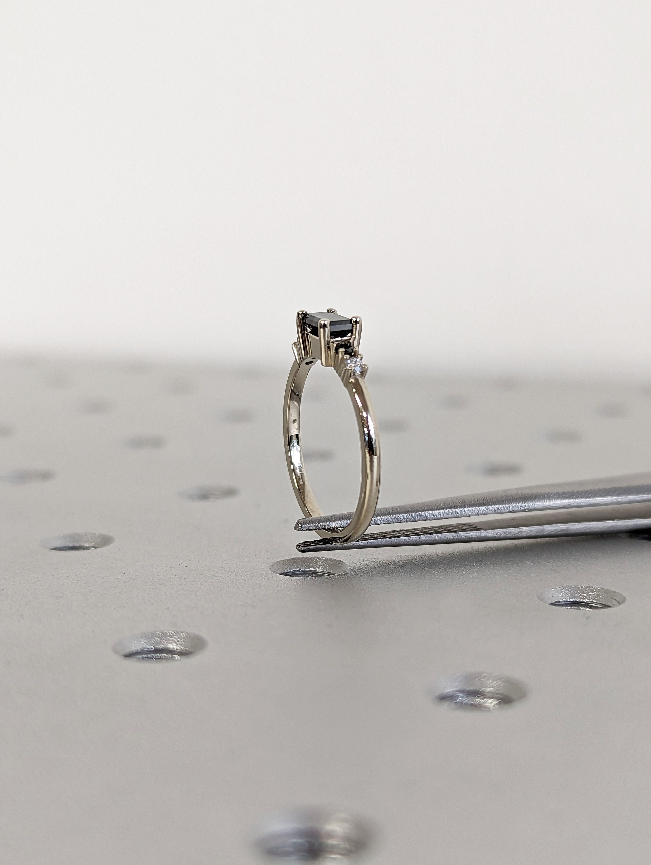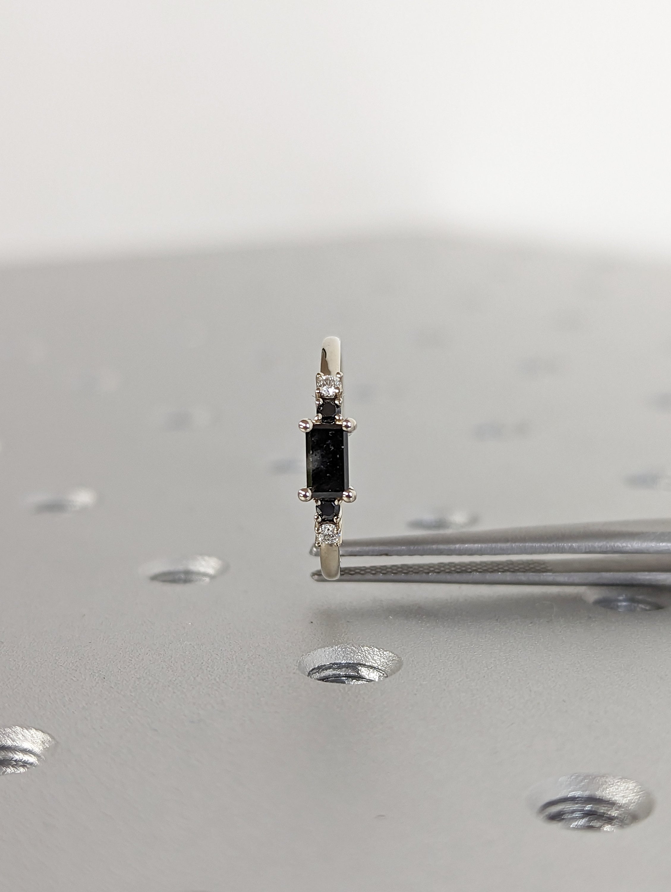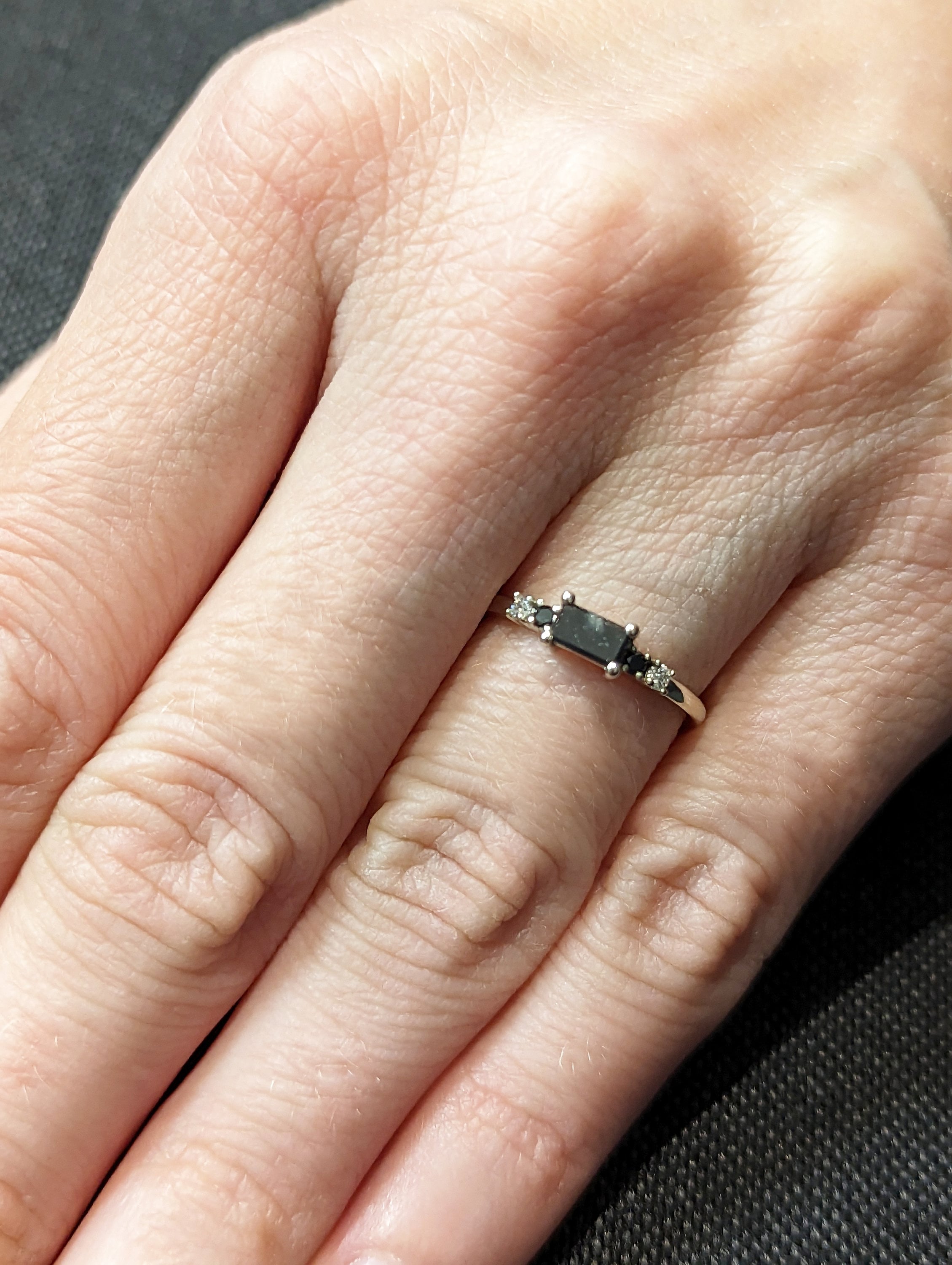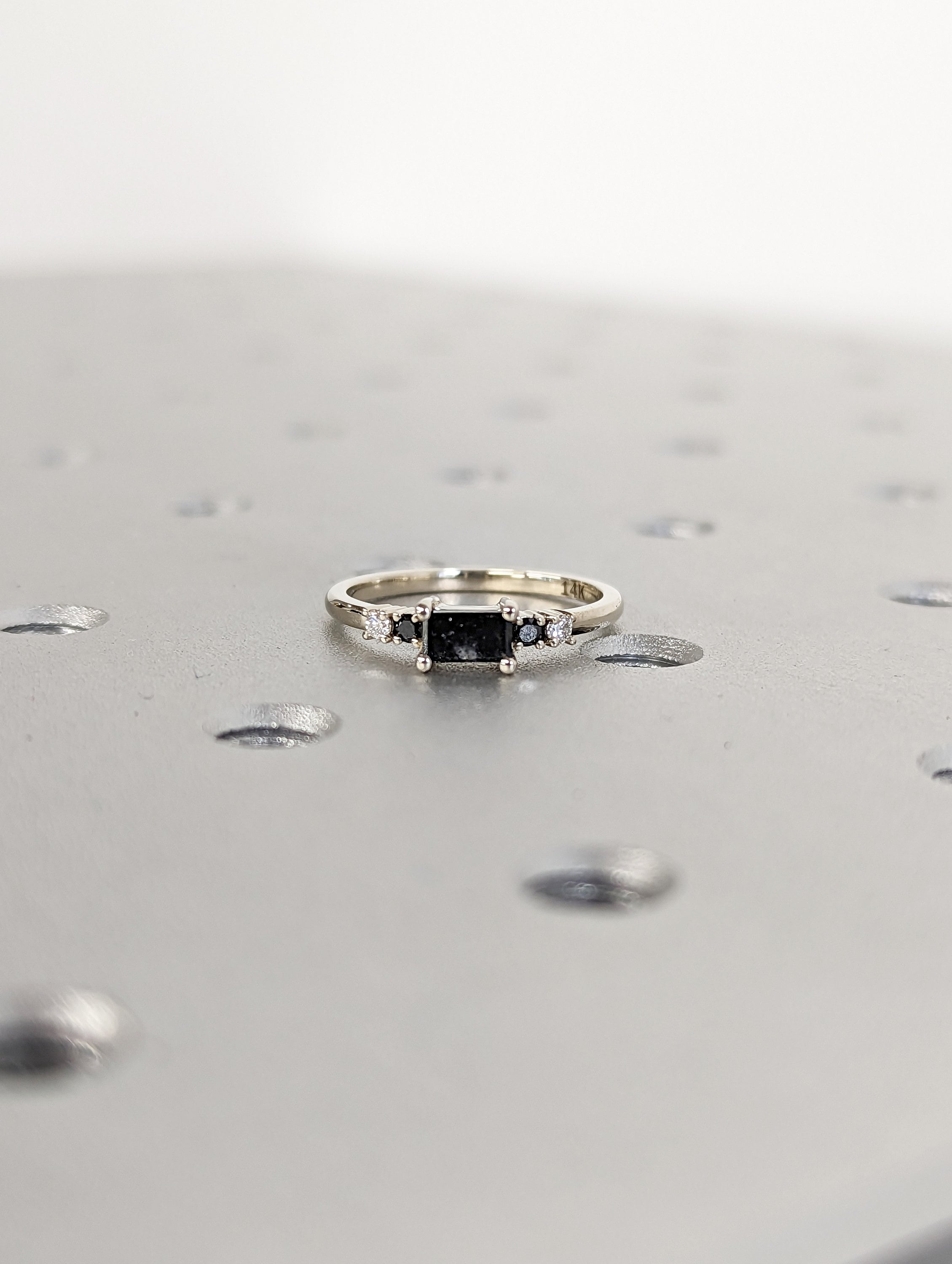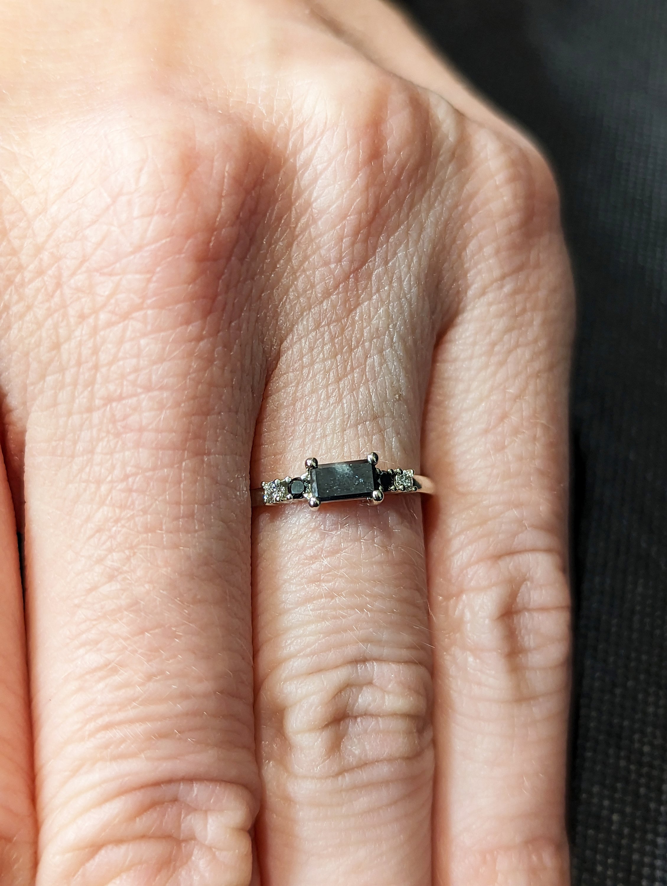 A stunningly beautiful vintage inspired design, petite band with a baguette cut Salt & Pepper diamond, adorned by 2 beautiful diamonds to contrast the center diamond.