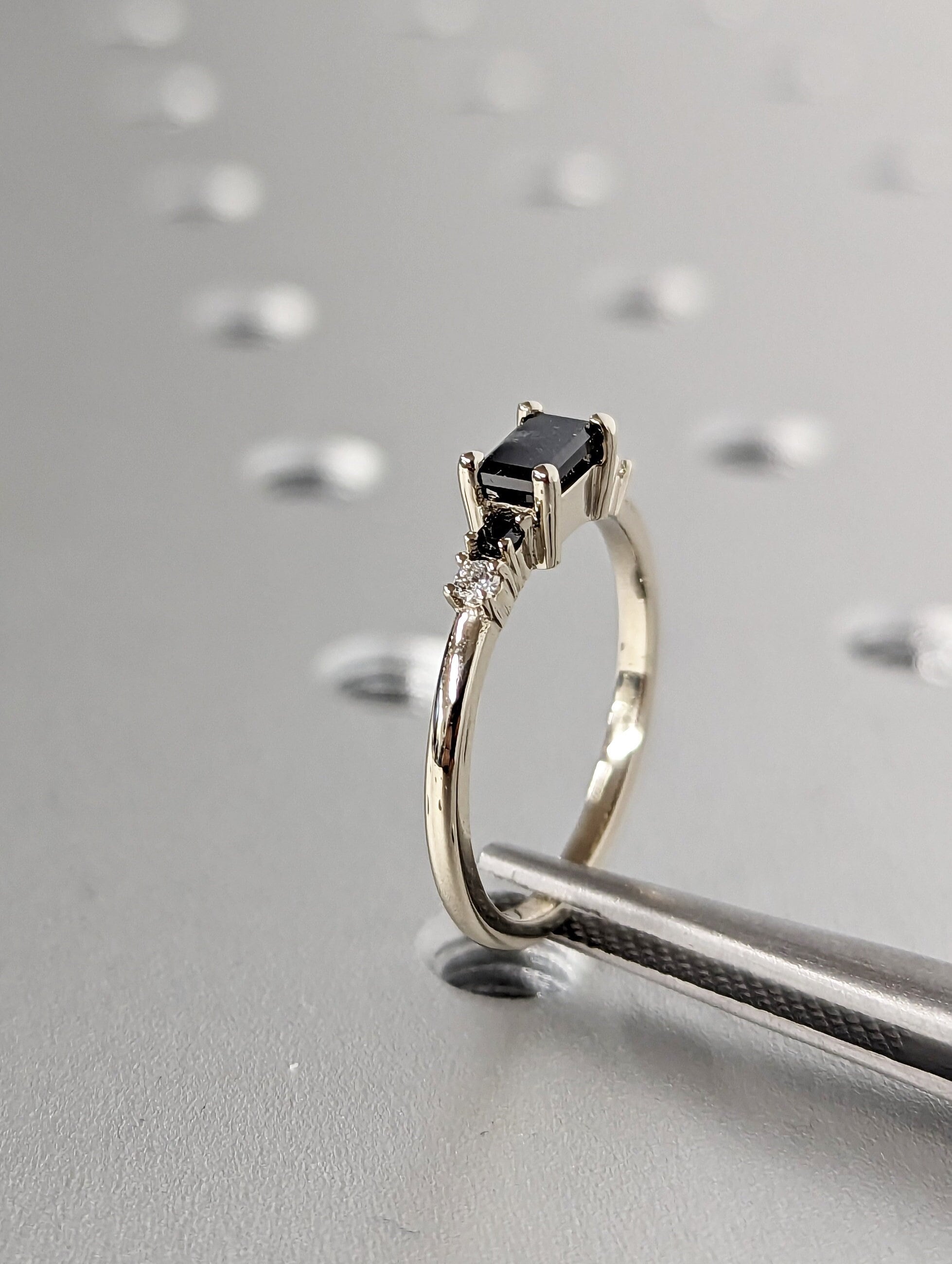 Emerald Baguette Raw Salt and Pepper Diamond Gold Engagement Ring Art Deco 1920's Inspired Thin Petite Band 14k Unique Ring for Her