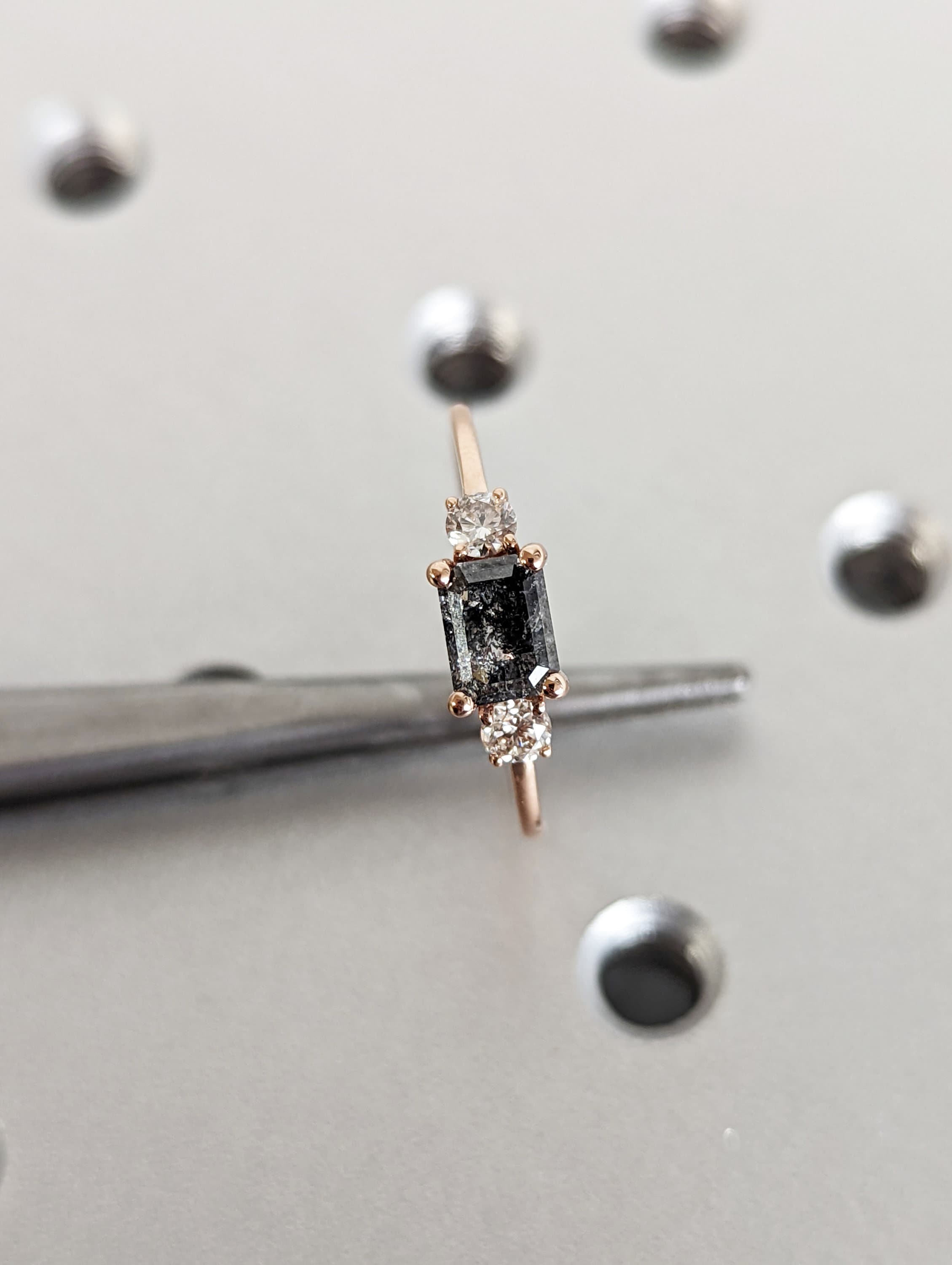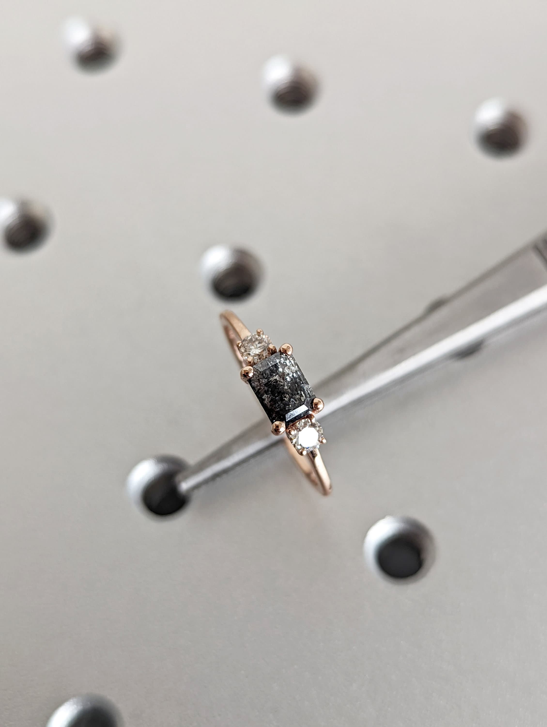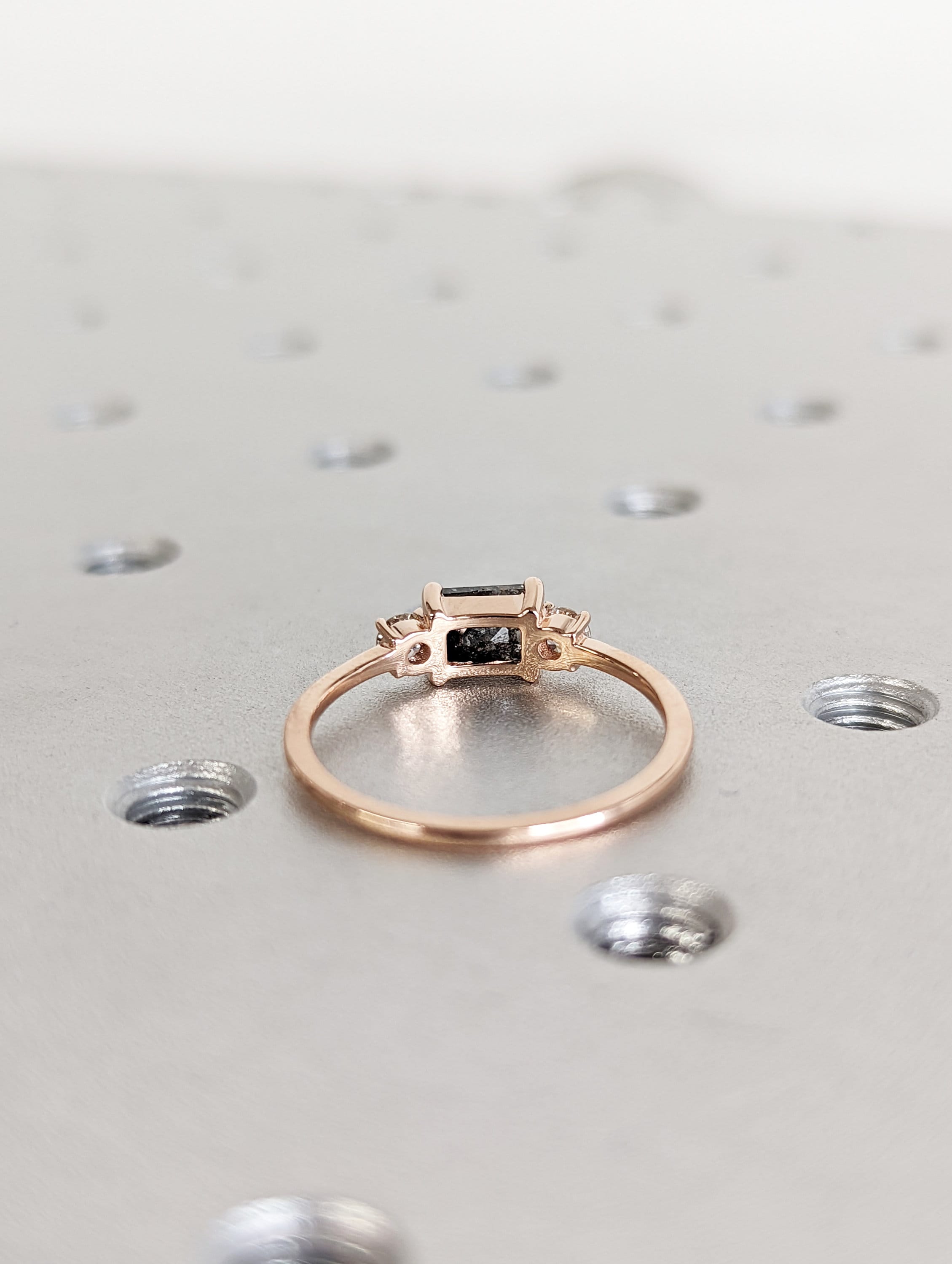 A stunningly beautiful vintage inspired design, petite band with a baguette cut Salt & Pepper diamond, adorned by 2 beautiful diamonds to contrast the center diamond.