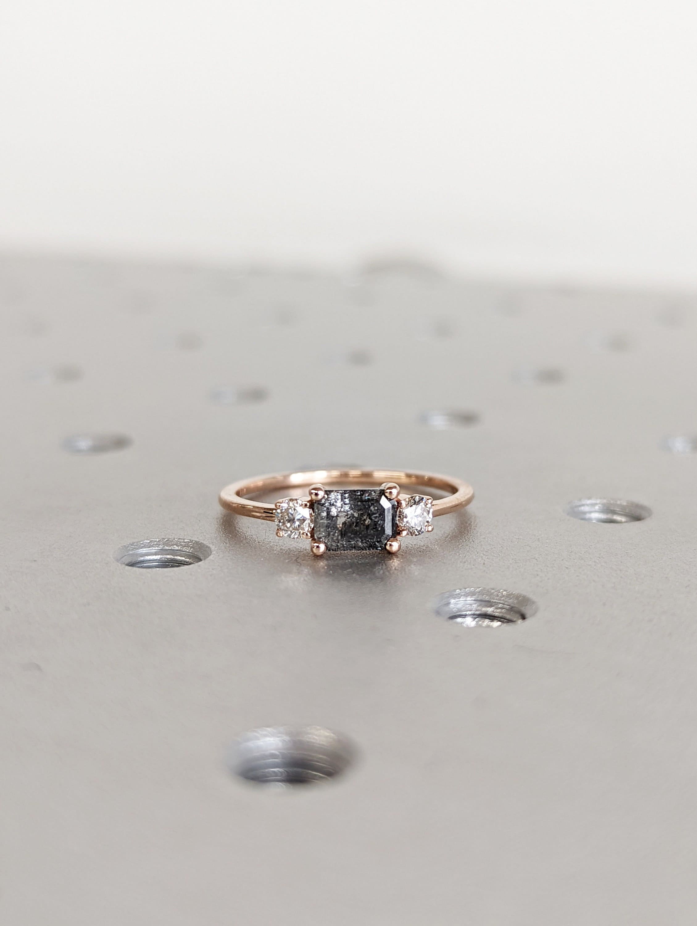Emerald Baguette Raw Salt and Pepper Diamond Gold Engagement Ring Art Deco 1920's Inspired Thin Petite Band 14k Unique Ring for Her