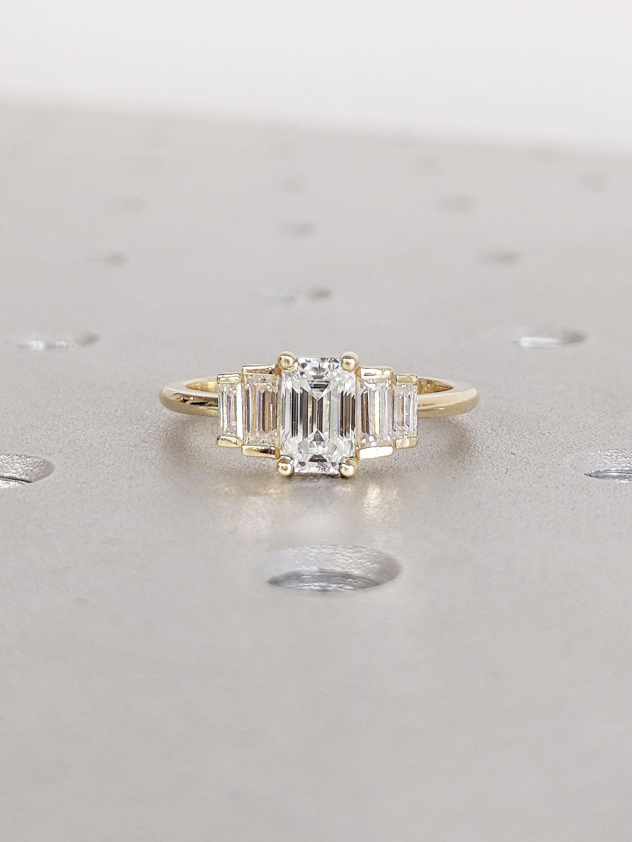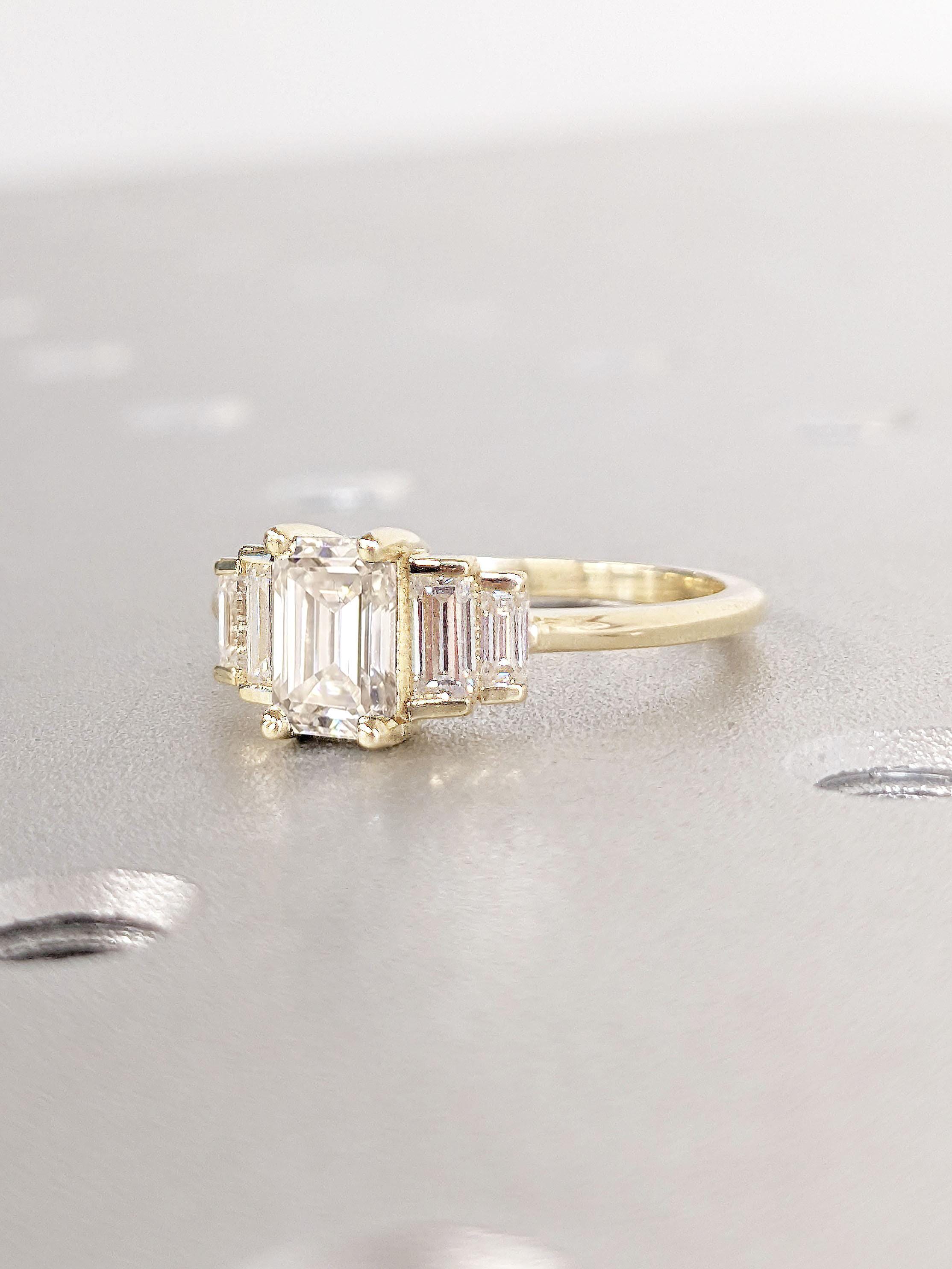 A classy geometrical statement piece, this five stone ring features an emerald cut Moissanite focal stone, accented by baguette cut side stones in your choice of natural diamonds, lab diamonds or moissanites. Set on a delicate thin band of 1.6mm width, this multi stone ring effortlessly adds a flair of sophistication to your style for any occasion. It's the perfect gift for engagement, wedding anniversary or birthday.