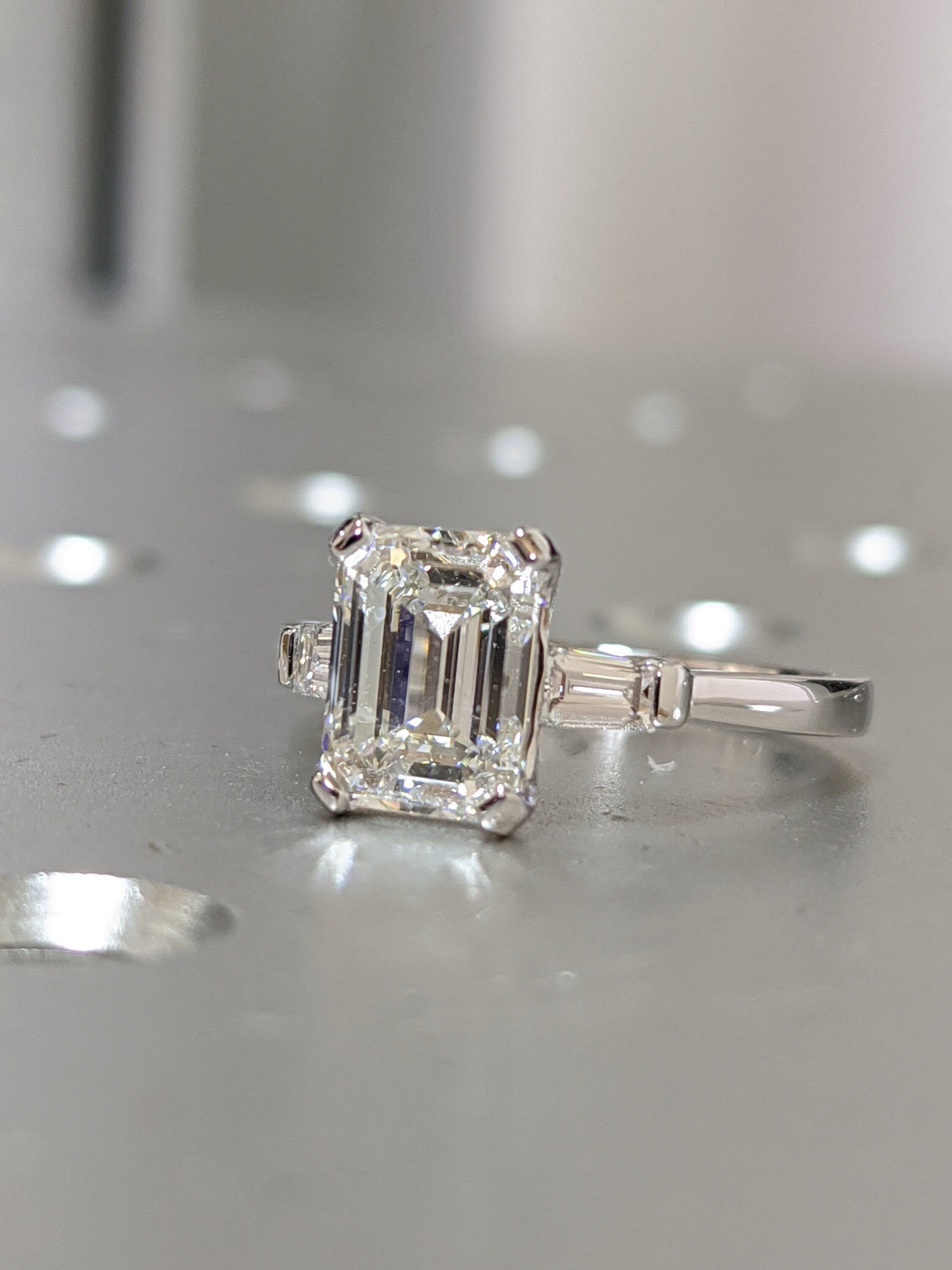 The baguette bar set diamond accents either side of the claw prong center stone add a light-catching quality to this alluring engagement ring, which is completed by a tapered band.
