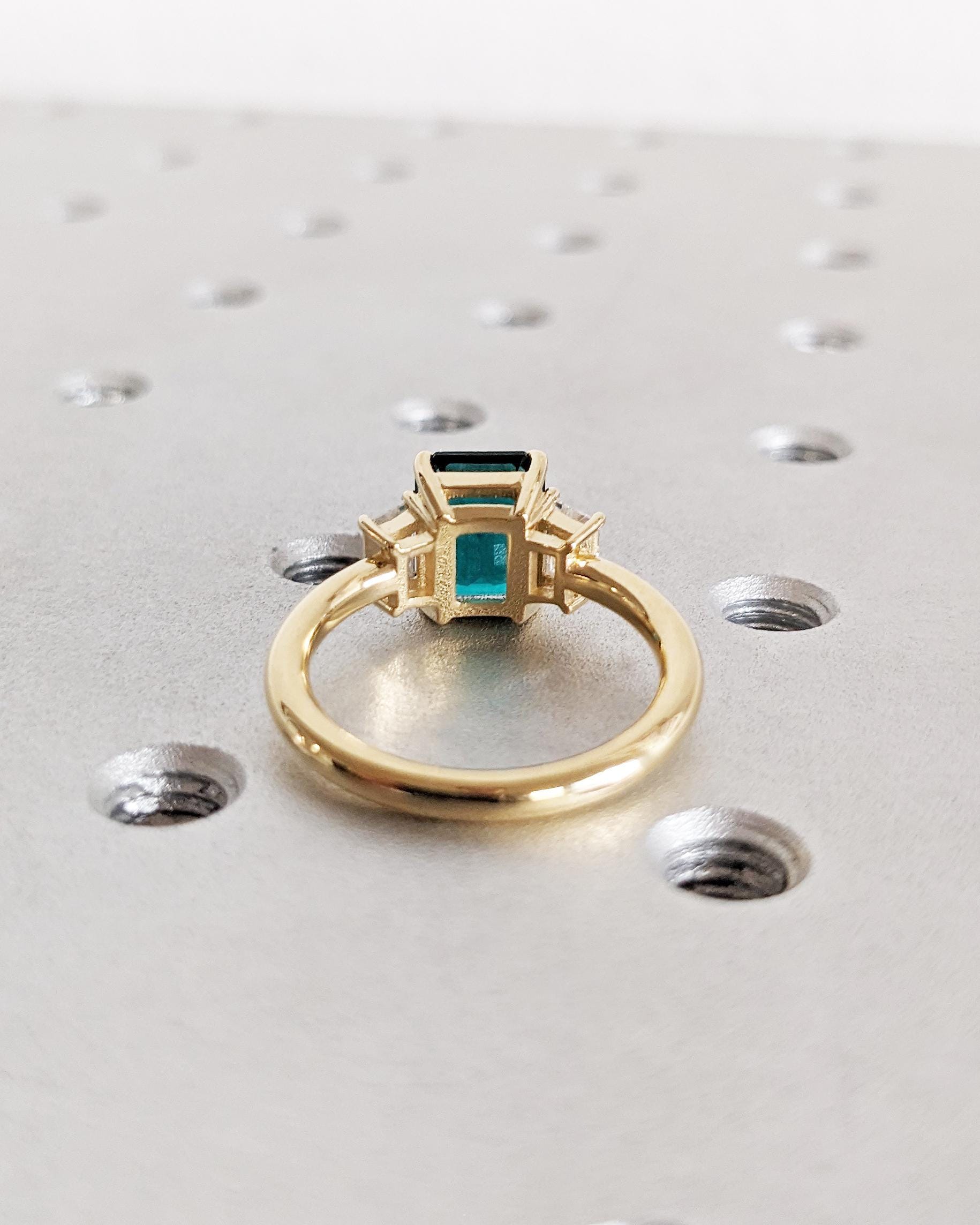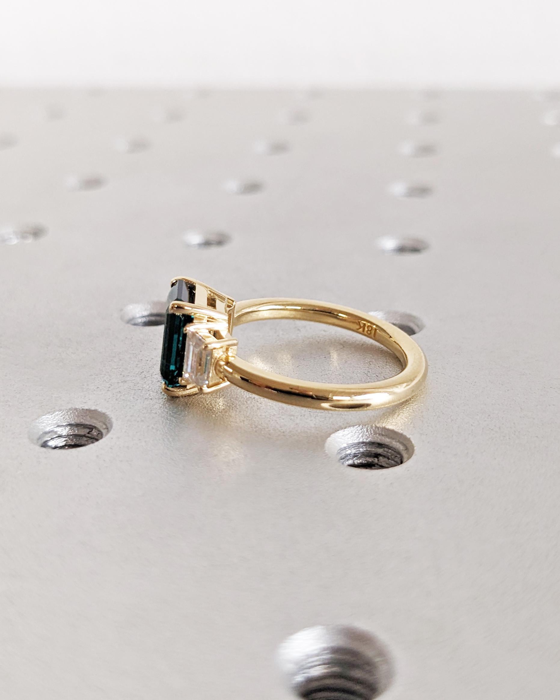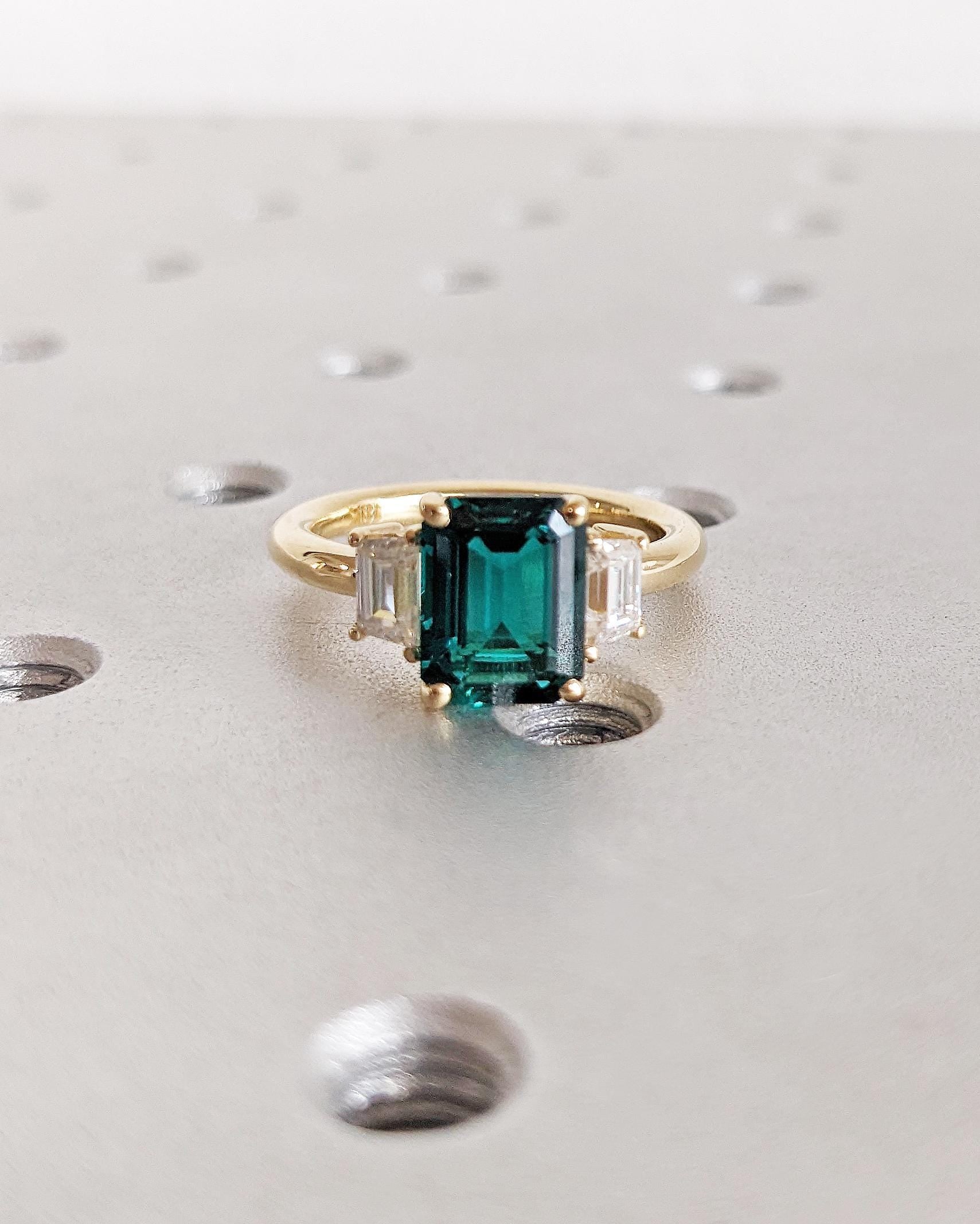 Elevate your love story with our exquisite three-stone engagement ring featuring a brilliant emerald shape emerald paired harmoniously with two mesmerizing trapezoid-cut moissanite stones. A perfect blend of elegance and sparkle for your special moment.