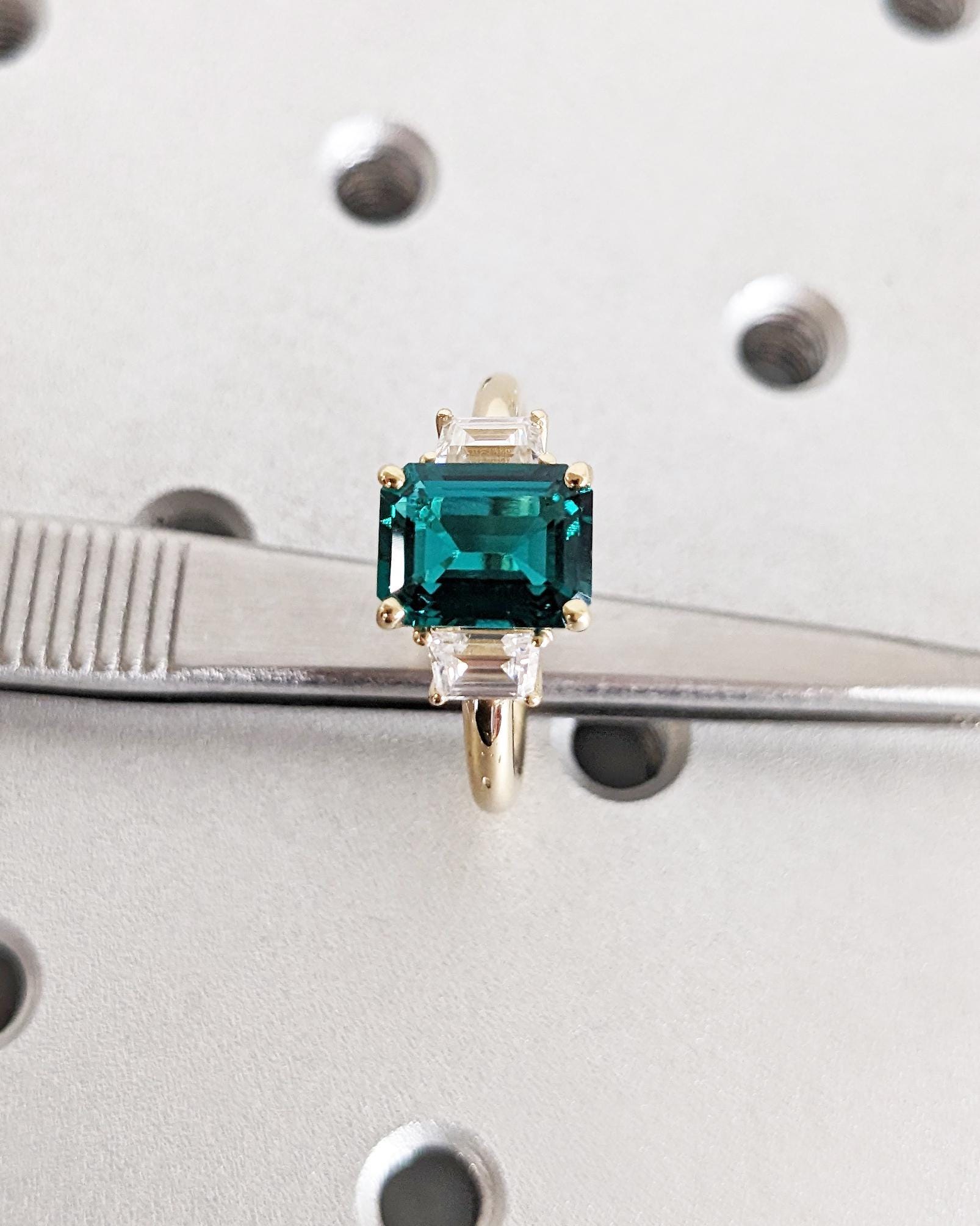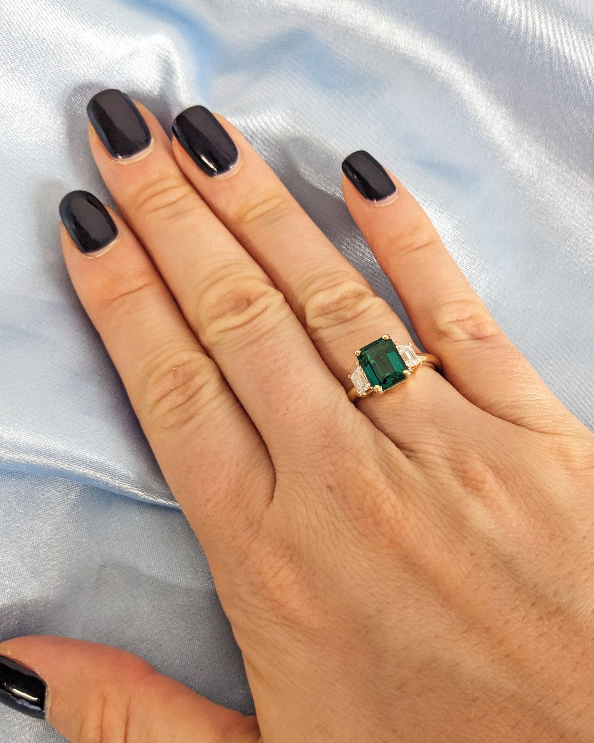 Emerald Cut Green Emerald Ring | Three Stone Emerald Engagement Ring with Trapezoid Moissanites | 14K Yellow Gold