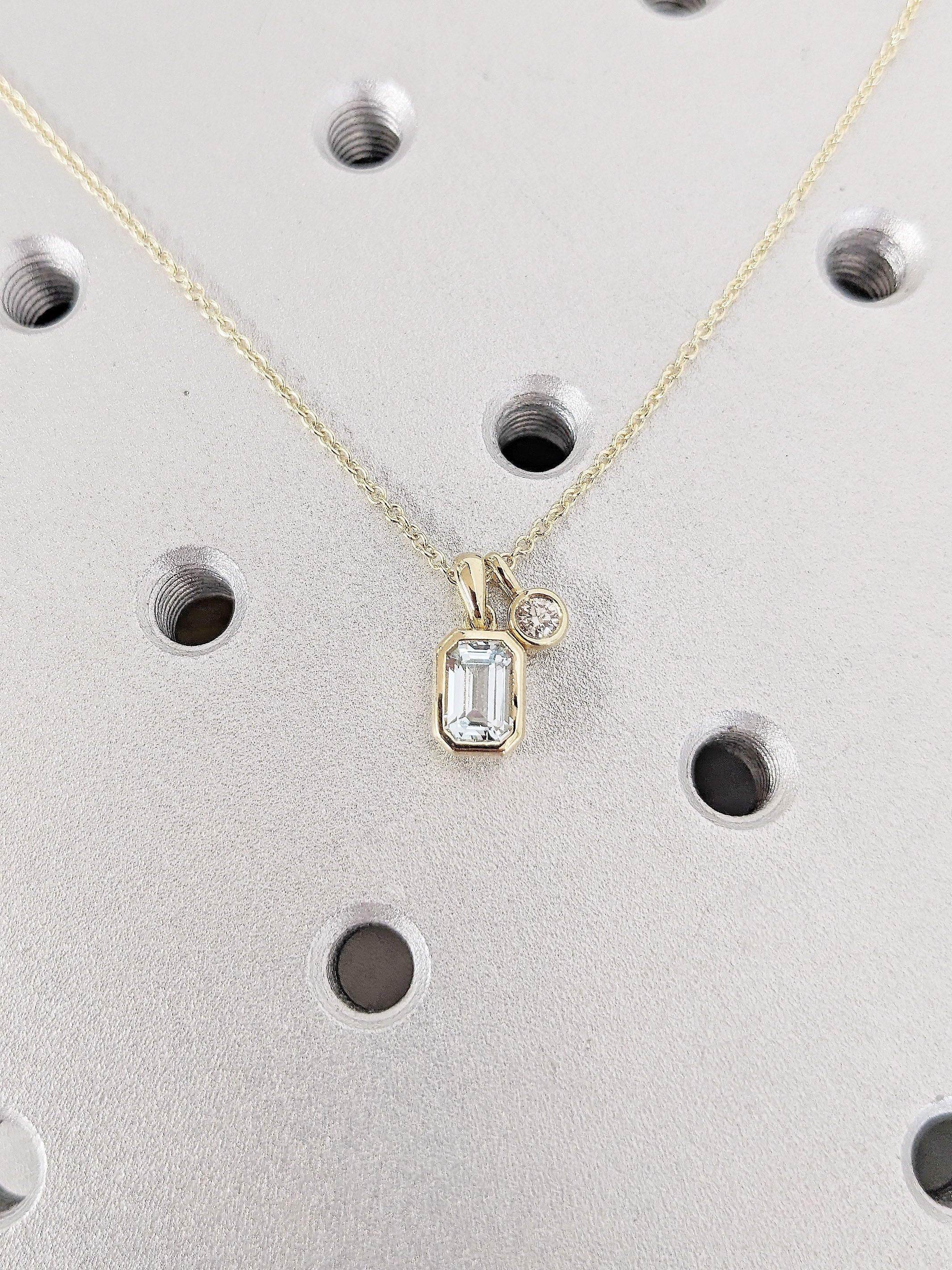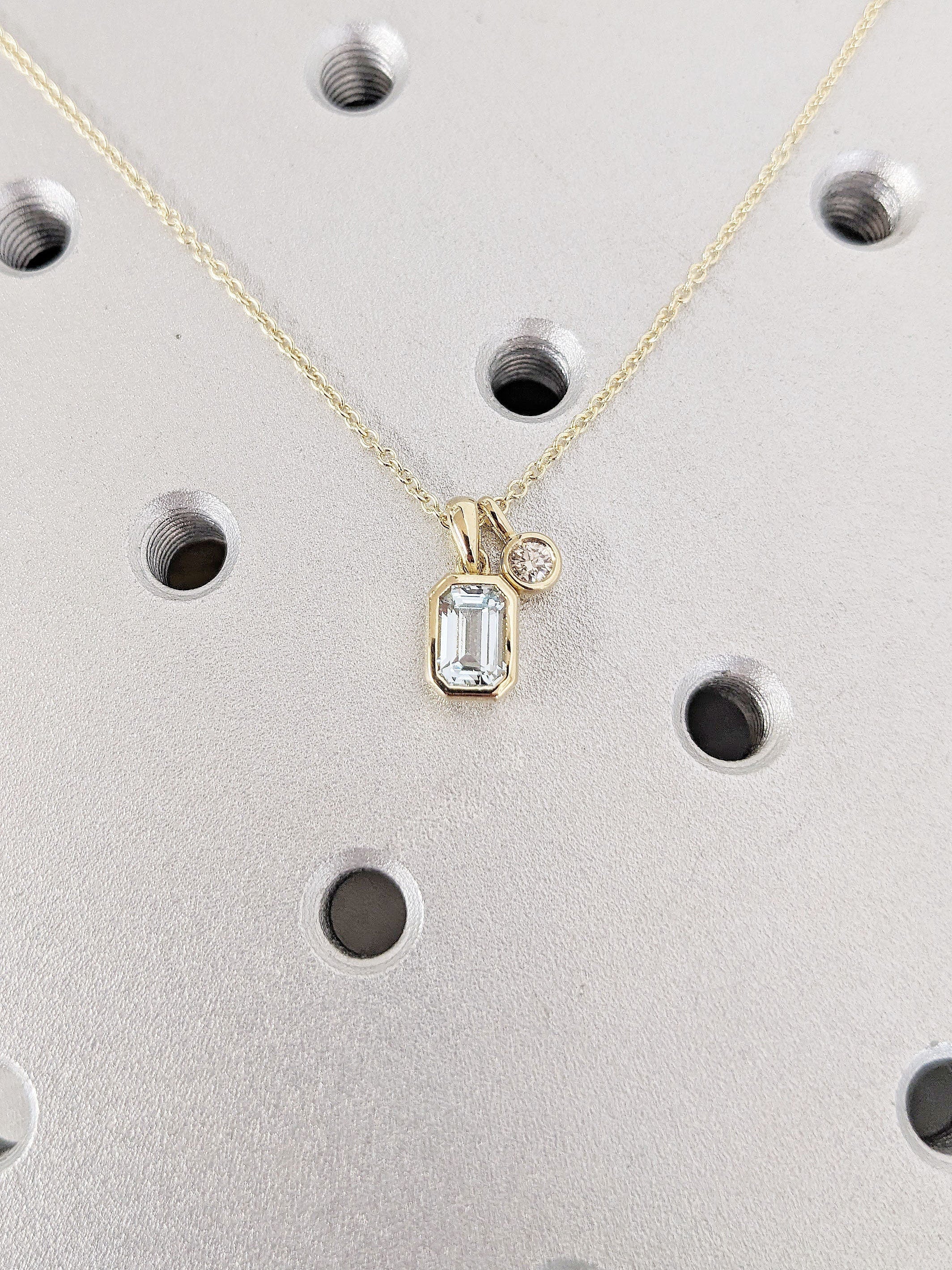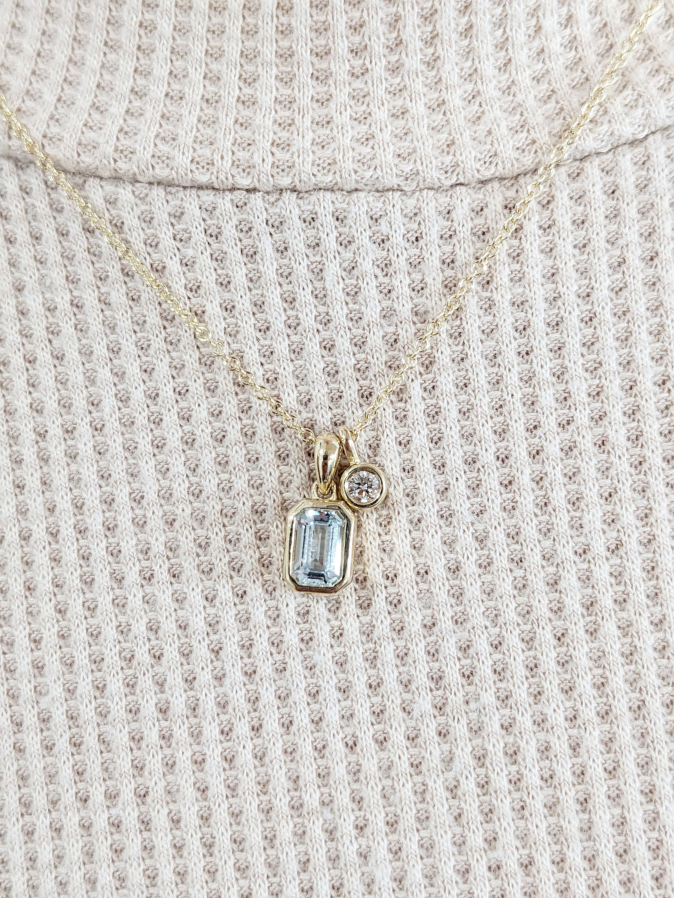 Elegant and timeless, this necklace features a striking emerald cut Lab Aquamarine that shimmers brilliantly. The dainty pendant is accented with your choice of natural Diamond, Lab Diamond or Moissanite. Perfect for everyday wear or as a thoughtful gift, this piece combines sophistication with a modern minimalist style