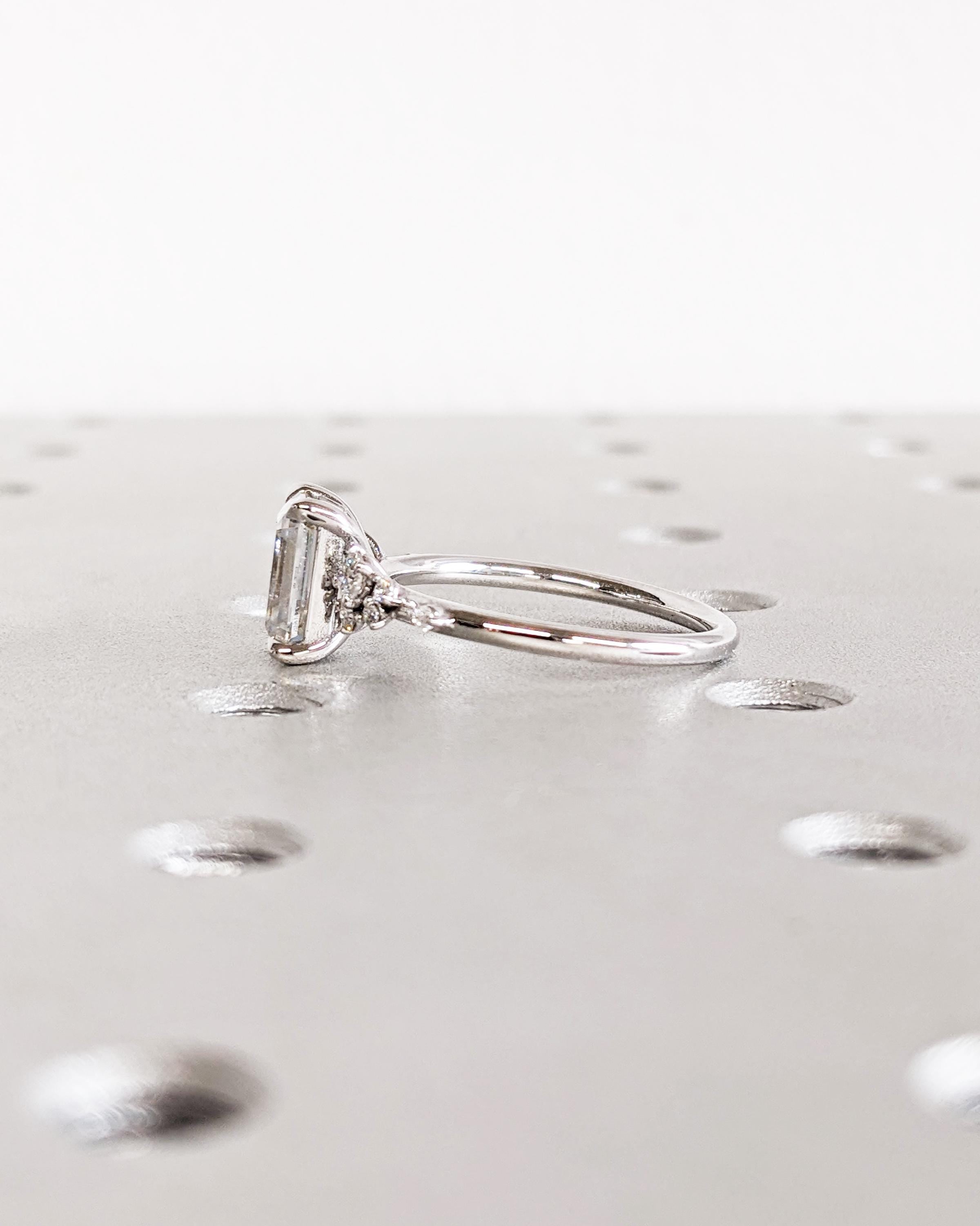 Celebrate the next chapter of your life with our elegant emerald cut lab cultured diamond engagement ring, set in a sleek, delicate band. The center stone is beautifully surrounded by a cluster of shimmering snowdrift diamonds or moissanites, evoking the sparkle of freshly fallen snow. Finely handcrafted, this ring is a timeless symbol of your everlasting love.