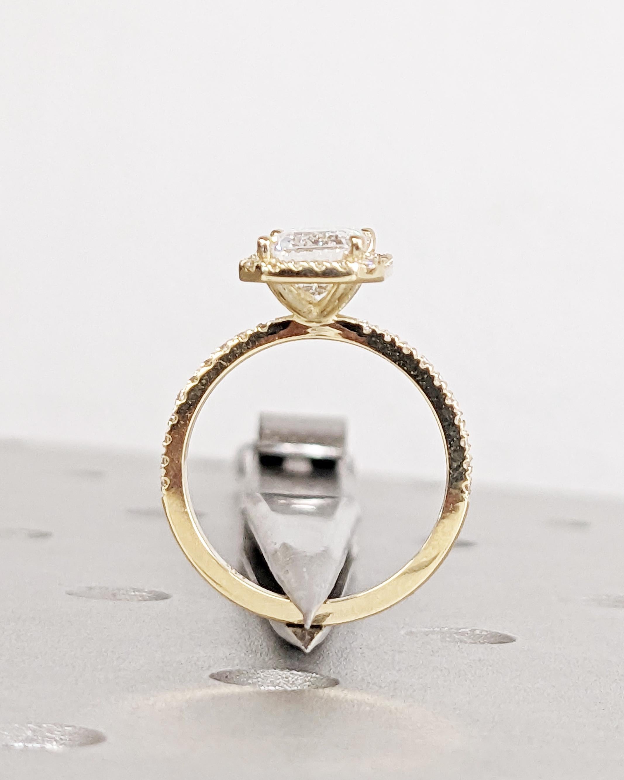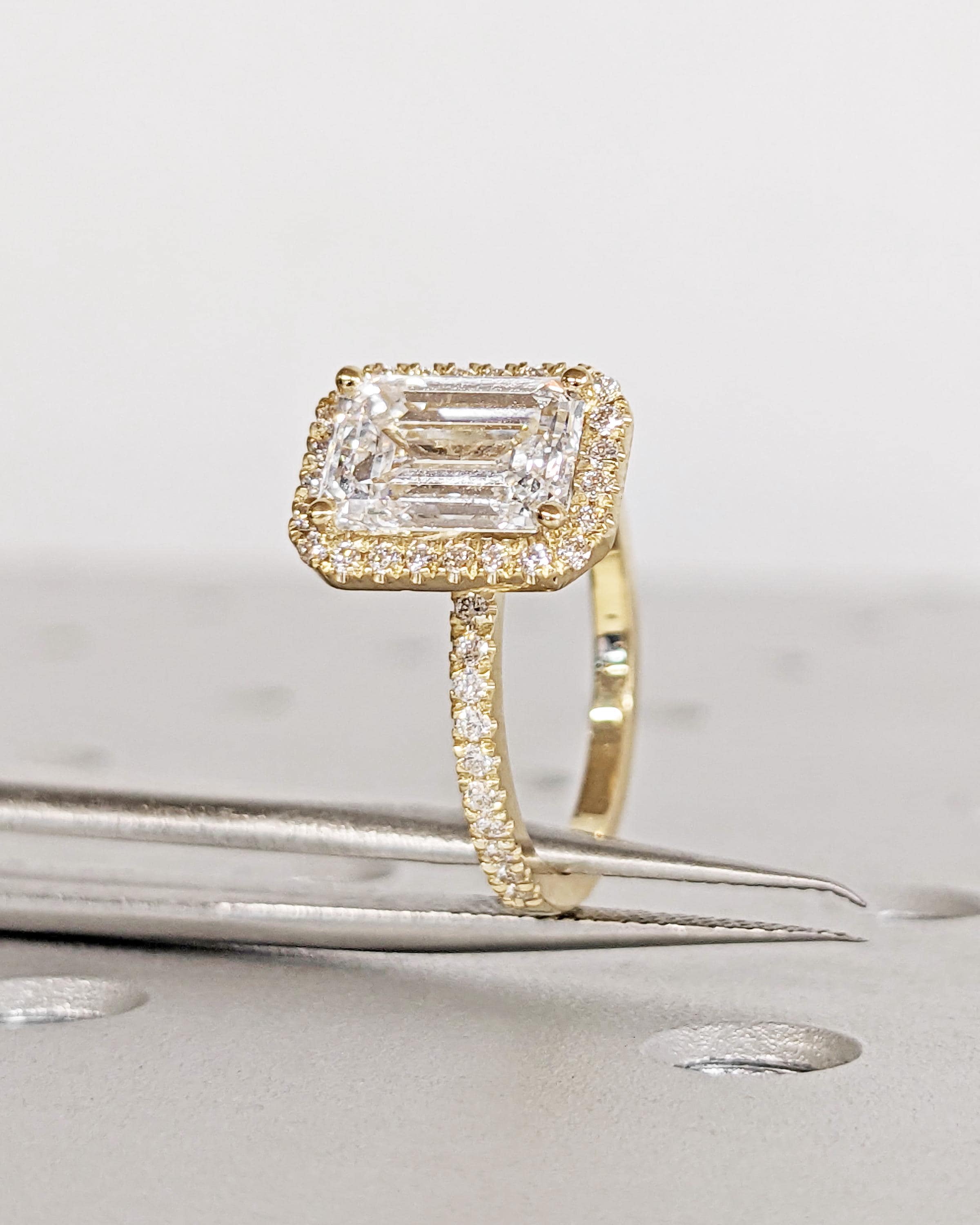 This Art Deco inspired emerald cut lab grown diamond ring is designed for brides who love a glamorous statement piece. The radiant halo enhances the clean, geometric lines of the stone, and the pavé band adds just the right sparkle while keeping the design lightweight. Choose natural diamond, lab diamond, or moissanite for the side stones to personalize your look.