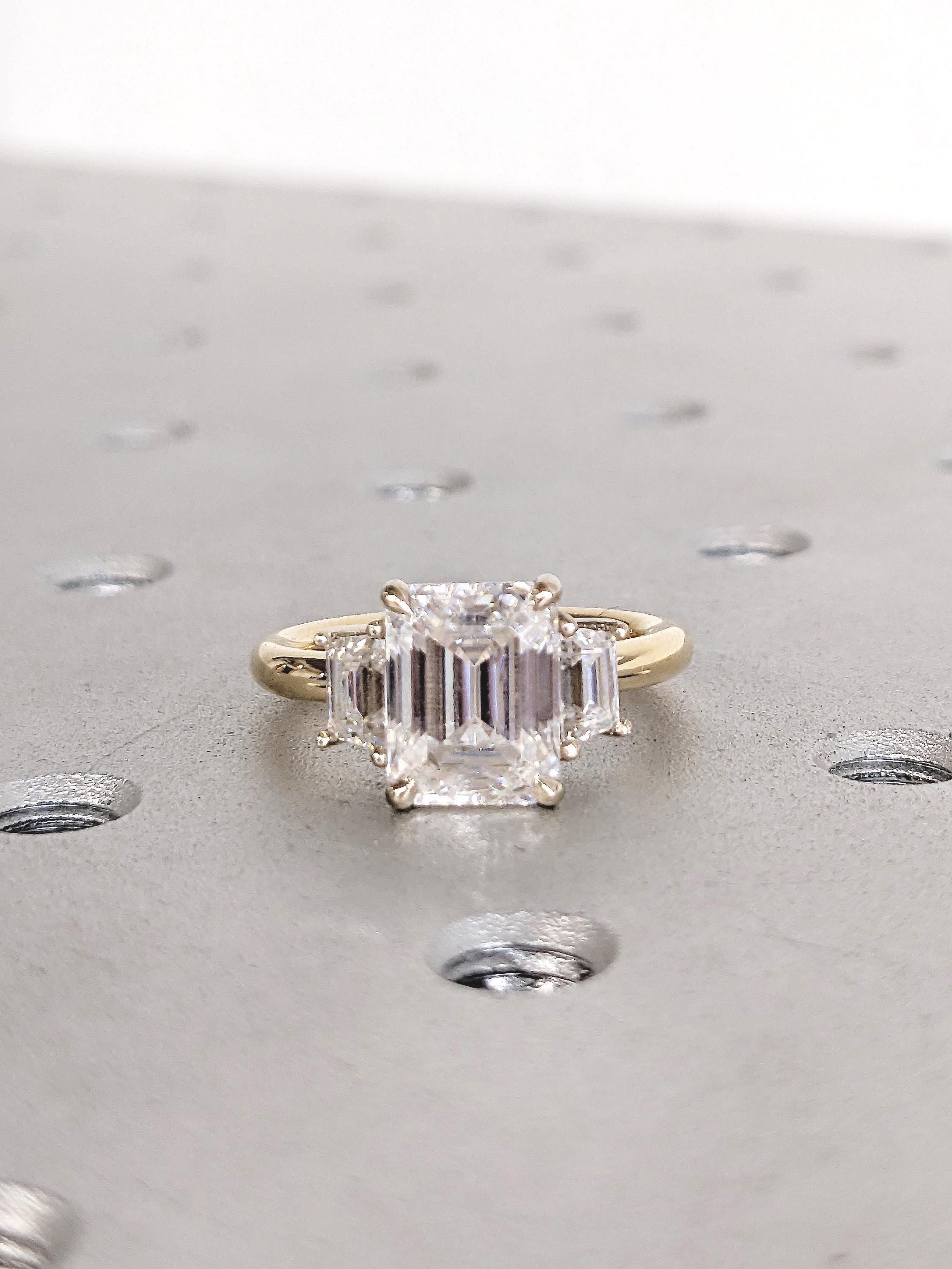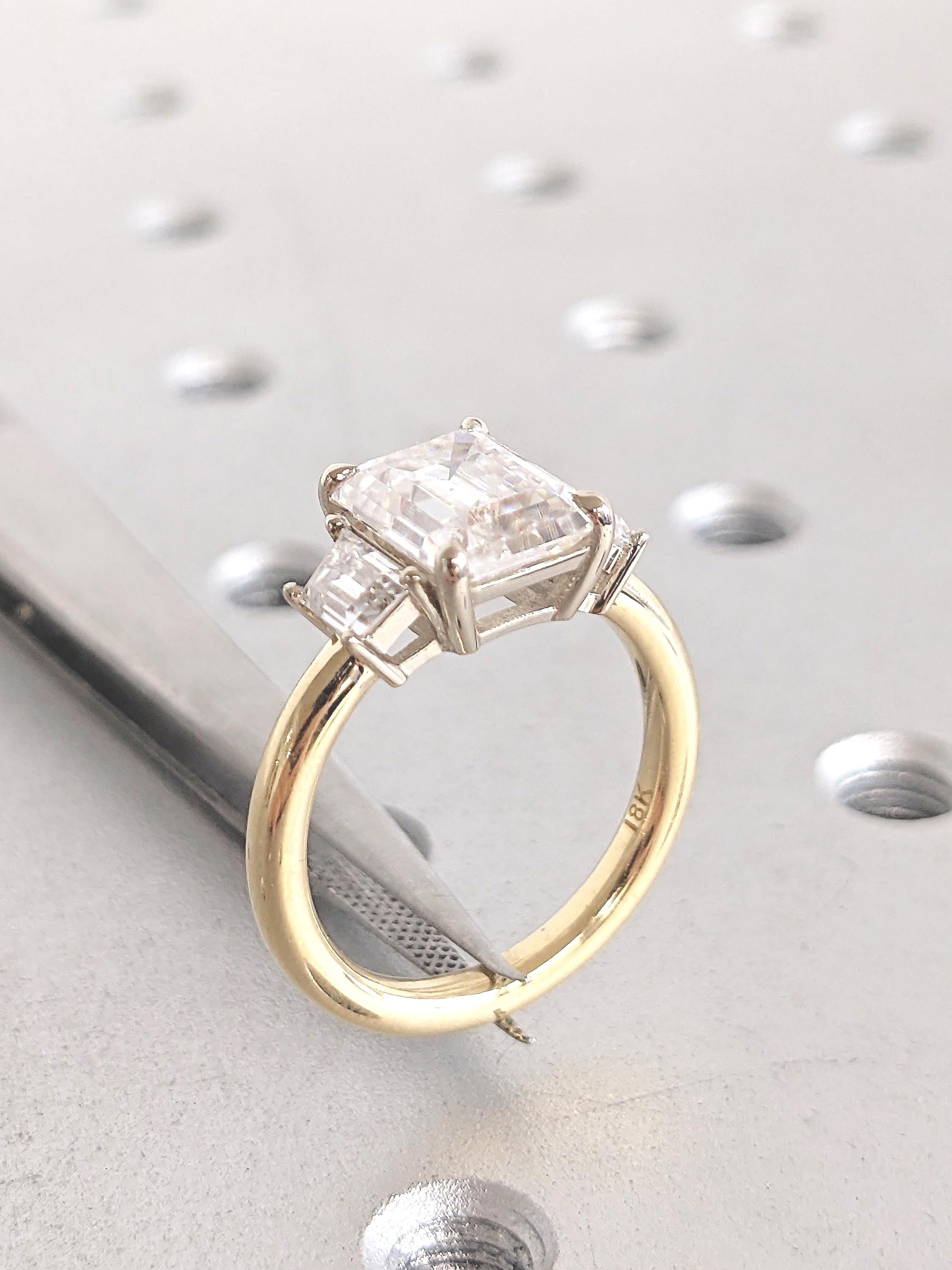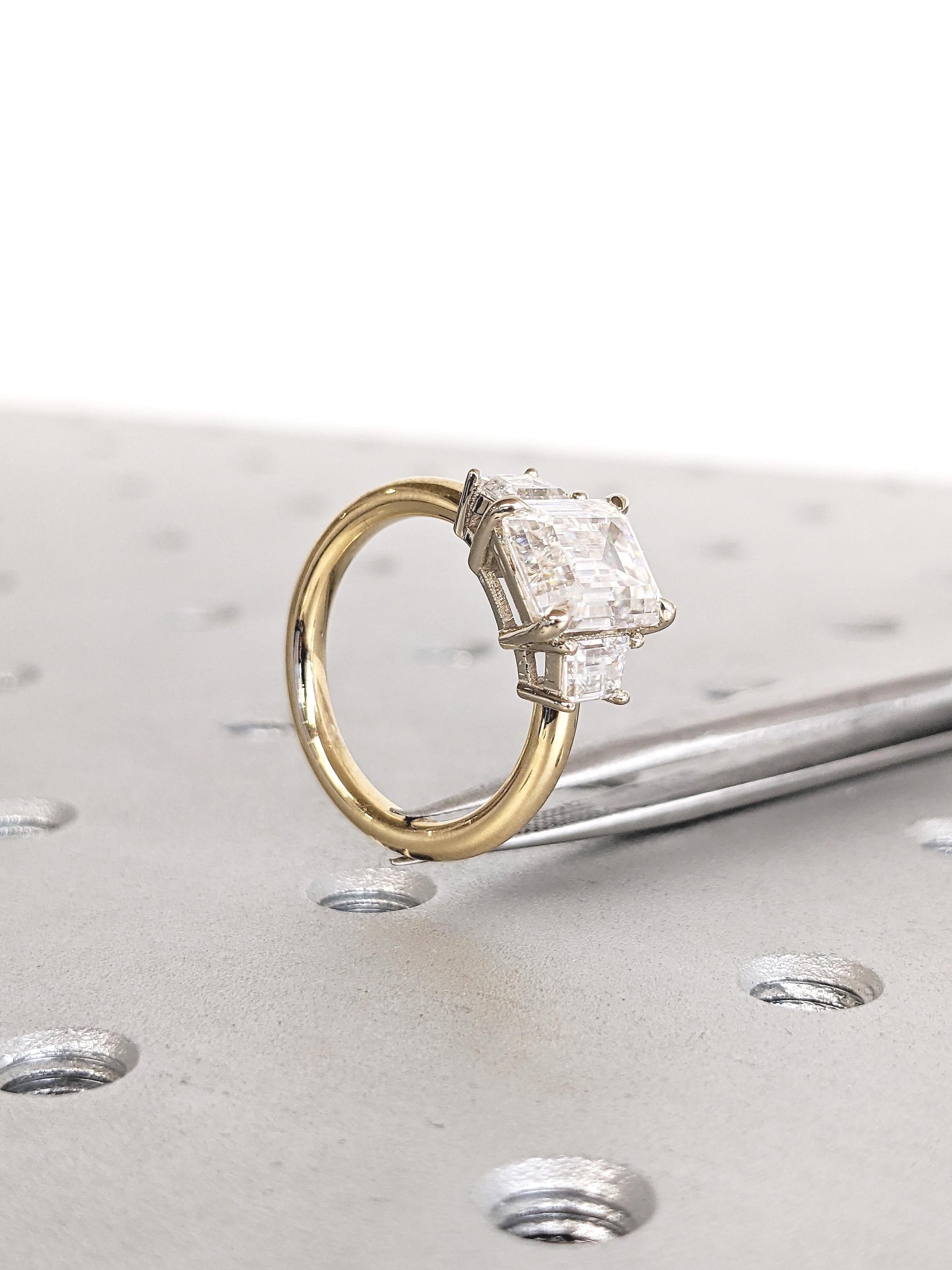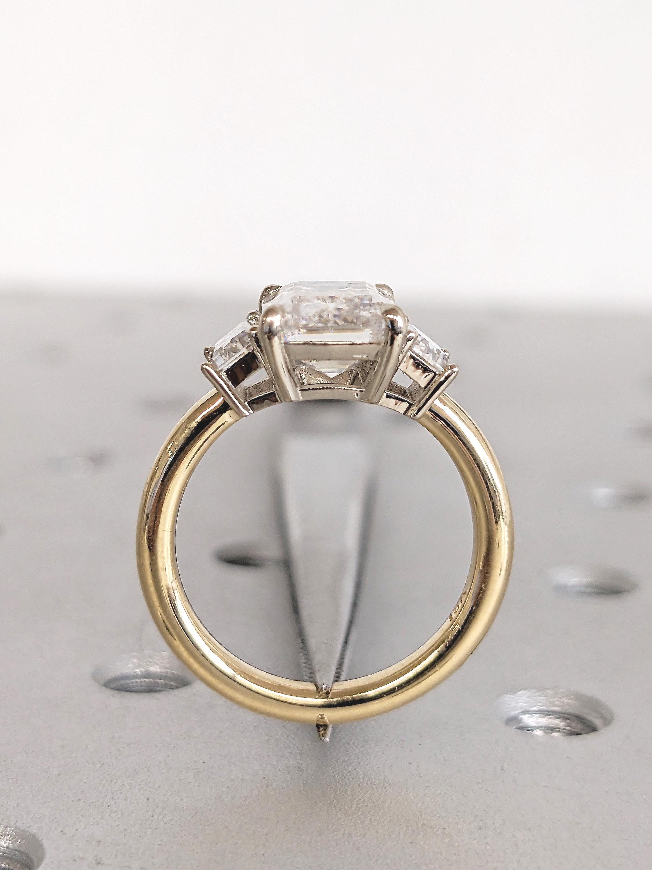Elegant and timeless, this two-tone three-stone moissanite engagement ring features an exquisite emerald-cut center stone flanked by two dazzling trapezoid-cut moissanite side stones. The contrast of metals enhances its sophisticated design, making it a perfect choice for celebrating your love in style.