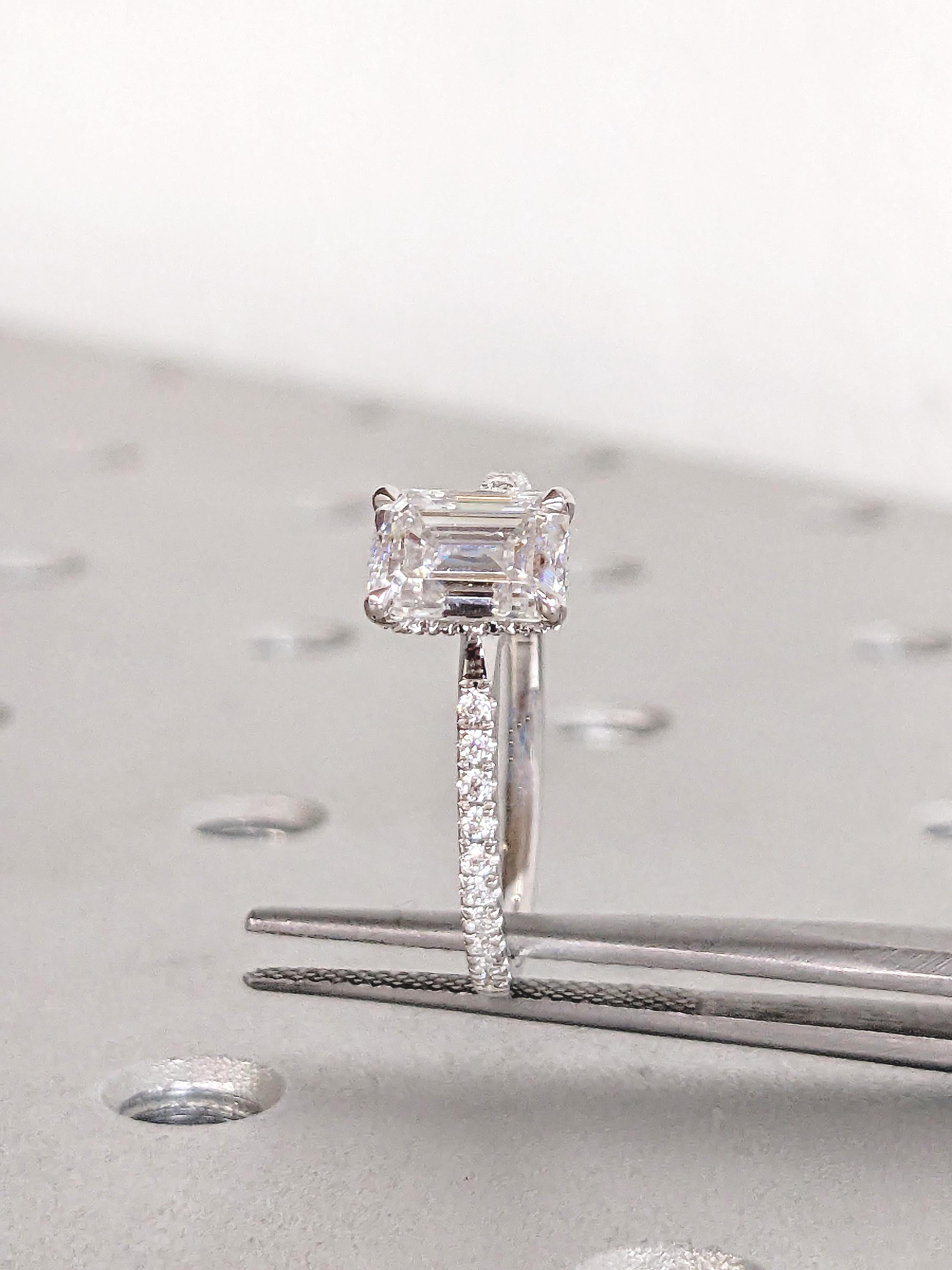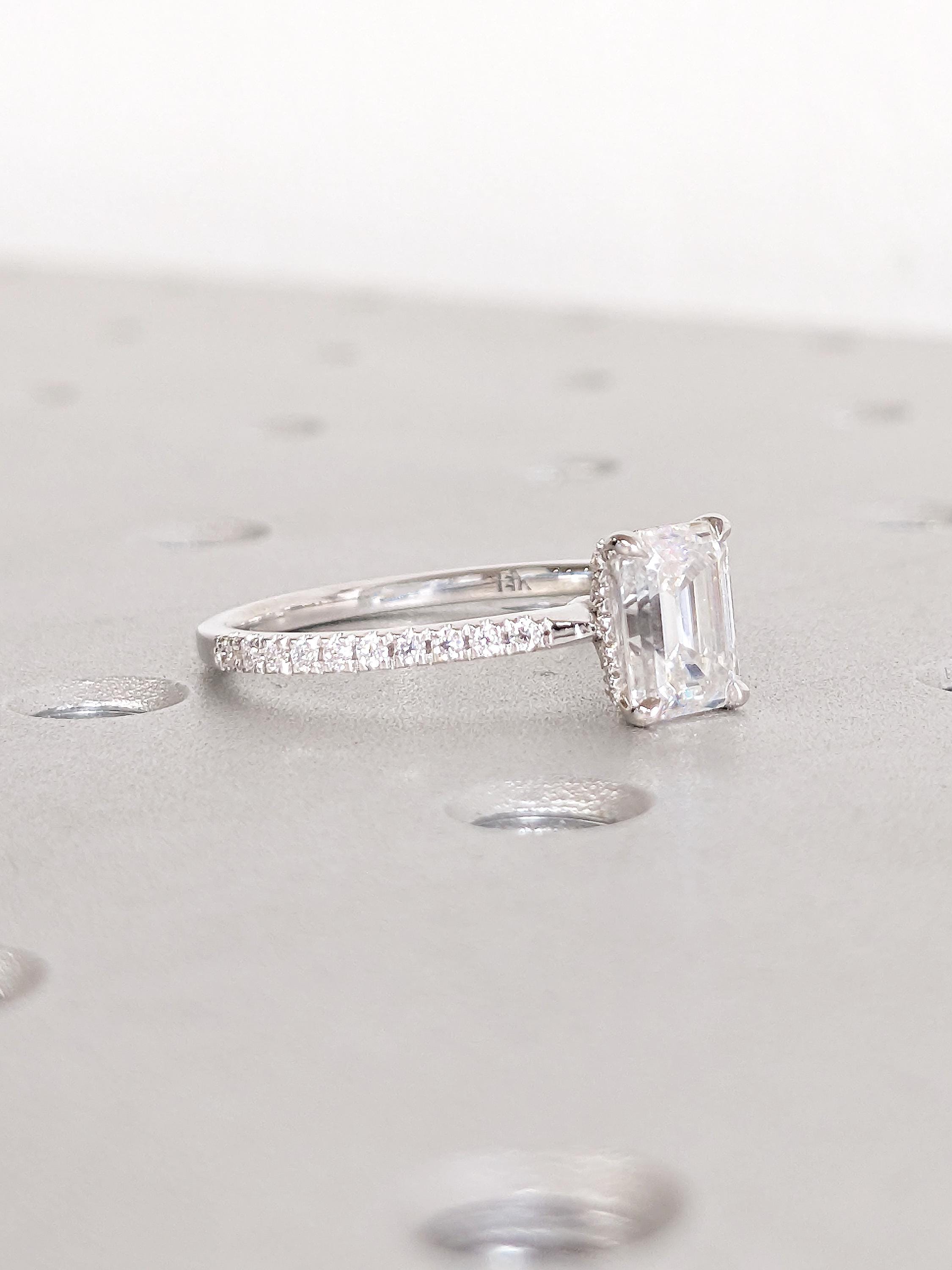 This emerald cut Moissanite engagement ring exudes timeless elegance, featuring a dazzling center stone secured in a refined setting. A hidden halo of sparkling gems adds brilliance from every angle, while the half eternity band enhances the design with continuous shimmer. Both the hidden halo and half eternity accents are available in your choice of Natural Diamonds or Moissanite, making this ring a truly customizable symbol of love.