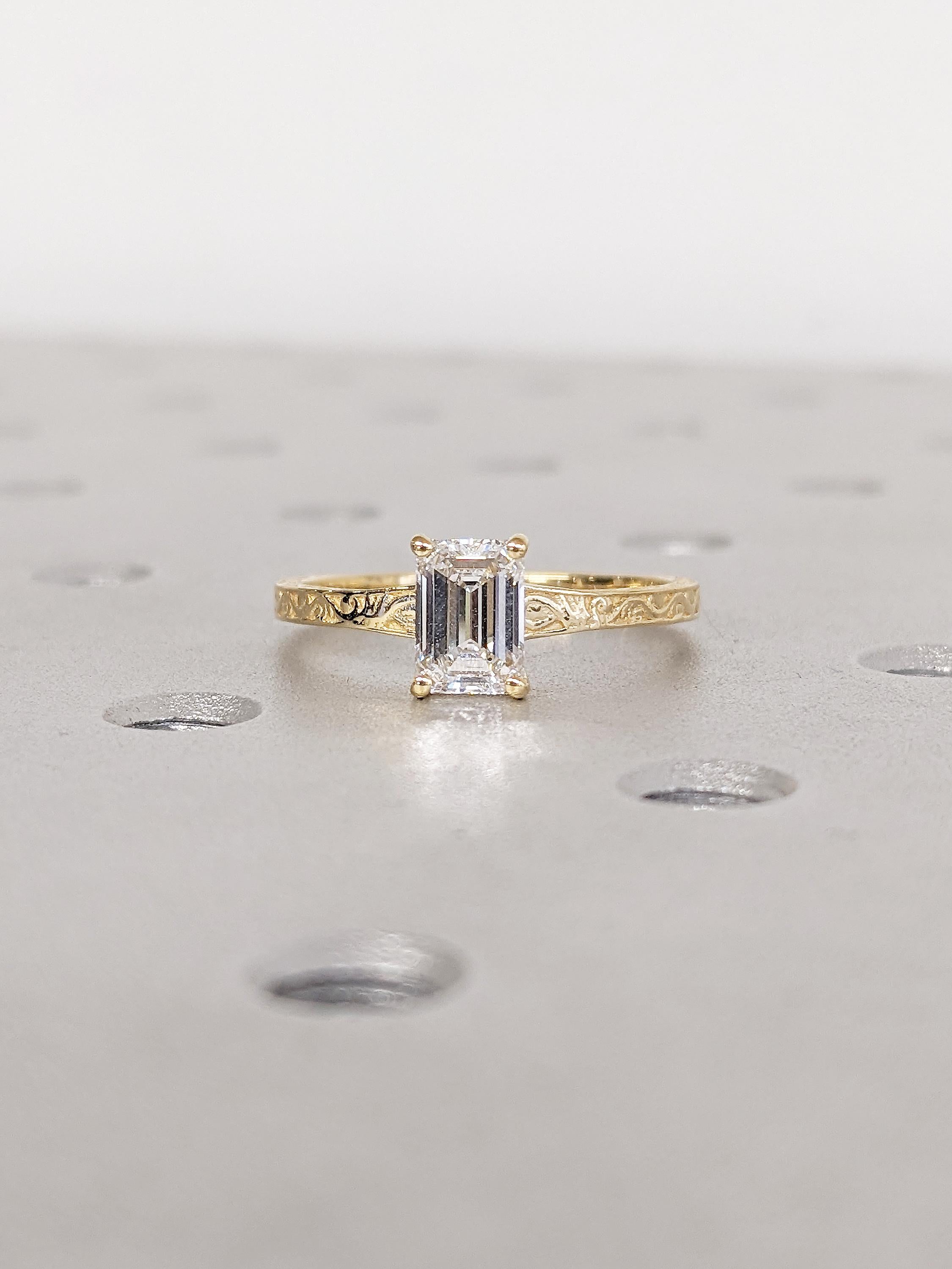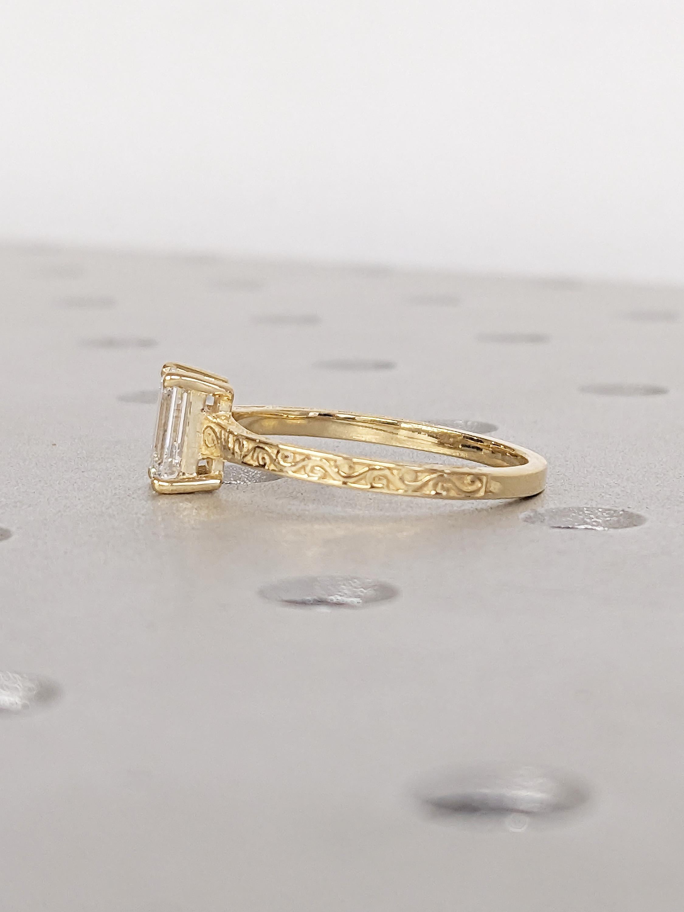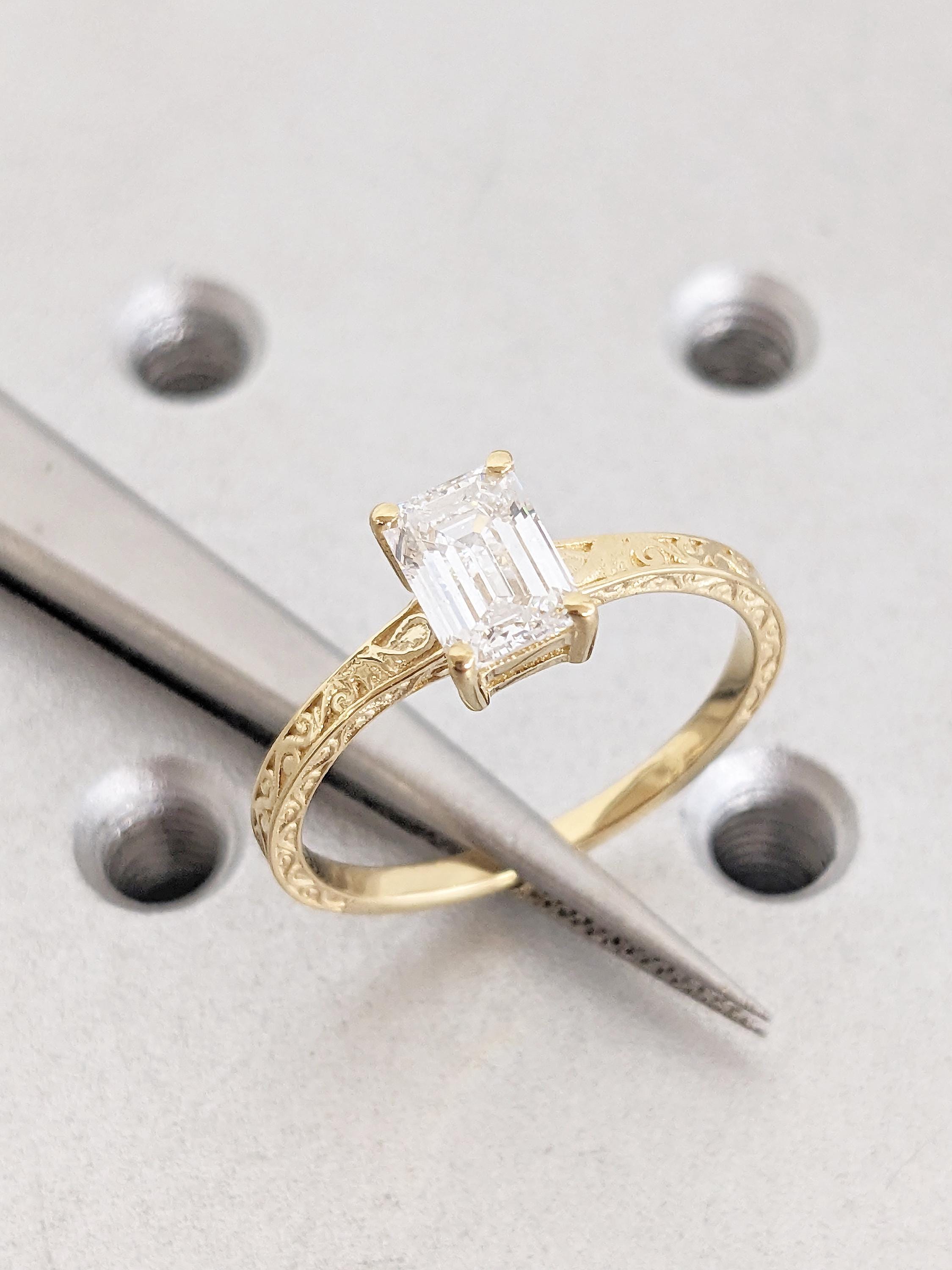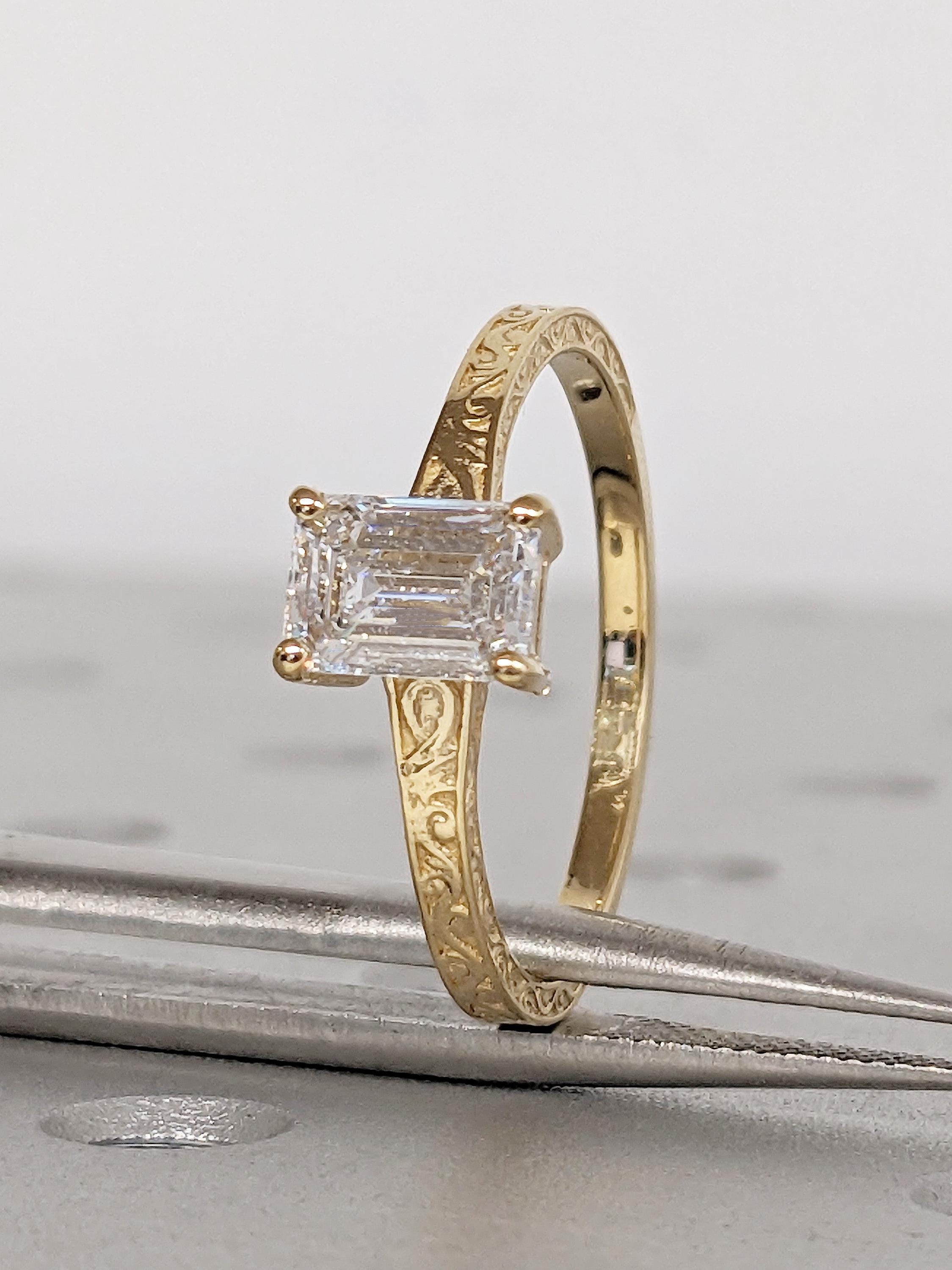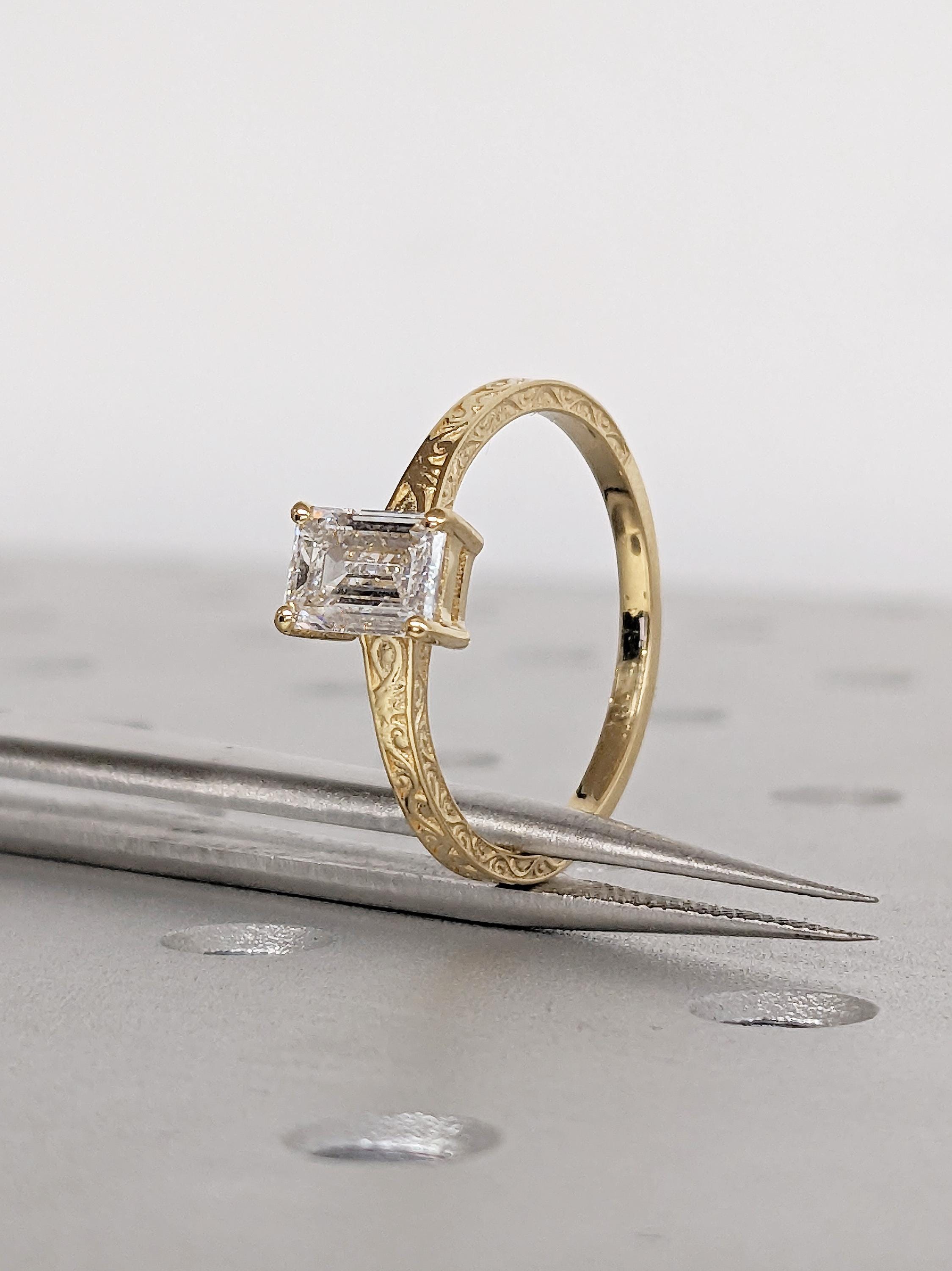 Emerald Cut Moissanite Ring, Vintage Engagement Ring, 18k Solid Gold Solitaire Rings, Classic Filigree Hand Carved Promise Ring for Her