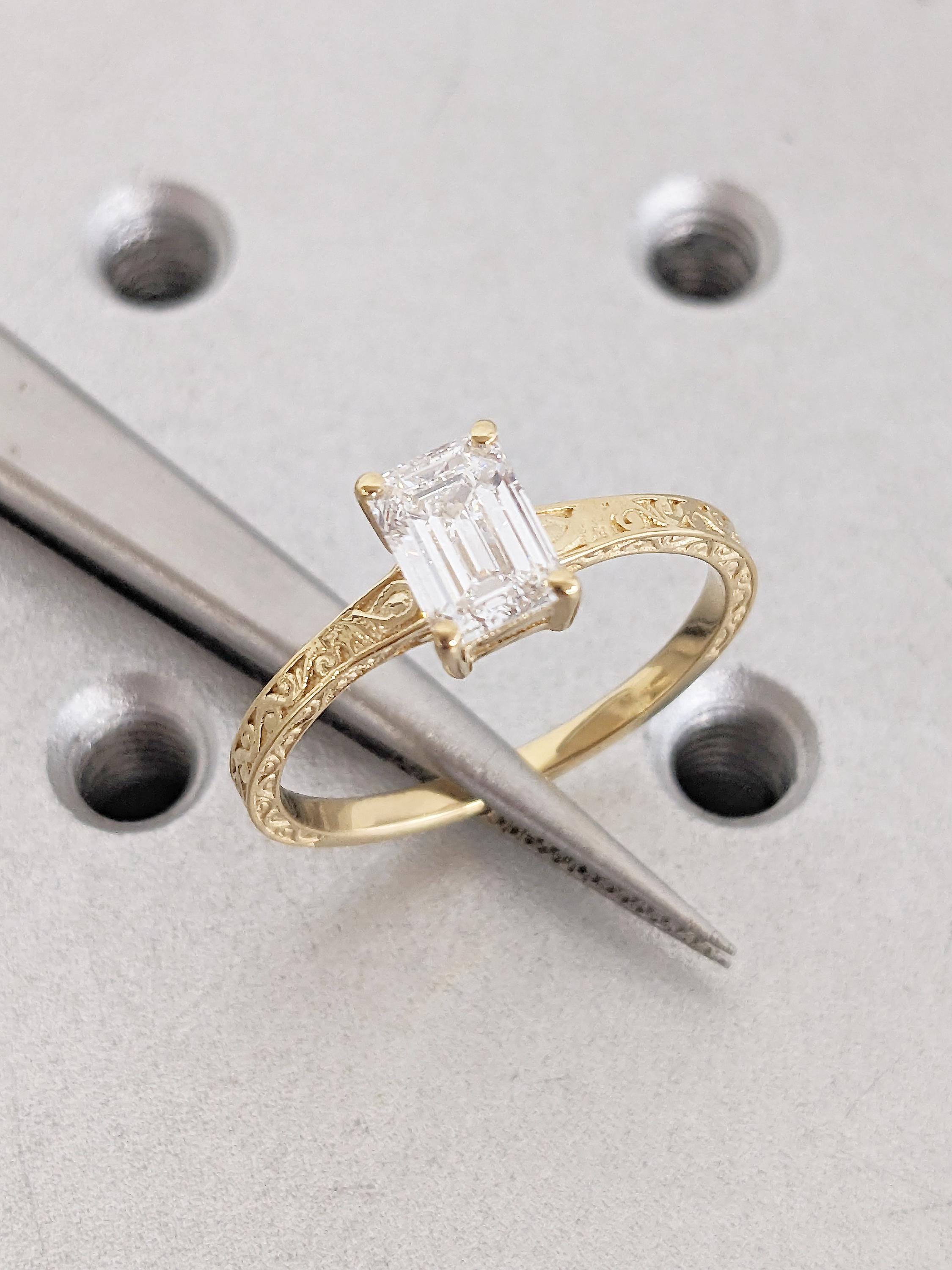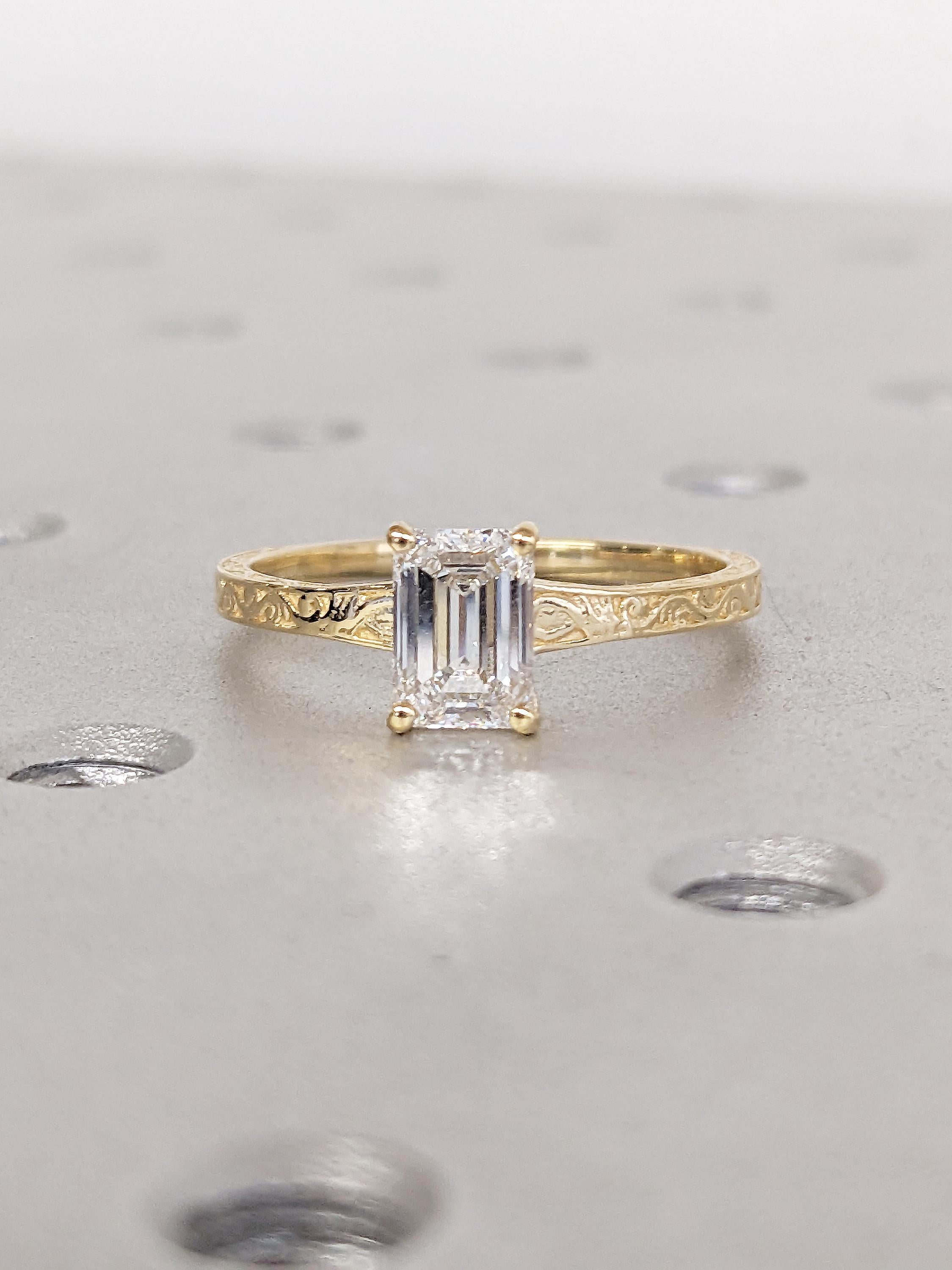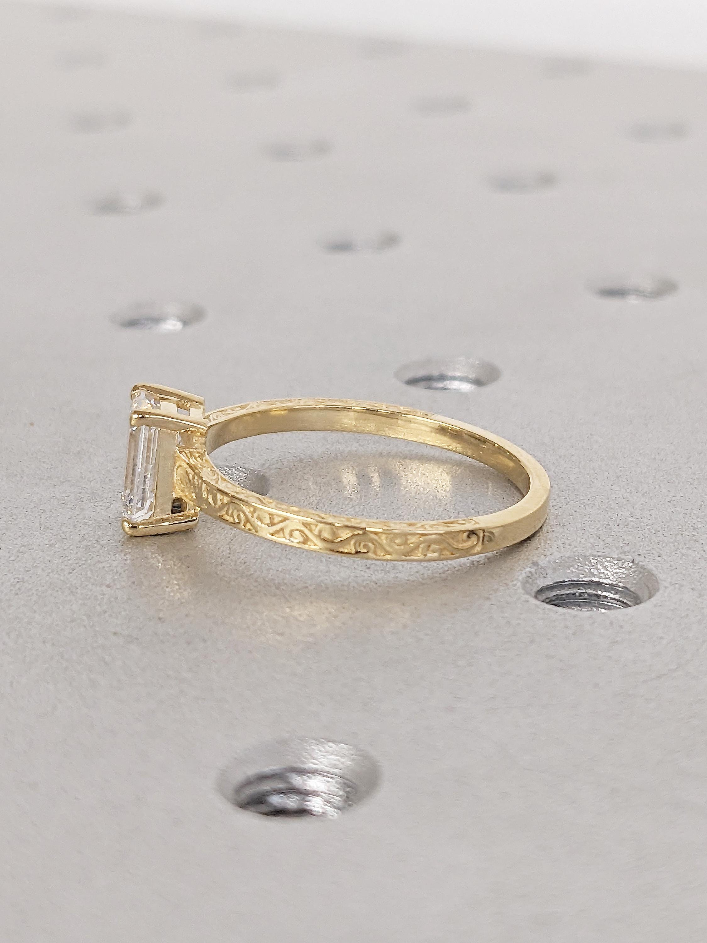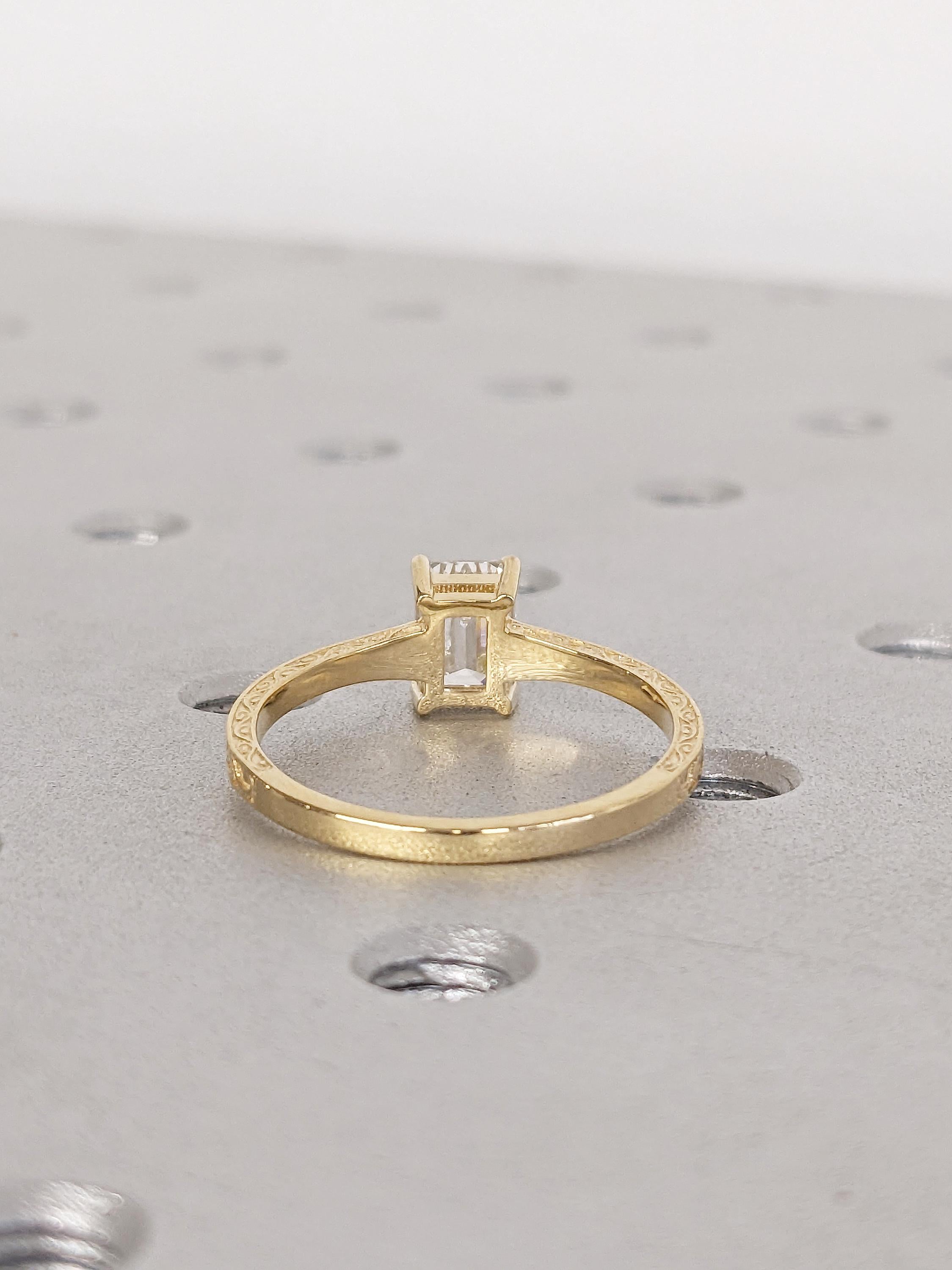 Emerald Cut Moissanite Ring, Vintage Engagement Ring, 18k Solid Gold Solitaire Rings, Classic Filigree Hand Carved Promise Ring for Her