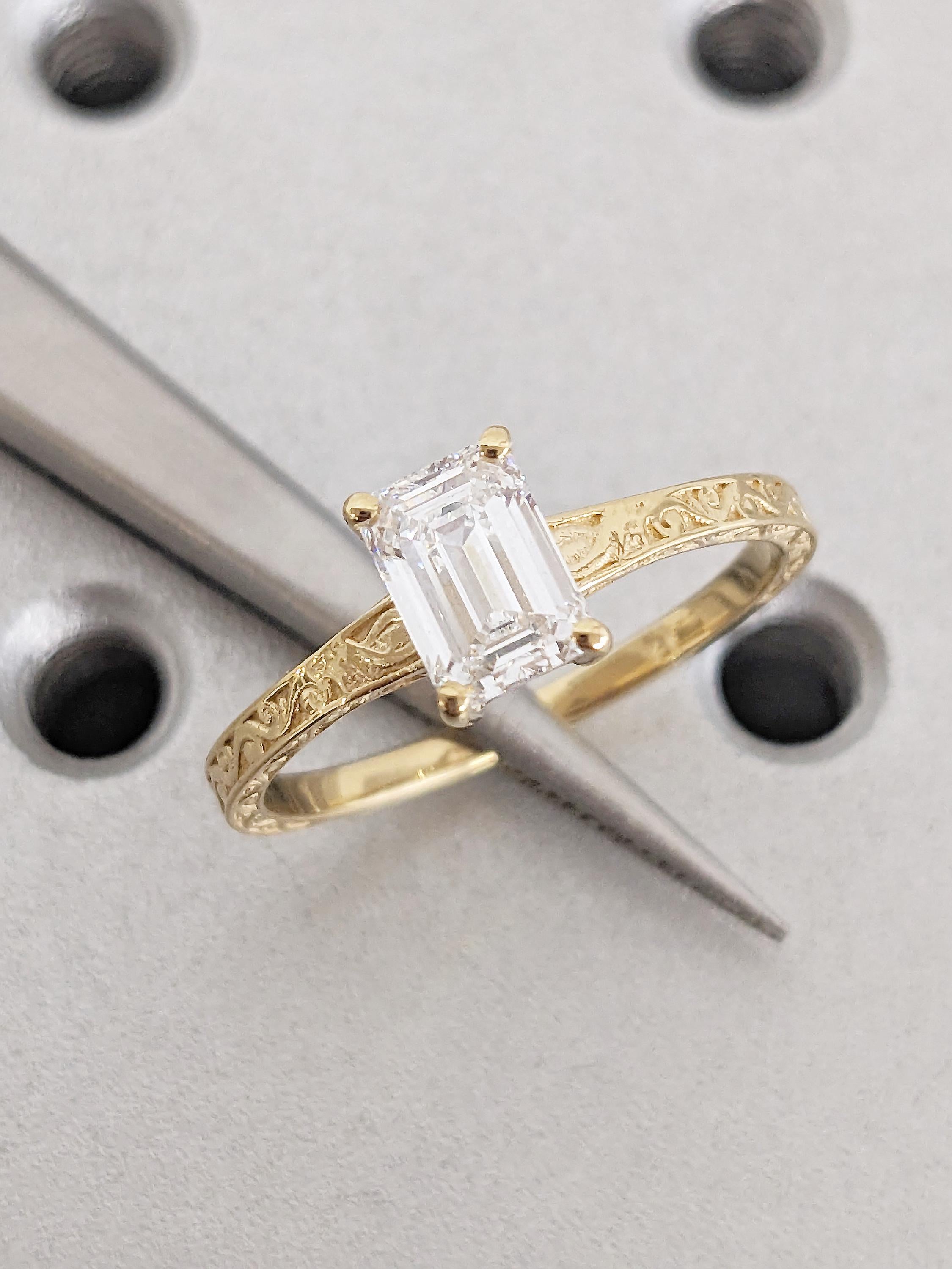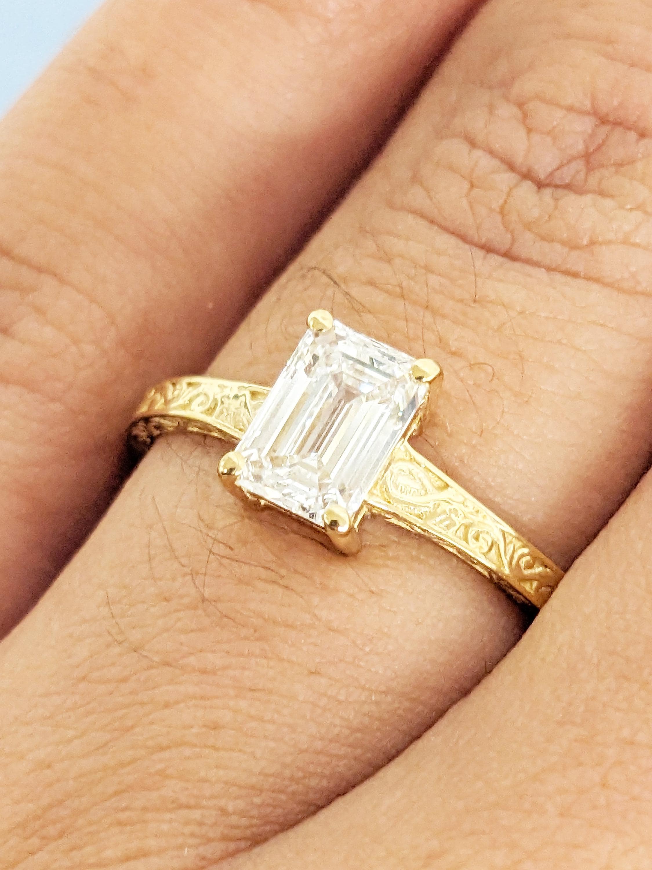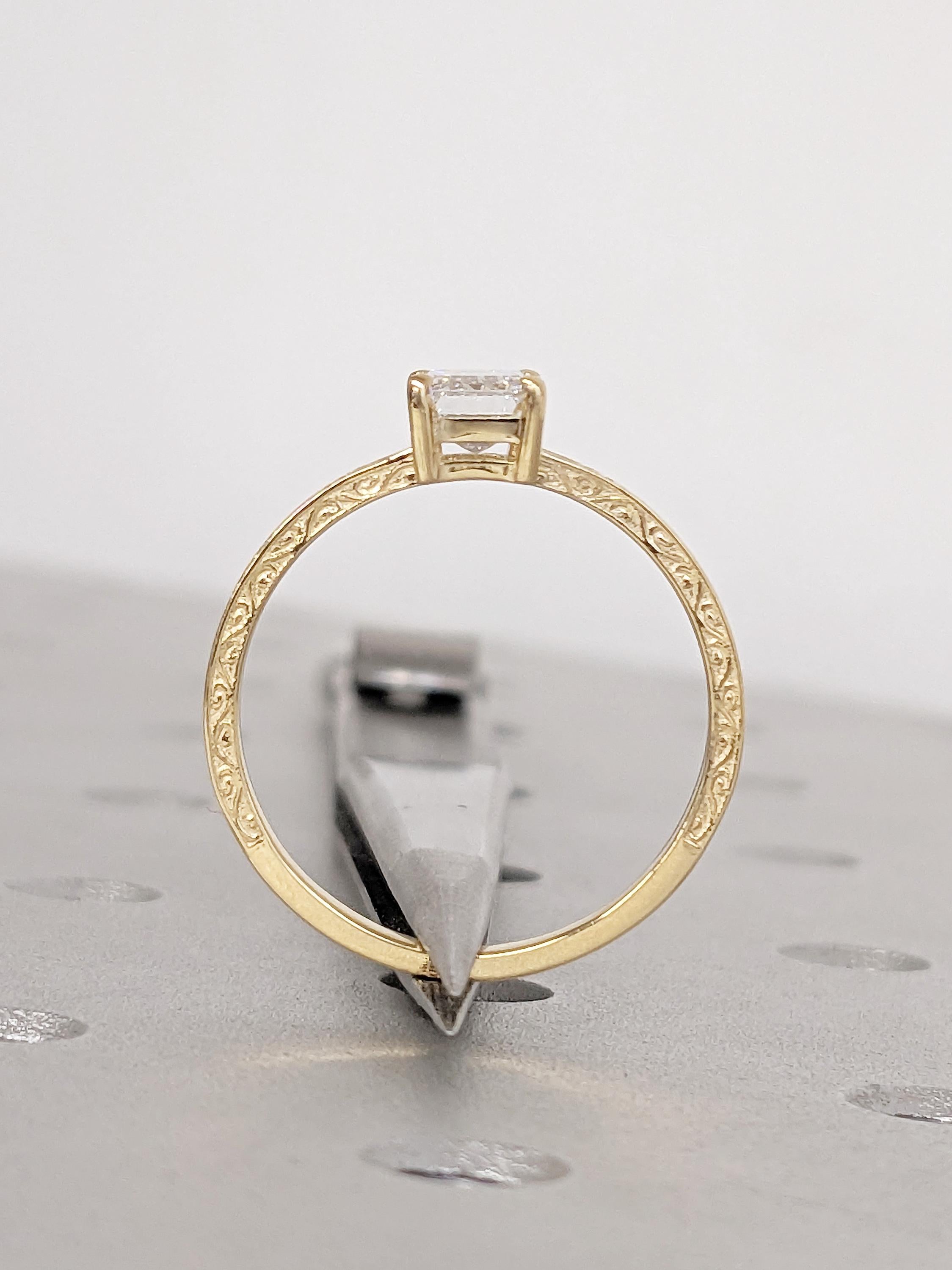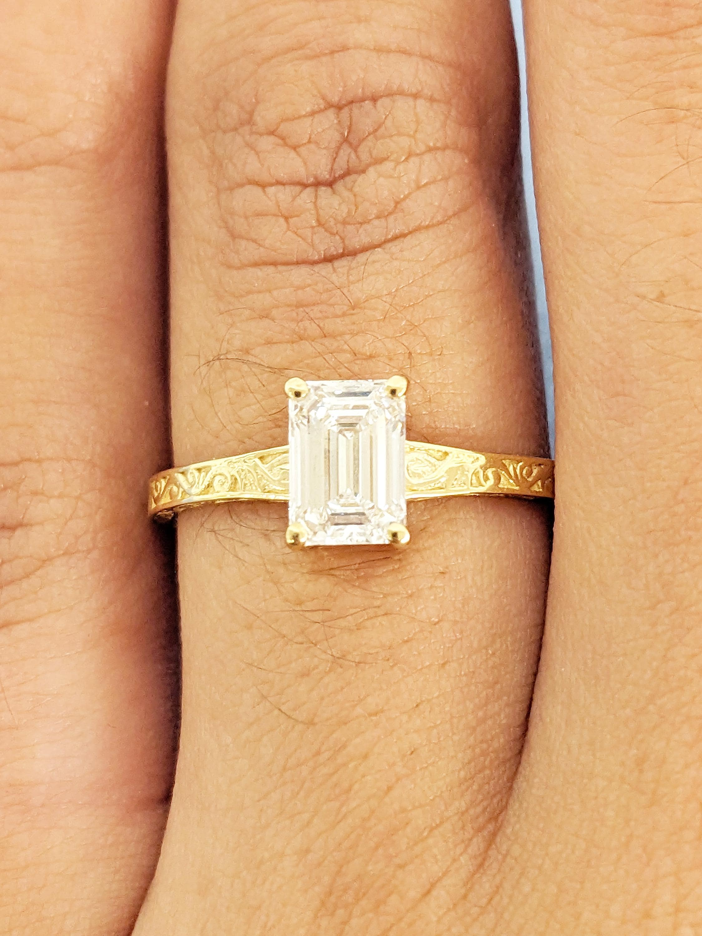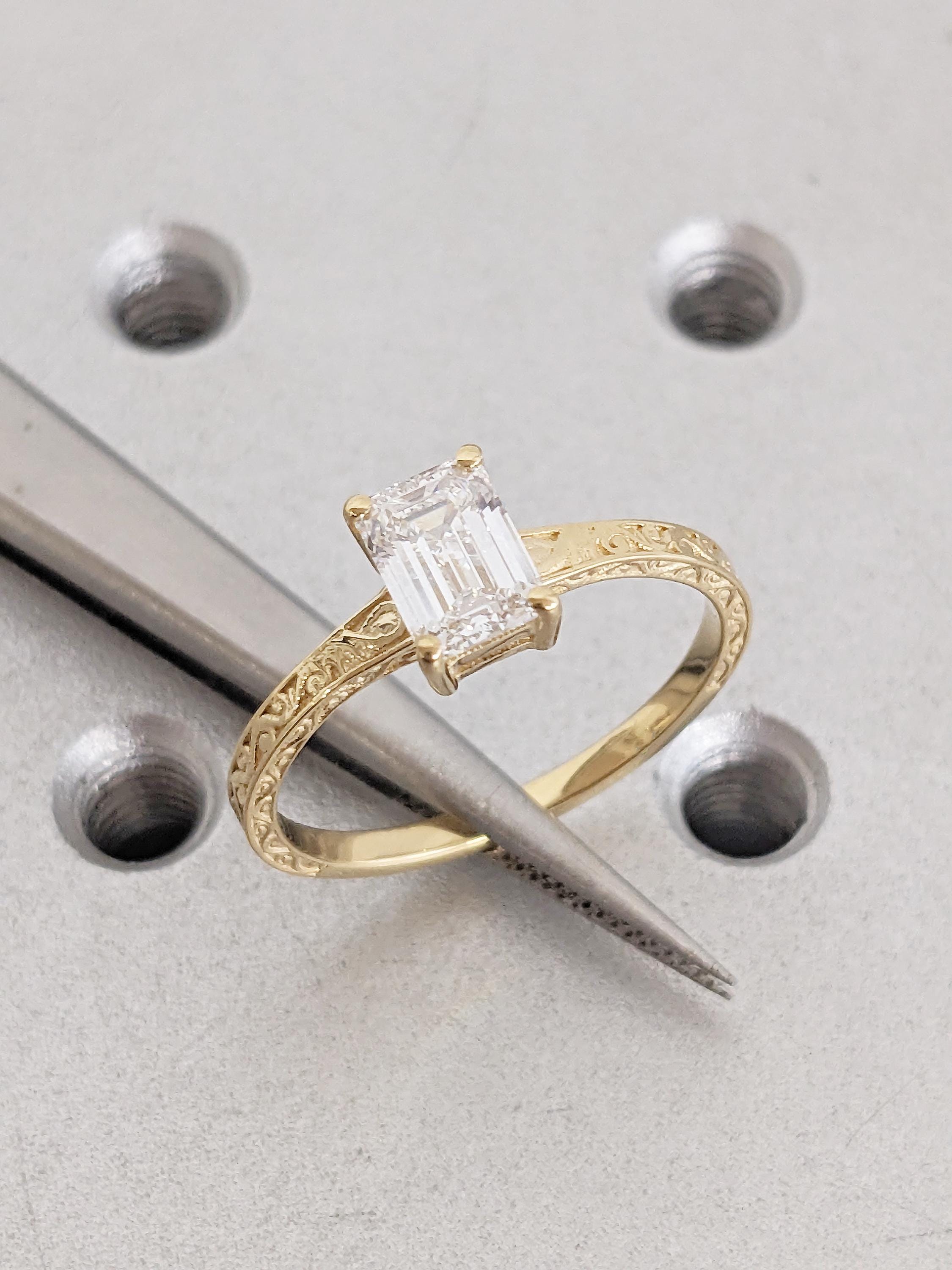 Emerald Cut Moissanite Ring, Vintage Engagement Ring, 18k Solid Gold Solitaire Rings, Classic Filigree Hand Carved Promise Ring for Her