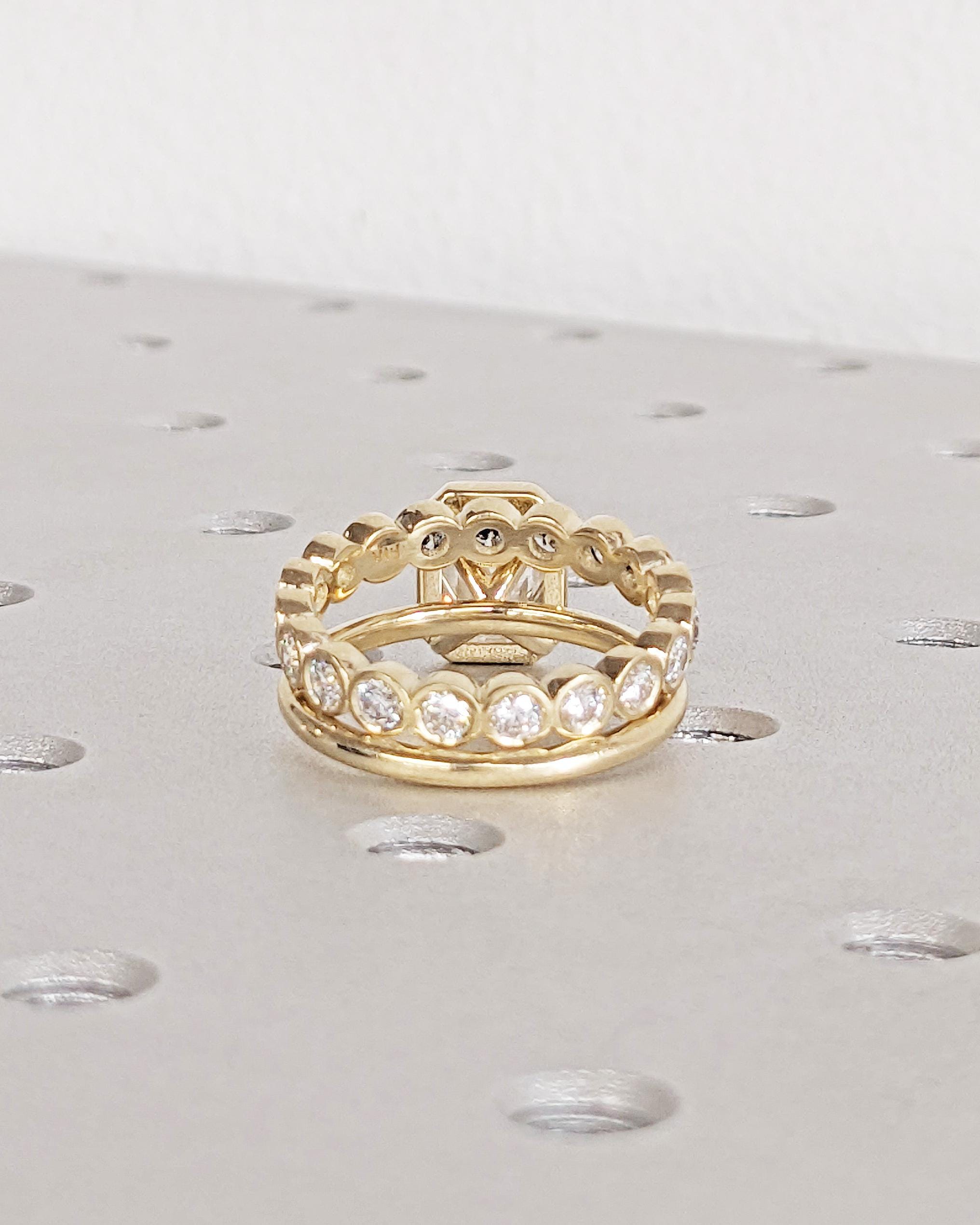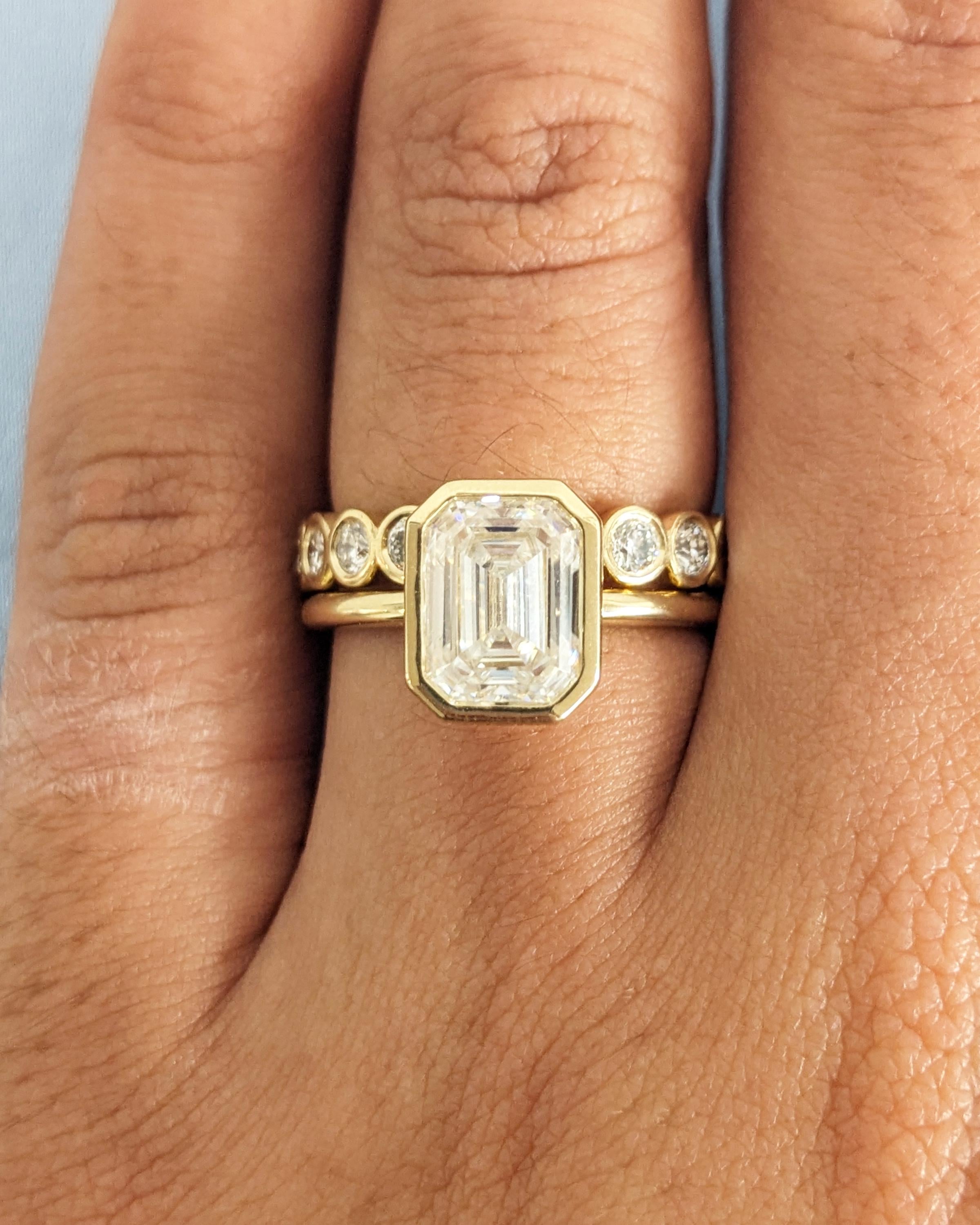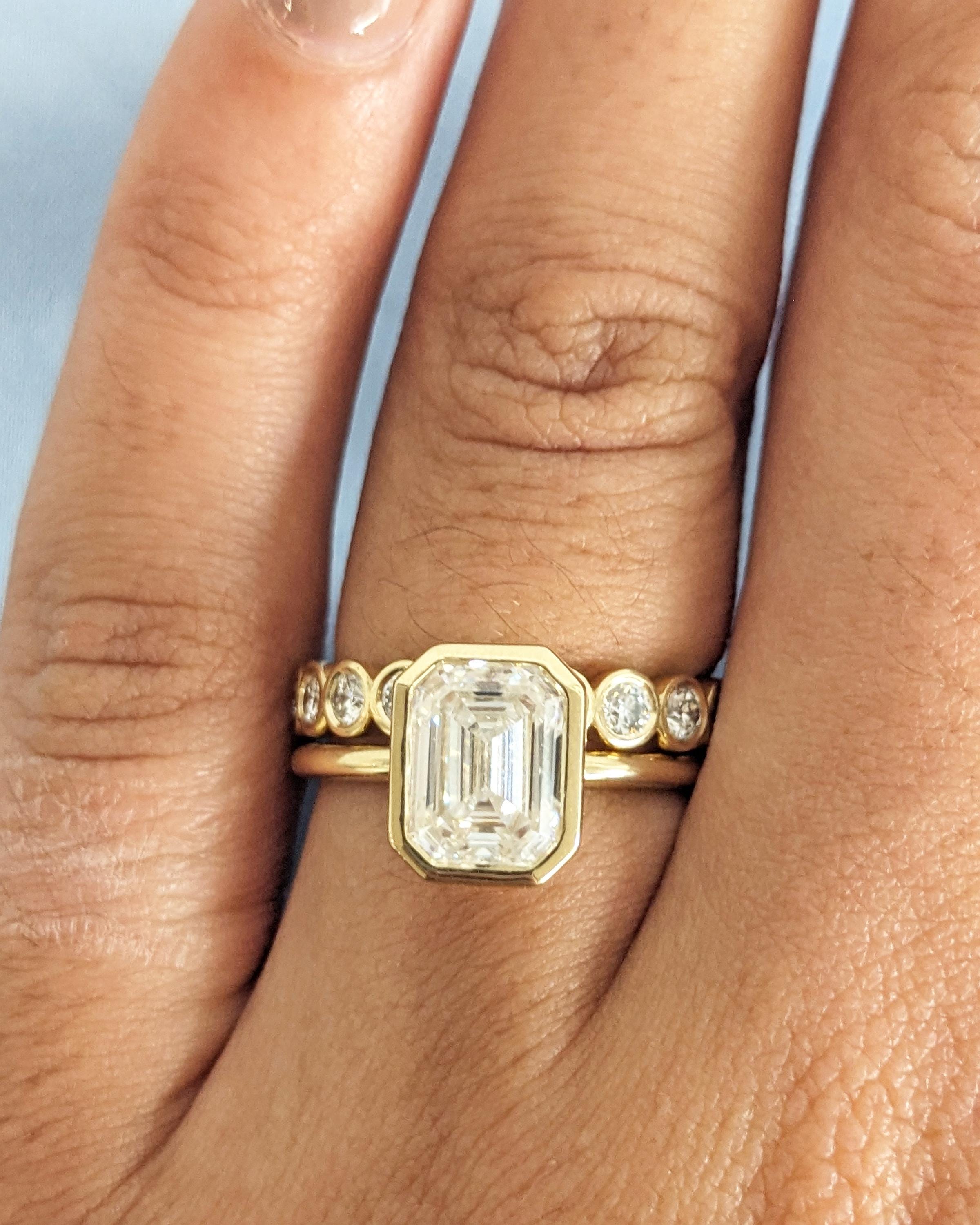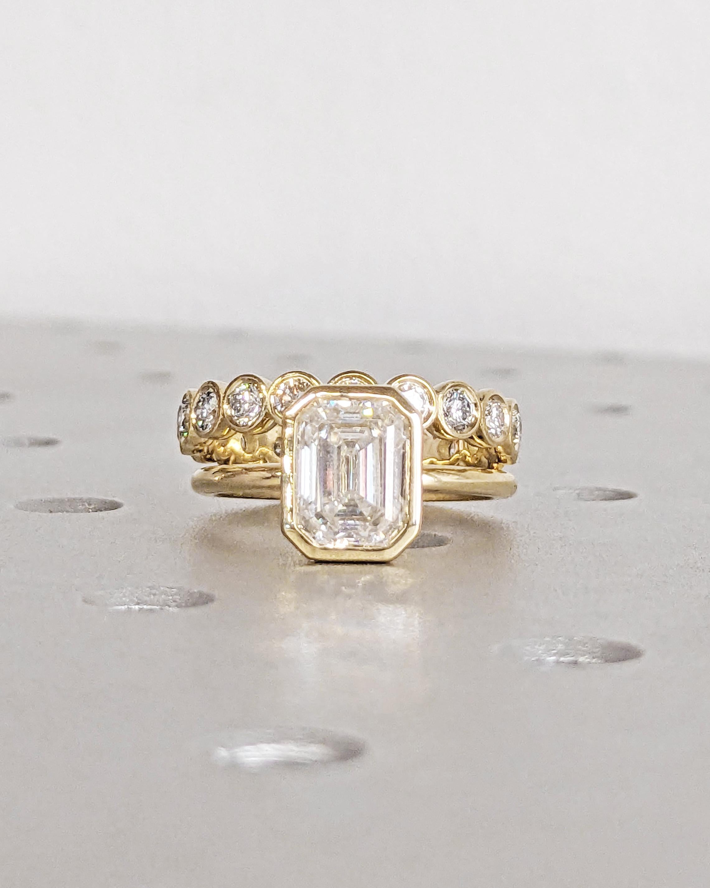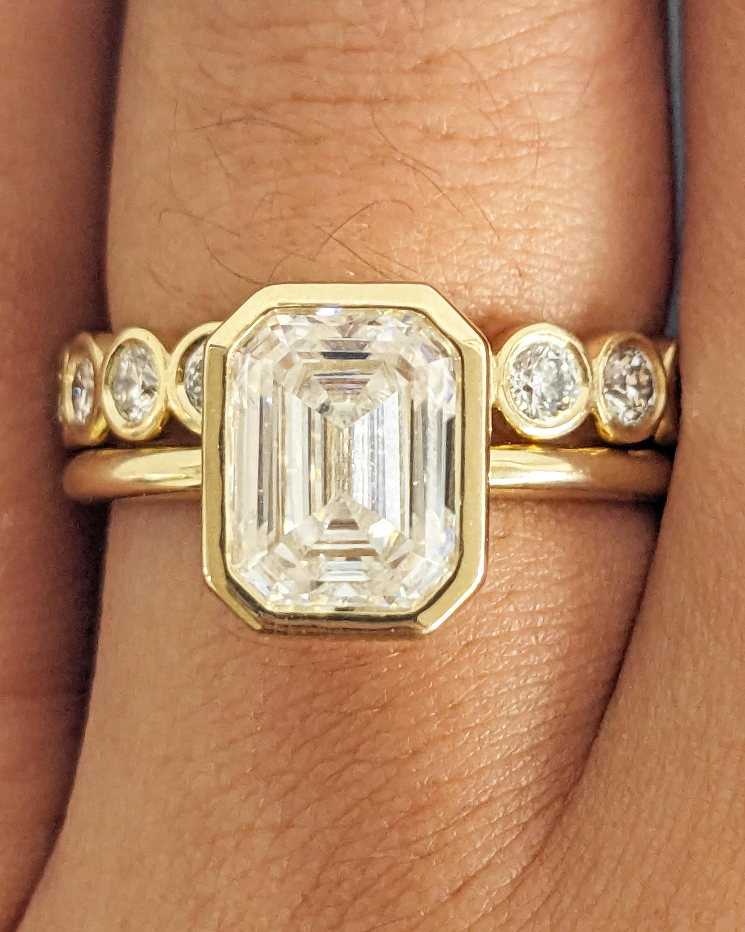 Elevate your style with our exquisite Moissanite engagement ring, showcasing a timeless emerald cut in a bezel setting on a dainty rounded band. Pair it seamlessly with our full eternity band for a flawless combination. Together, they offer a timeless look with a modern twist, perfect for vintage or art deco lovers. Available as a two-piece set or purchase the engagement ring by itself.