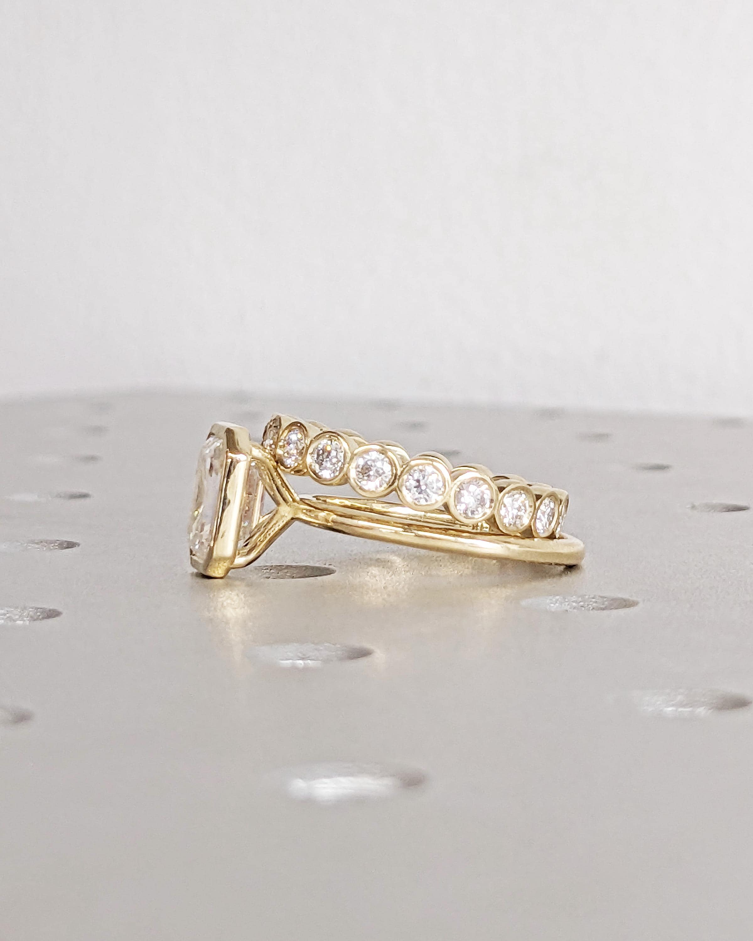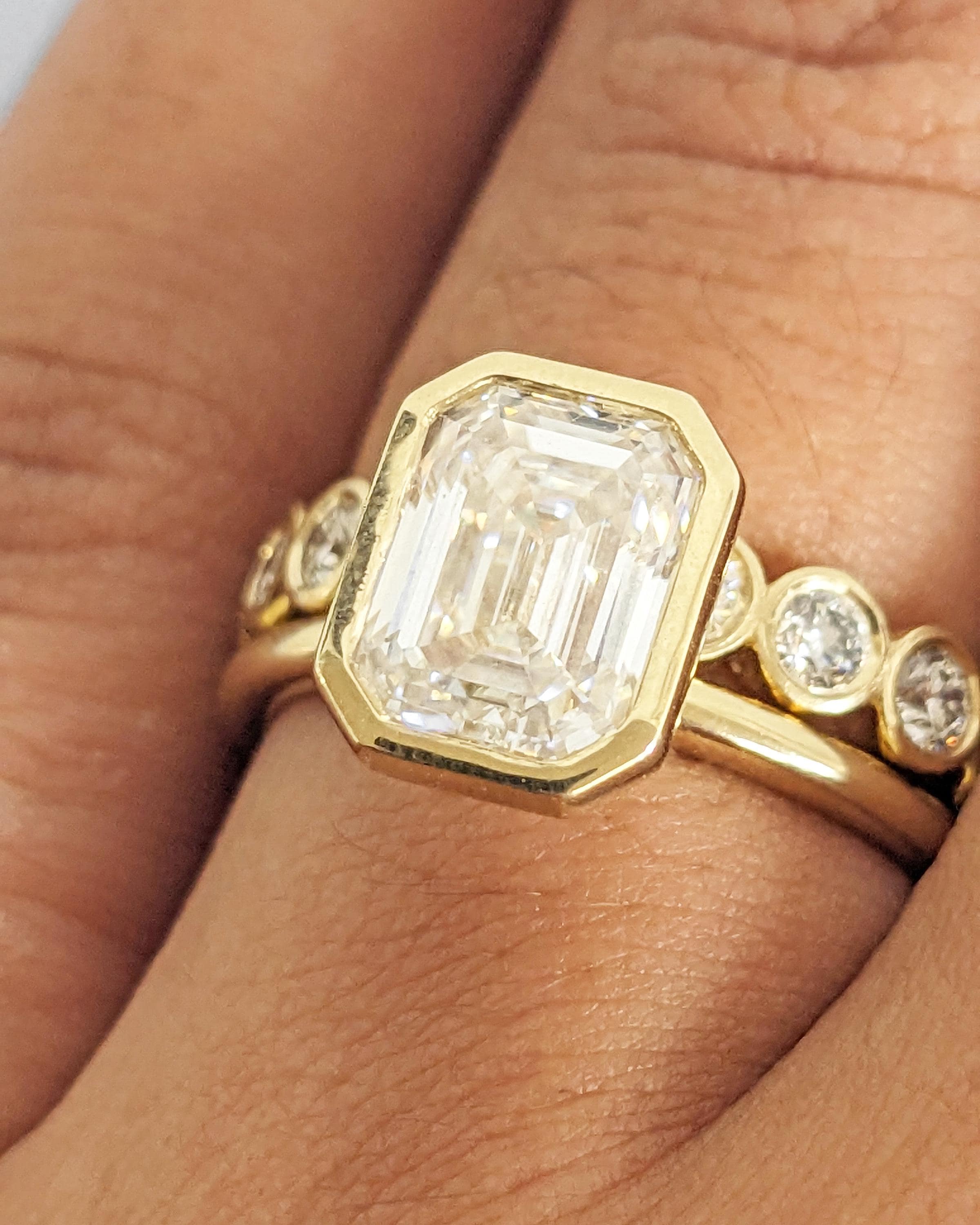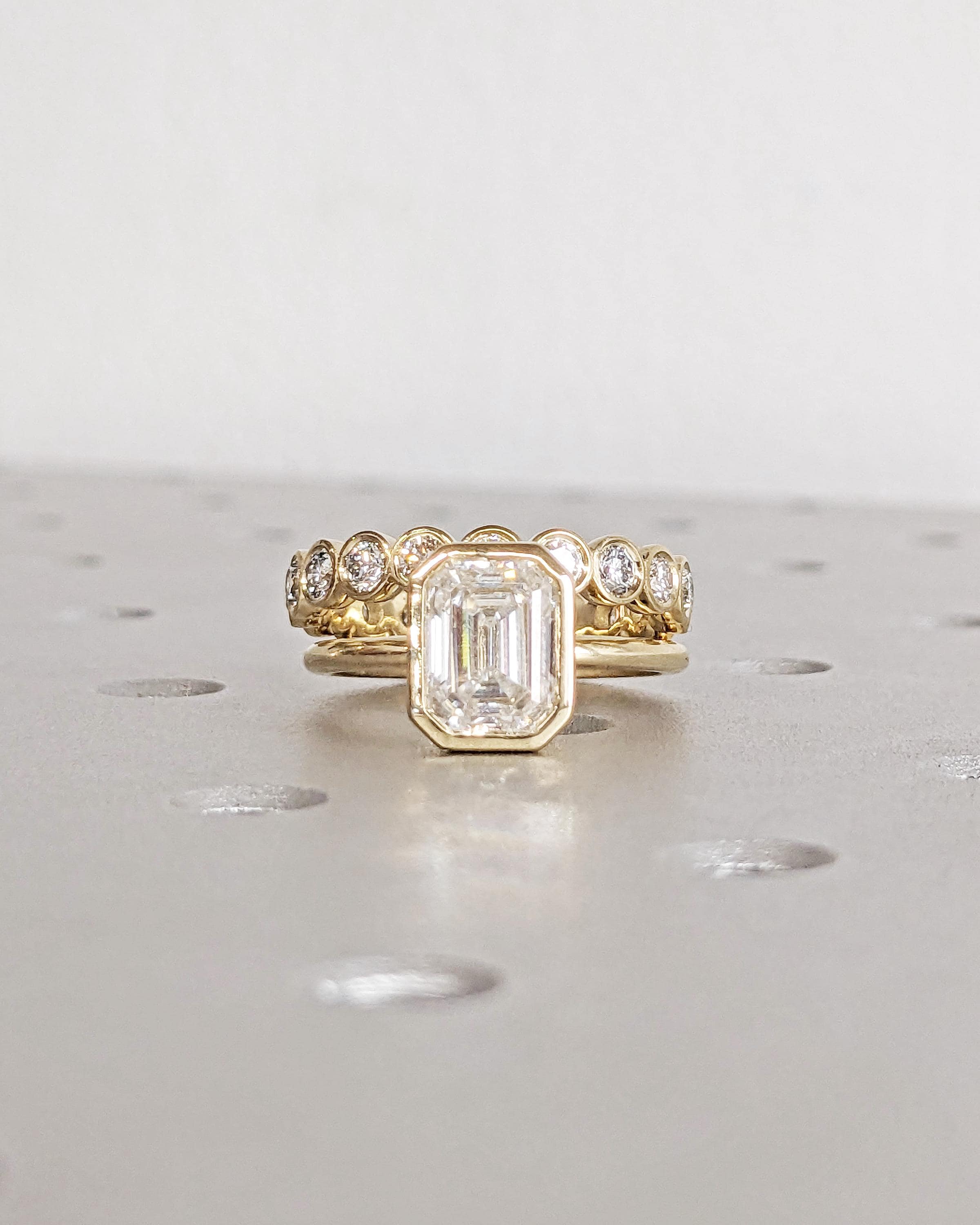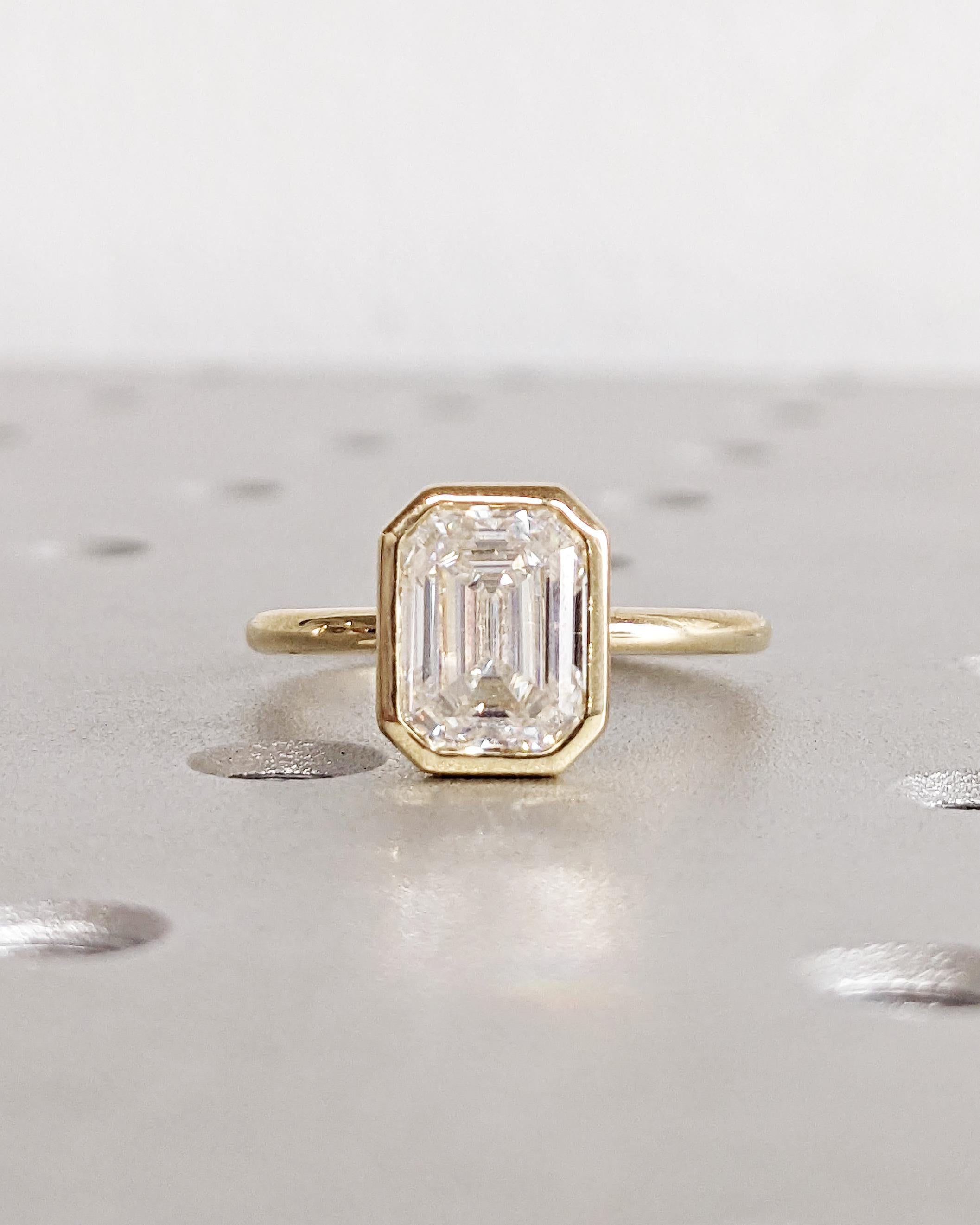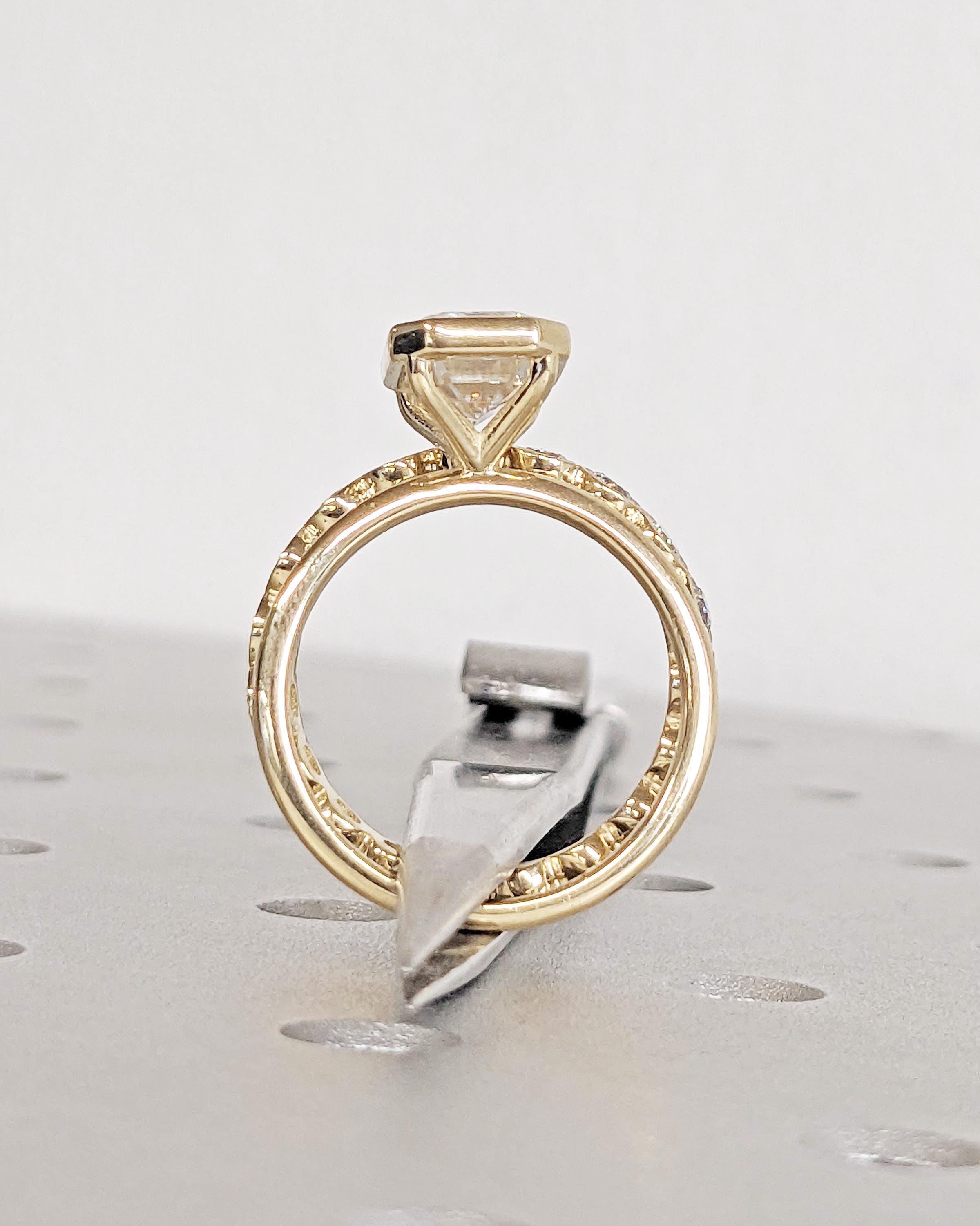 Elevate your style with our exquisite Moissanite engagement ring, showcasing a timeless emerald cut in a bezel setting on a dainty rounded band. Pair it seamlessly with our full eternity band for a flawless combination. Together, they offer a timeless look with a modern twist, perfect for vintage or art deco lovers. Available as a two-piece set or purchase the engagement ring by itself.
