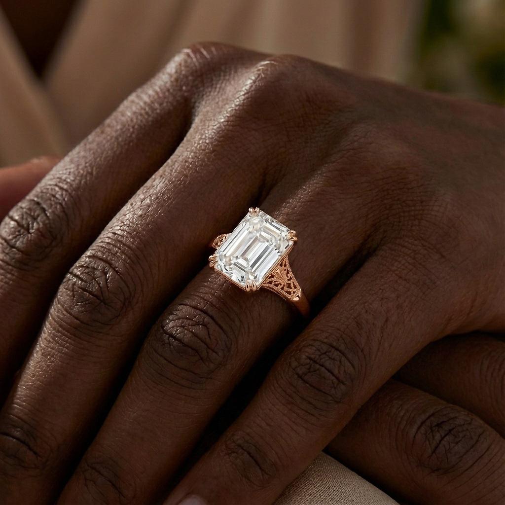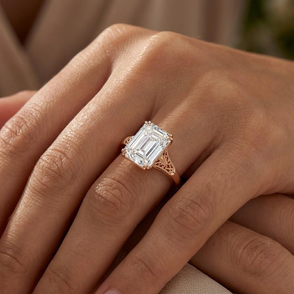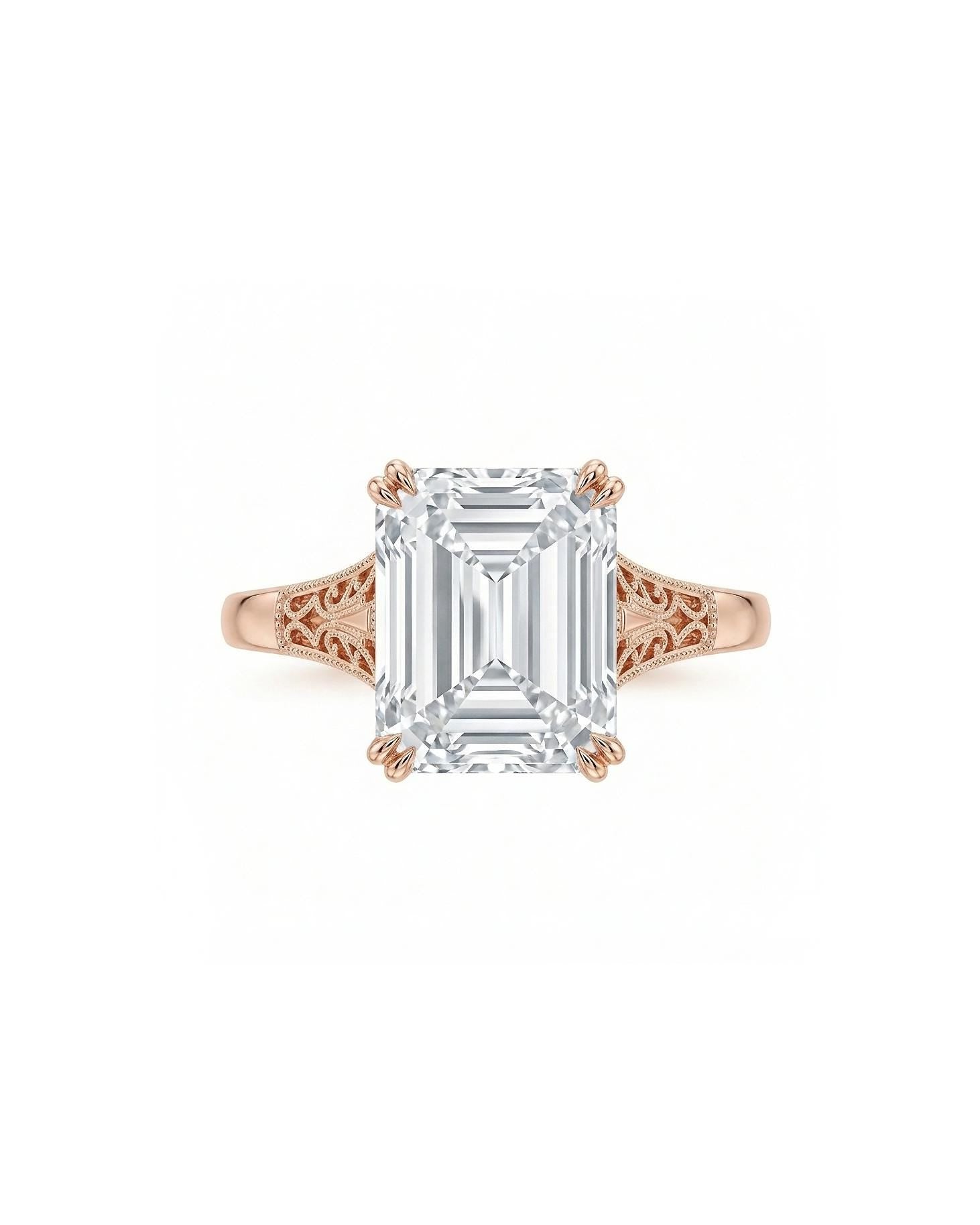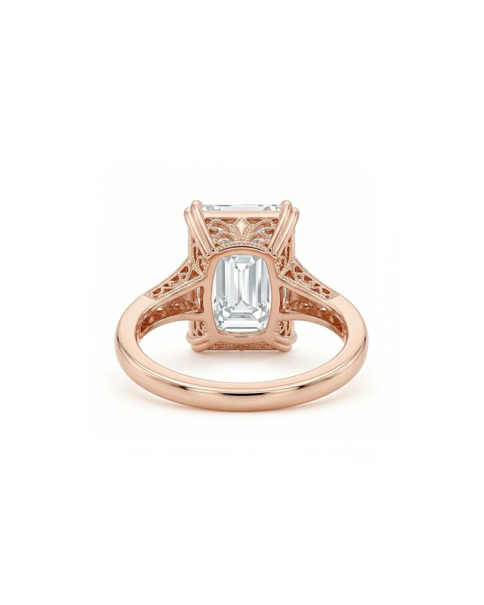 Emerald cut Moissanite Vintage Engagement Ring | Solid Rose Gold Solitaire Ring | Handmade Filigree Wedding Band for Women