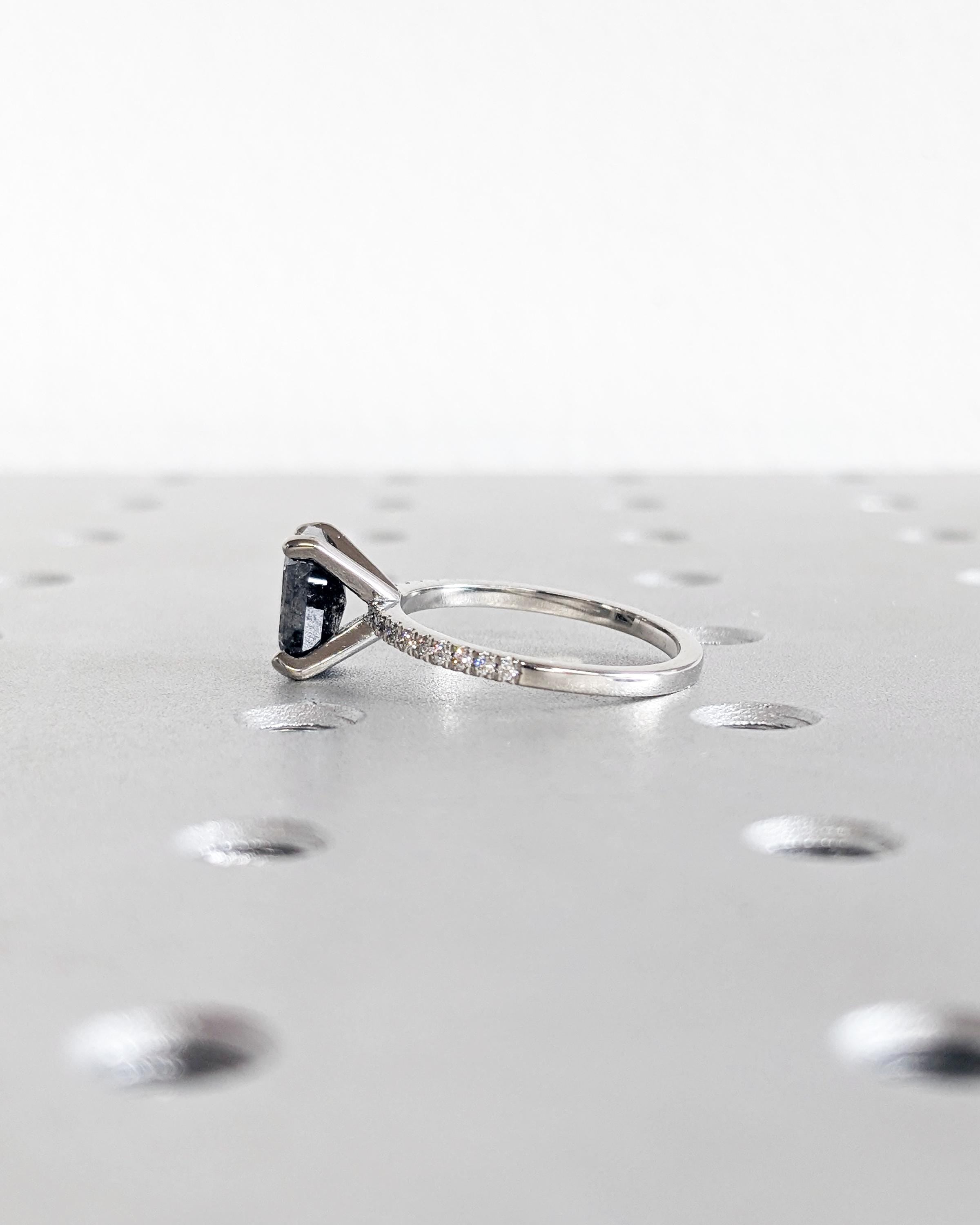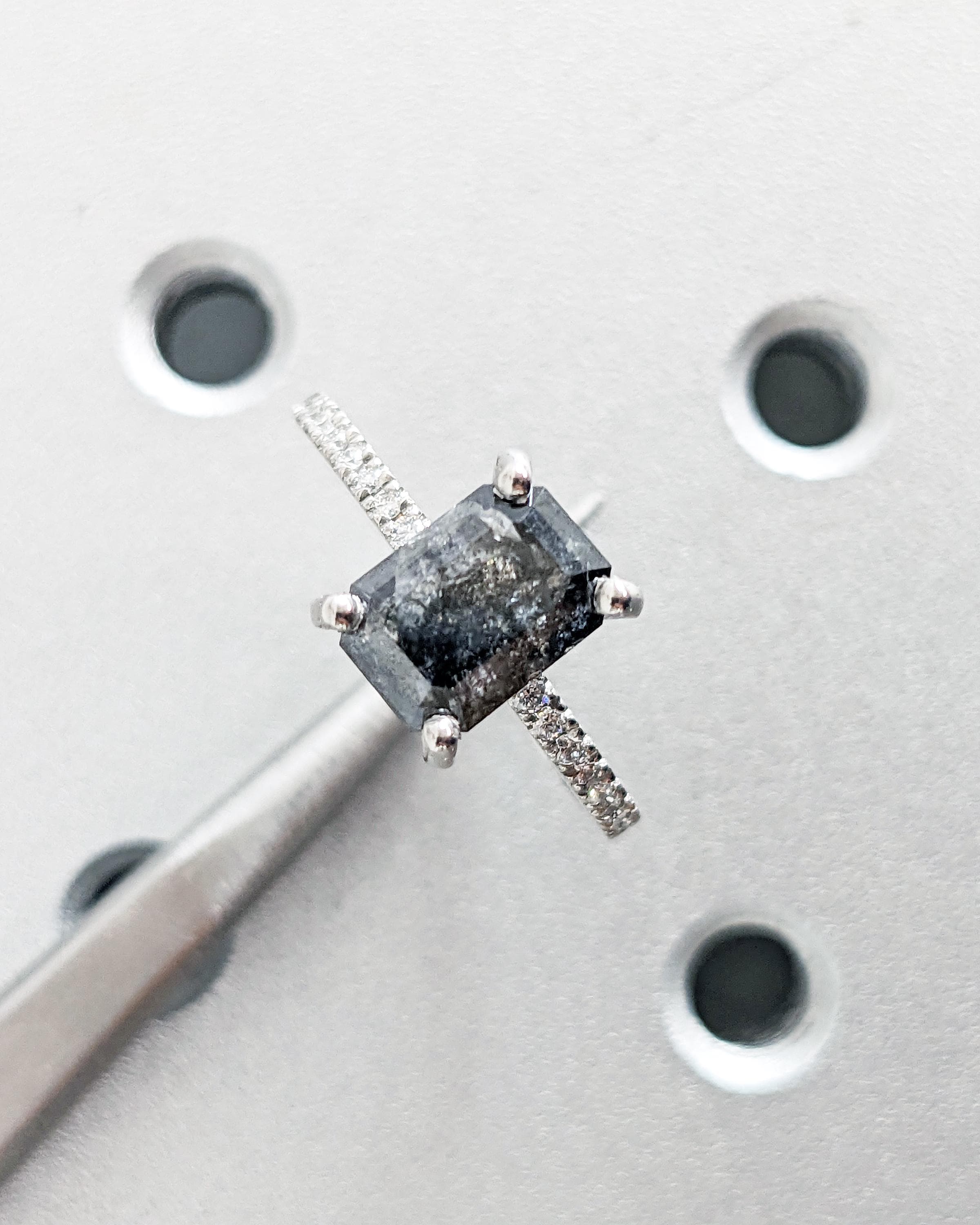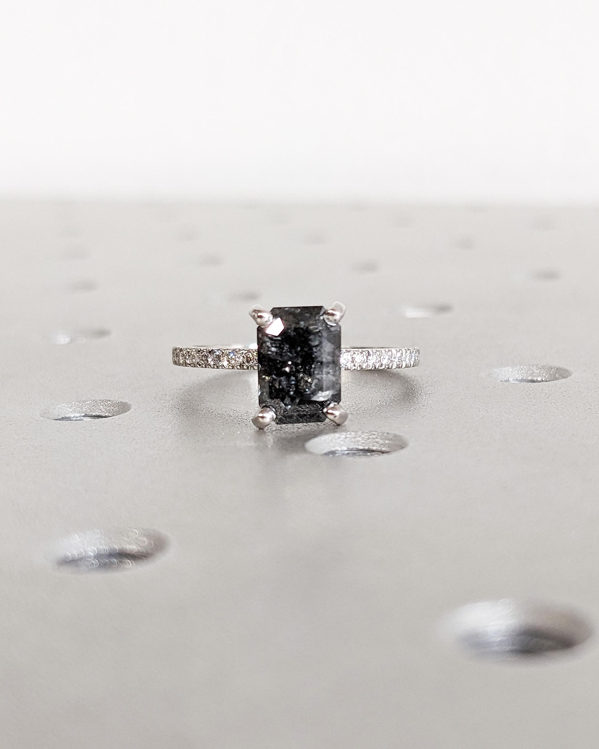 An exquisitely designed setting highlights an emerald-cut salt and pepper main stone, embellished on either side by a sparkling procession of moissanites or diamonds. The graceful 1.6mm narrow band further enhances the sophisticated allure of this piece.