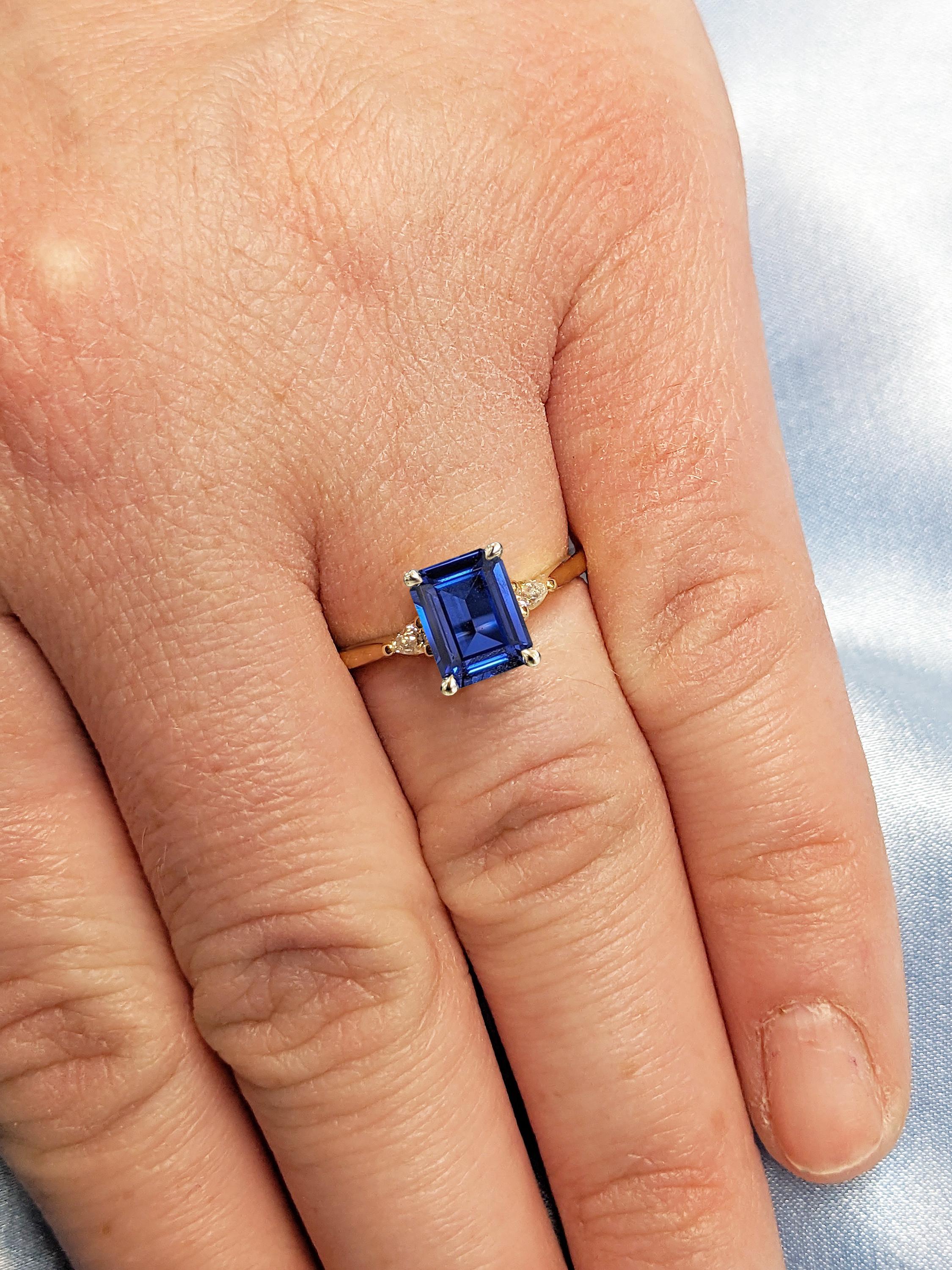 Emerald Cut Sapphire Wedding Anniversary Ring | Blue Sapphire Three Stone Thin Engagement Ring | Lab Sapphire Solid Gold Rings For Women