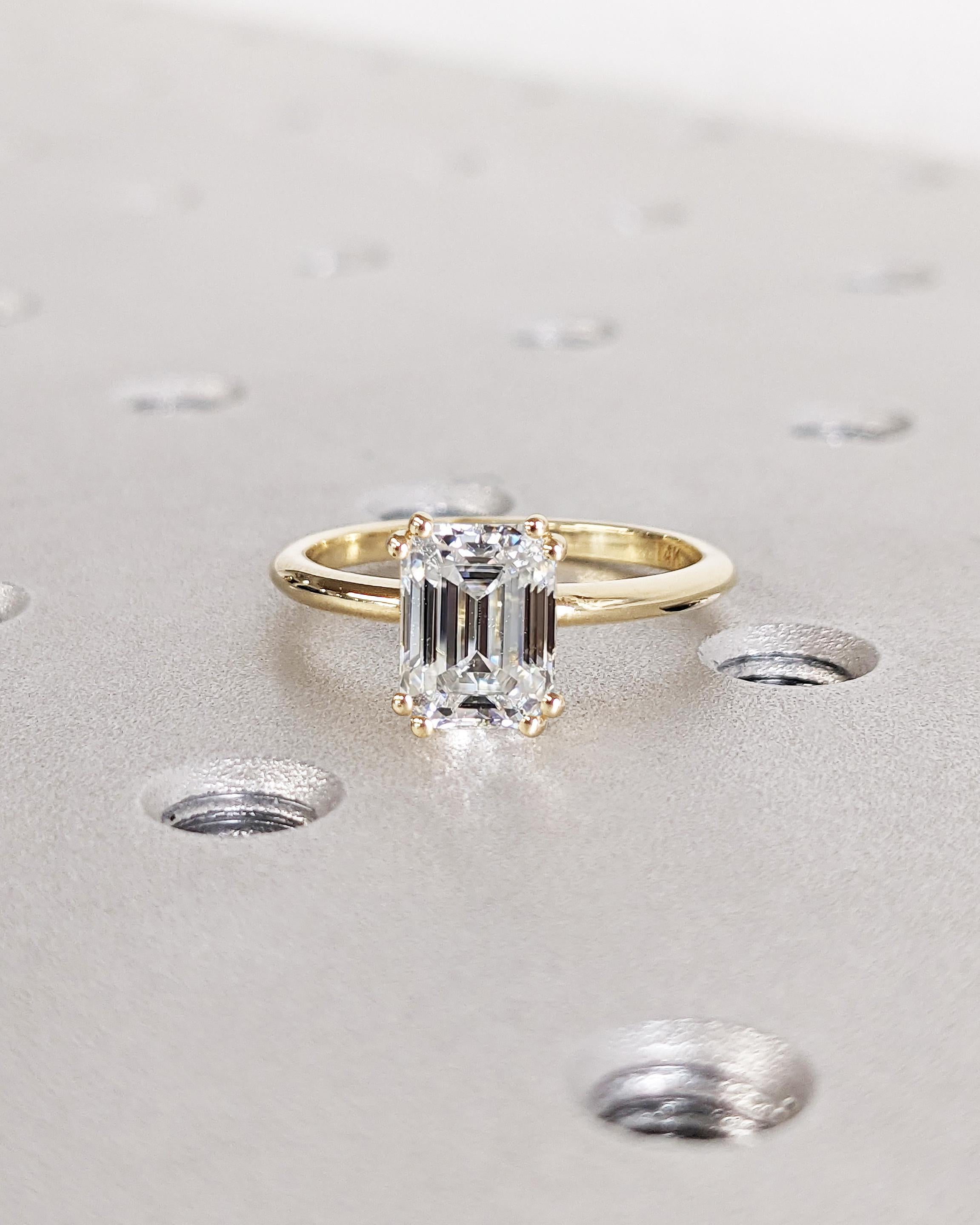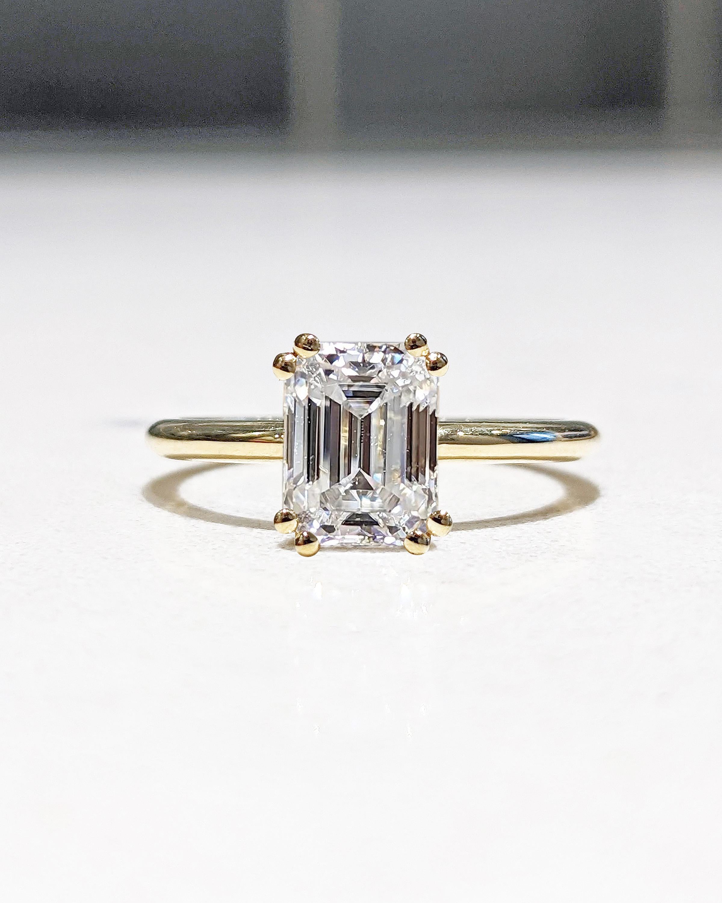 This emerald-cut solitaire engagement ring is the perfect balance of timeless elegance and modern simplicity. Designed with four double prongs, the setting enhances both security and style, giving the ring a distinct yet classic feel. Its minimalist design highlights the beauty of the stone, making it a perfect choice for those who love classic sophistication. A dainty yet durable ring, ideal for everyday wear and a lifetime of love.