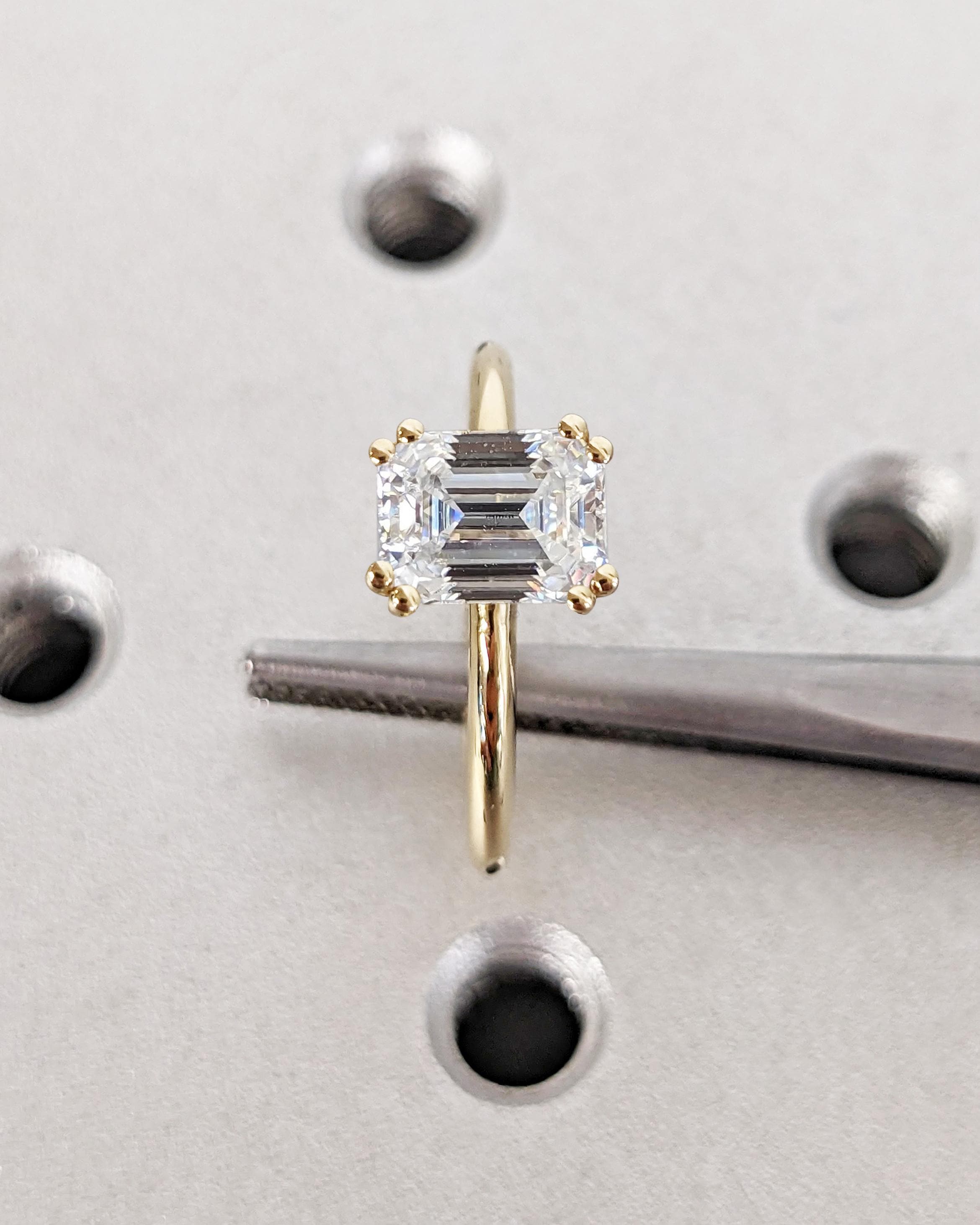This emerald-cut solitaire engagement ring is the perfect balance of timeless elegance and modern simplicity. Designed with four double prongs, the setting enhances both security and style, giving the ring a distinct yet classic feel. Its minimalist design highlights the beauty of the stone, making it a perfect choice for those who love classic sophistication. A dainty yet durable ring, ideal for everyday wear and a lifetime of love.