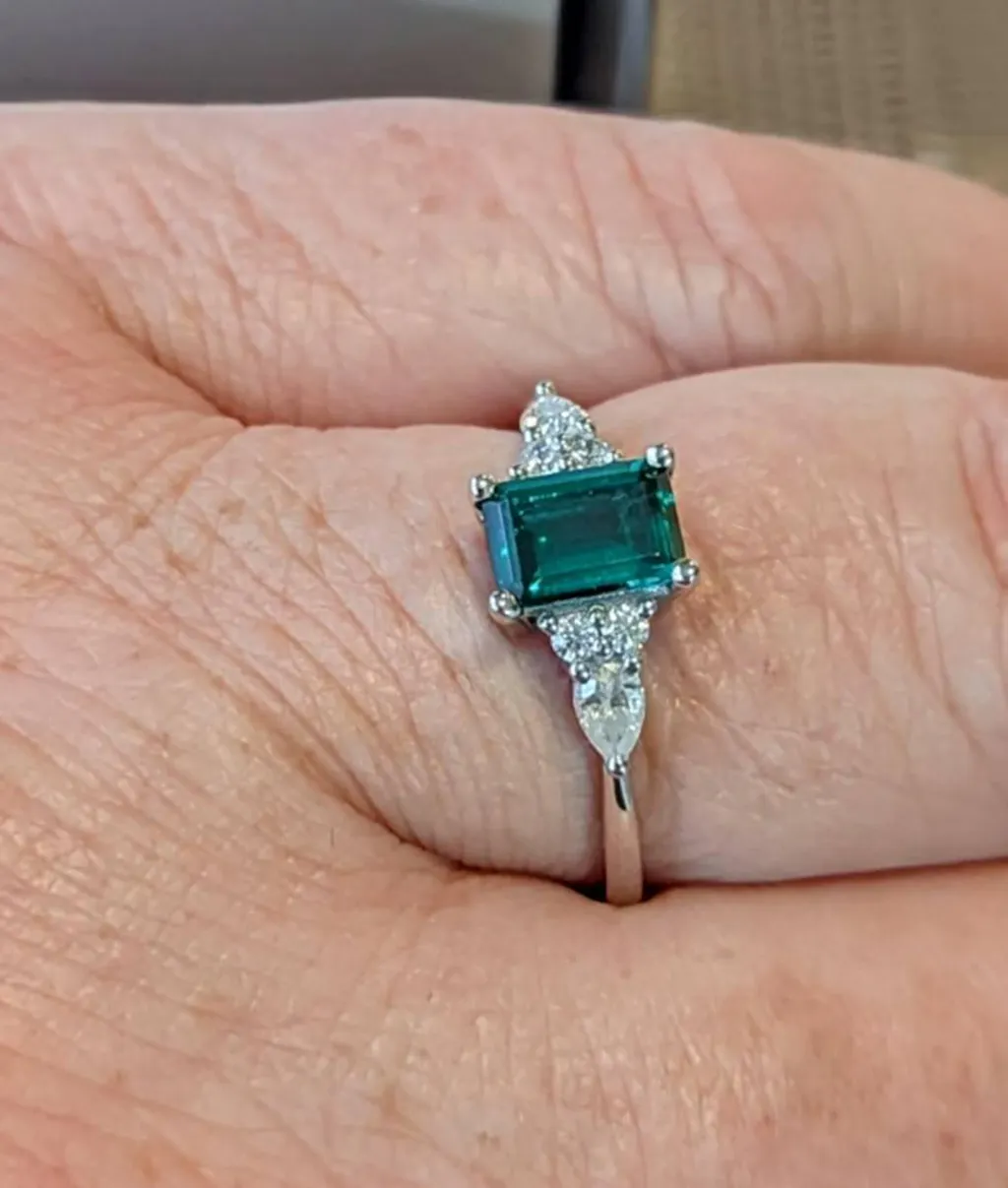 This ornate, vintage-inspired ring features a prong center setting with emerald shaped emerlad, highlighted by prong set moissanites OR diamond on a delicate gold band