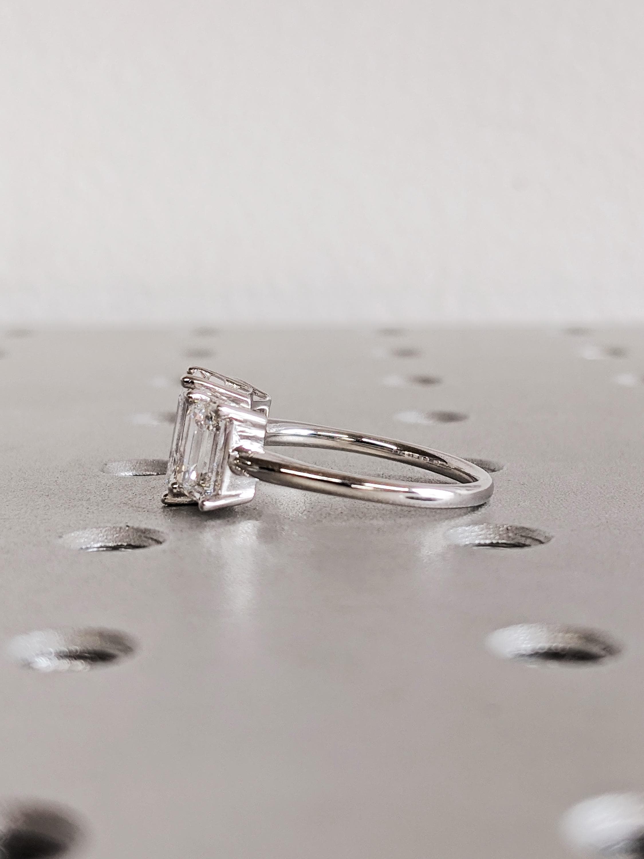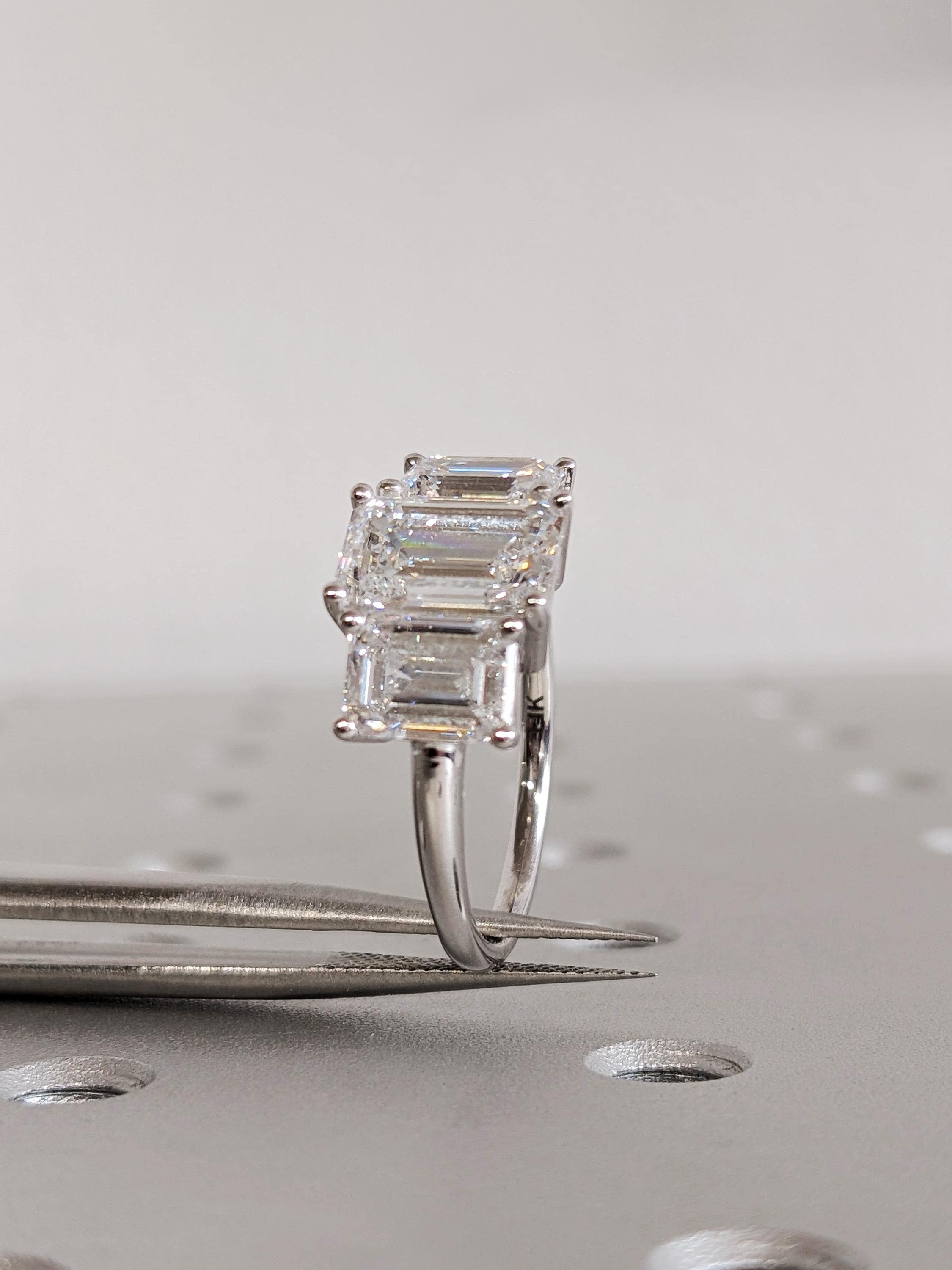 This ring showcases a stunning emerald cut diamonds arranged in a sleek, modern silhouette, creating a clean geometric look. The side stones can be customized in Natural Diamond, Lab Diamond or Moissanite, allowing you to tailor the sparkle to your preference.
