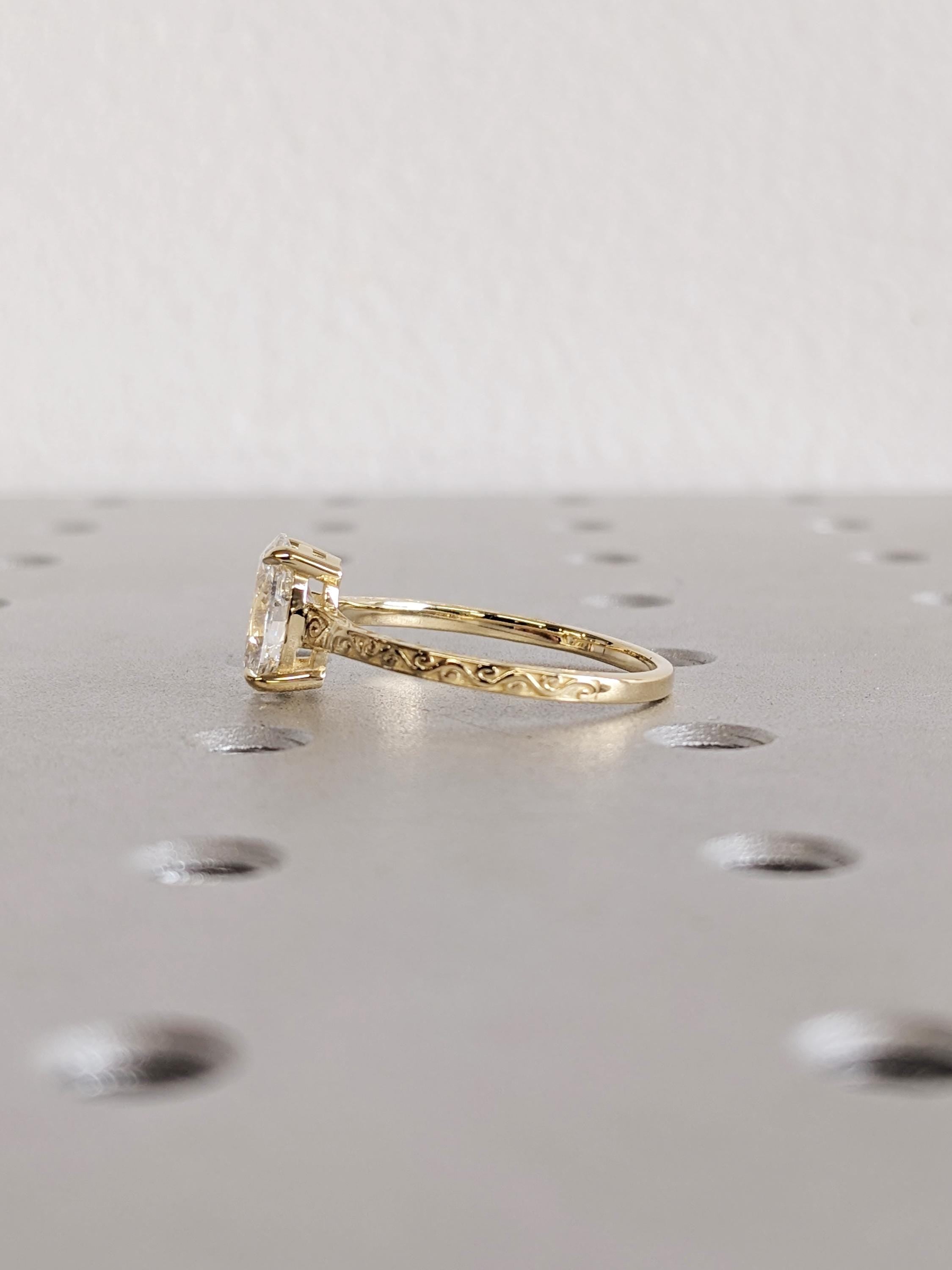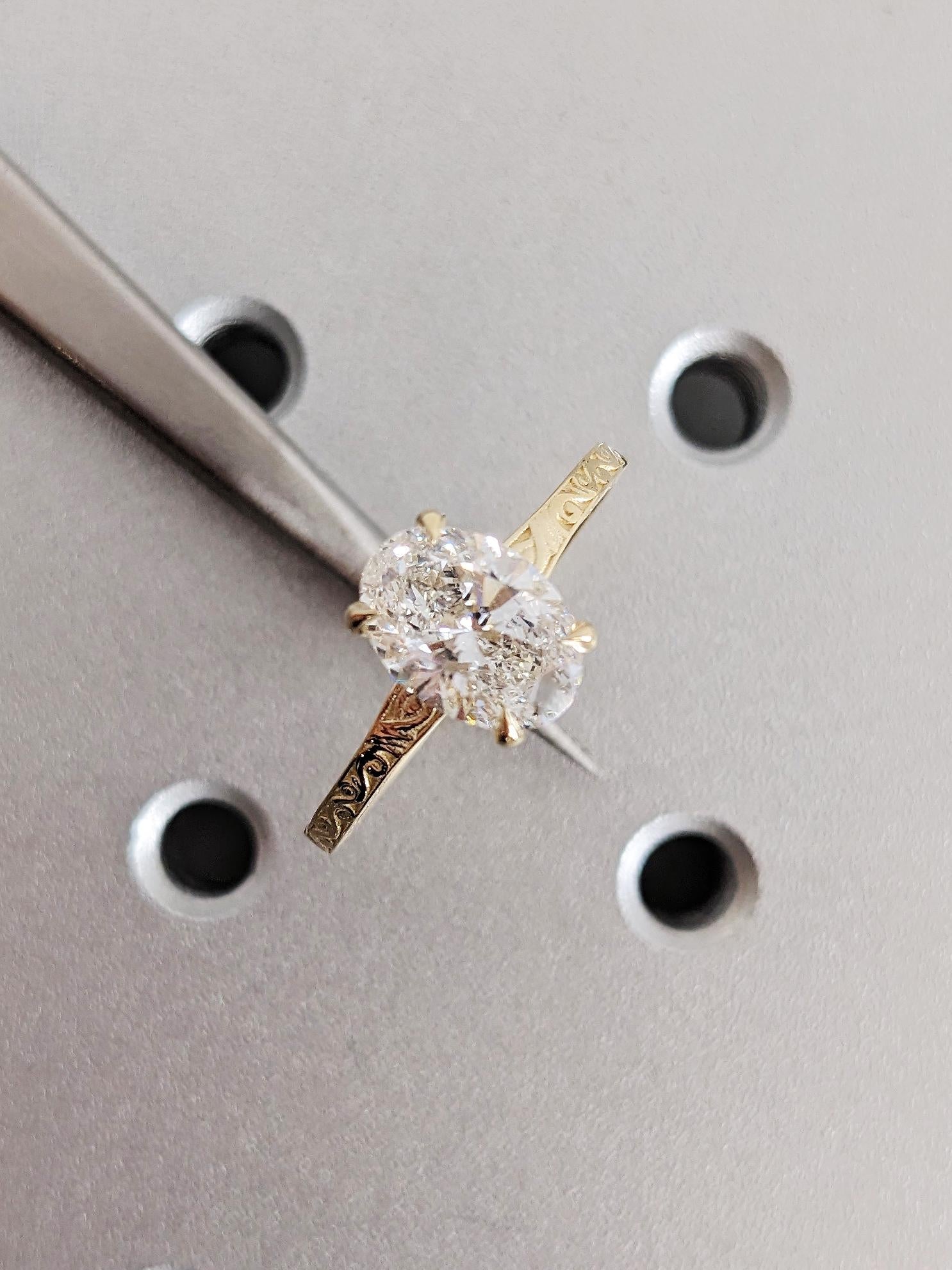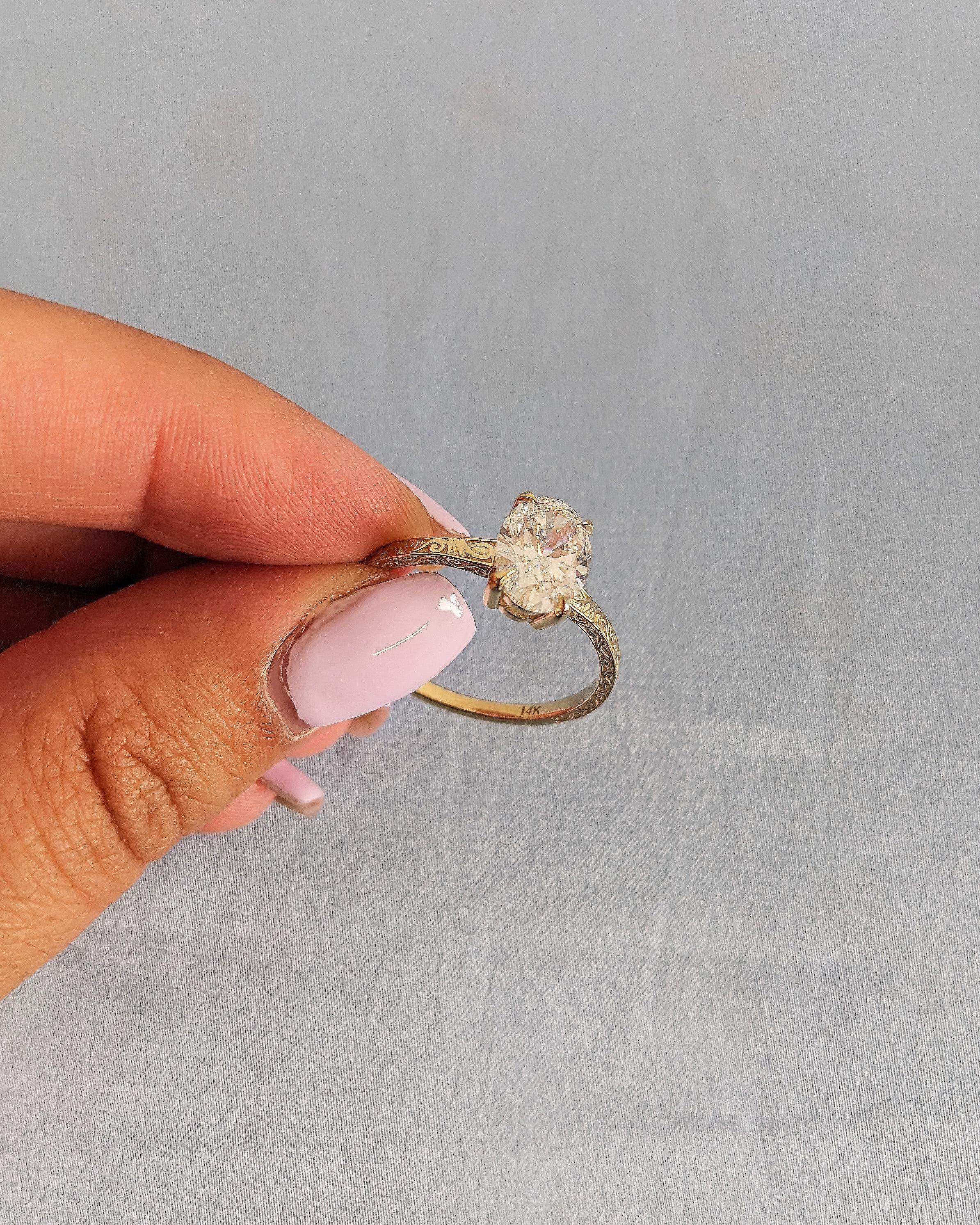This engagement ring features a oval cut Lab Diamond in a talon prong setting, beautifully complemented by a detailed filigree design along the band. The brilliant cut enhances sparkle from every angle, while the intricate pattern adds a timeless vintage charm. A perfect choice for engagements, anniversaries or as a heartfelt gift symbolizing enduring love.