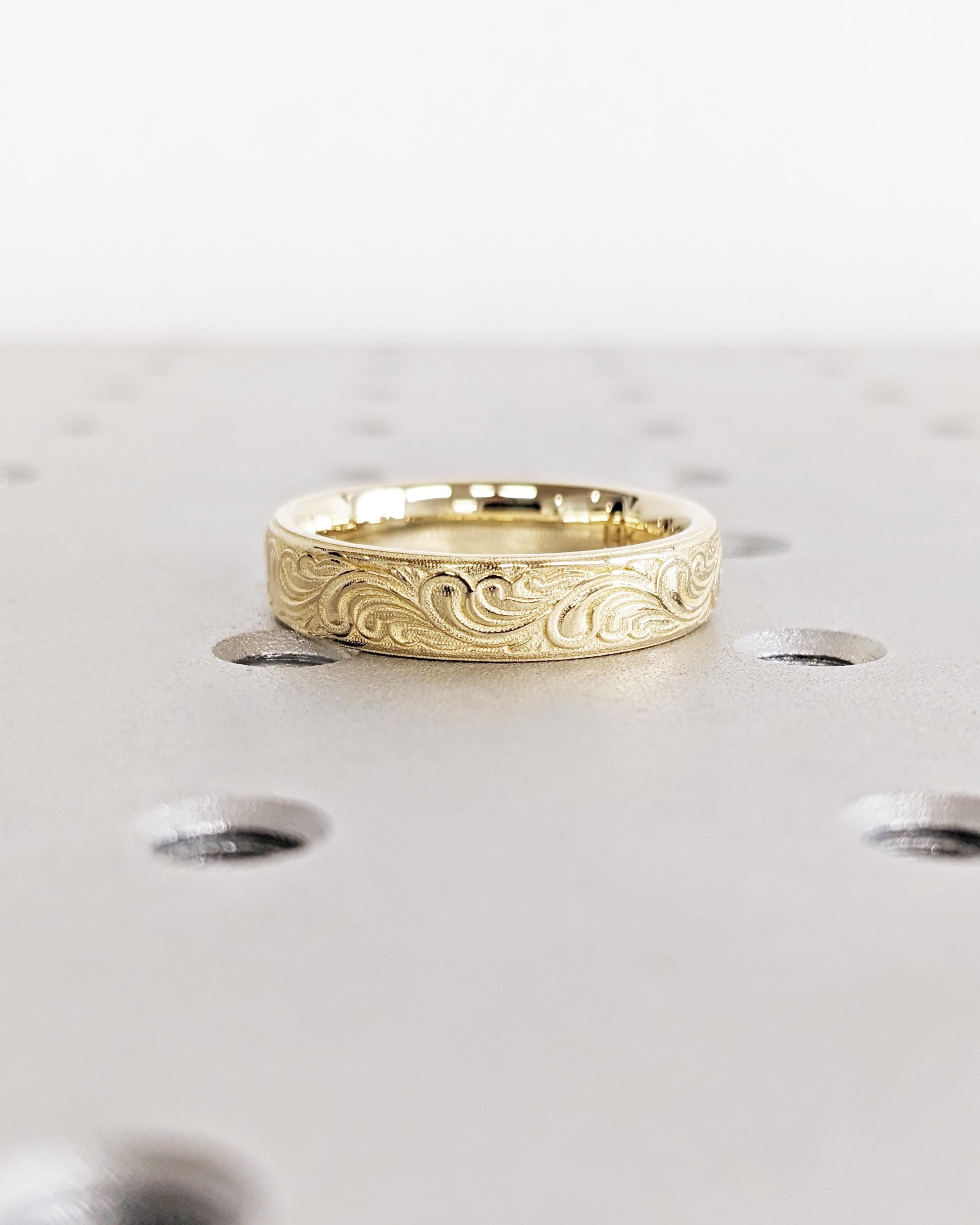 Discover a captivating vintage-inspired wedding band featuring cascading layers of romantic feather-like filigree detailing. Crafted in gold or platinum with exquisite artistry, this 5mm band exudes timeless charm and allure.