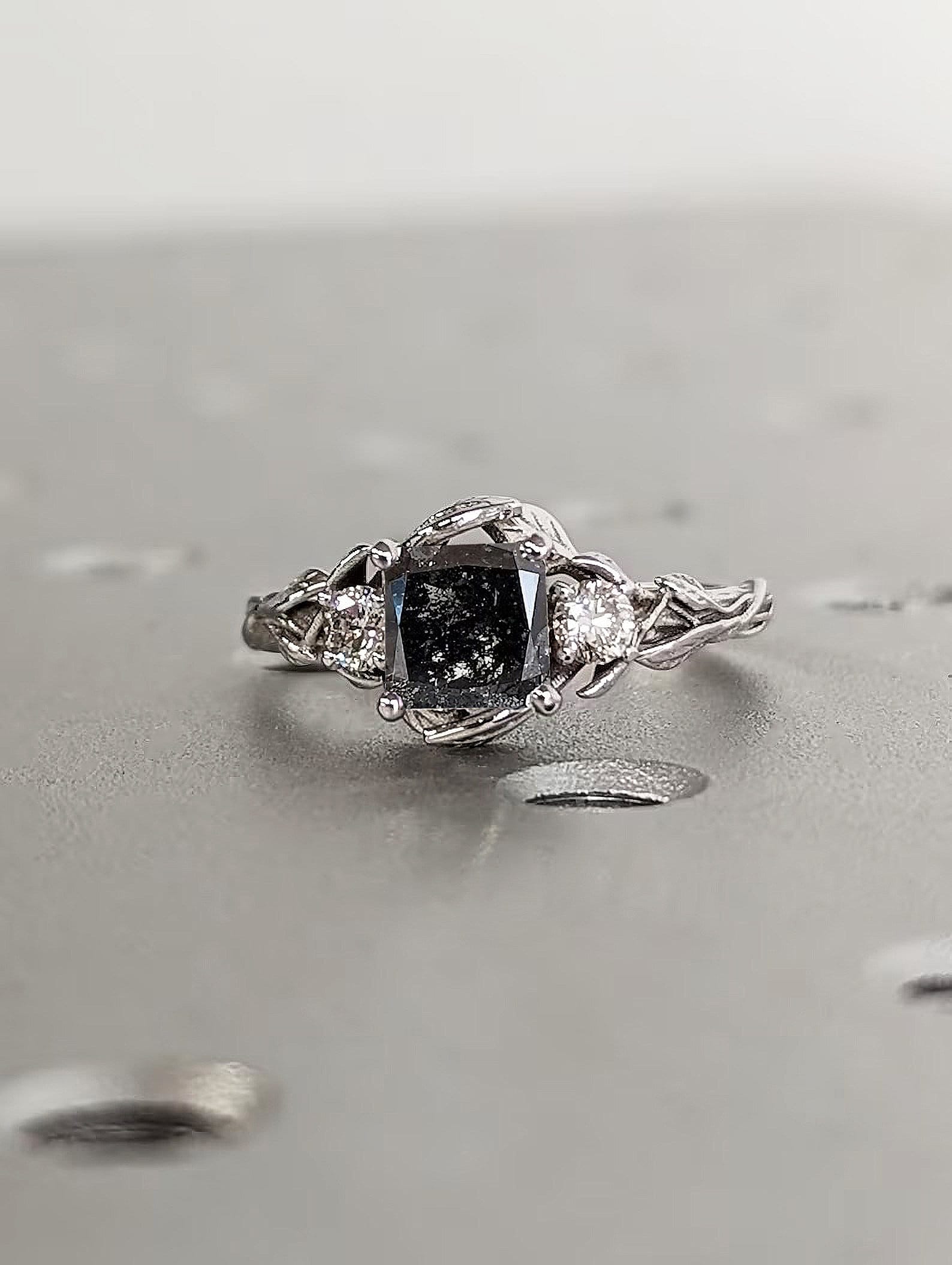 Graceful stems sinuate towards the central princess cut natural Salt and Pepper Diamond, which is framed by elegant lily flowers and vine engraved band, set with diamond or moissanite accents. This vintage inspired jewelry is a great gift for nature lovers and it adds a rustic vibe to any outfit.