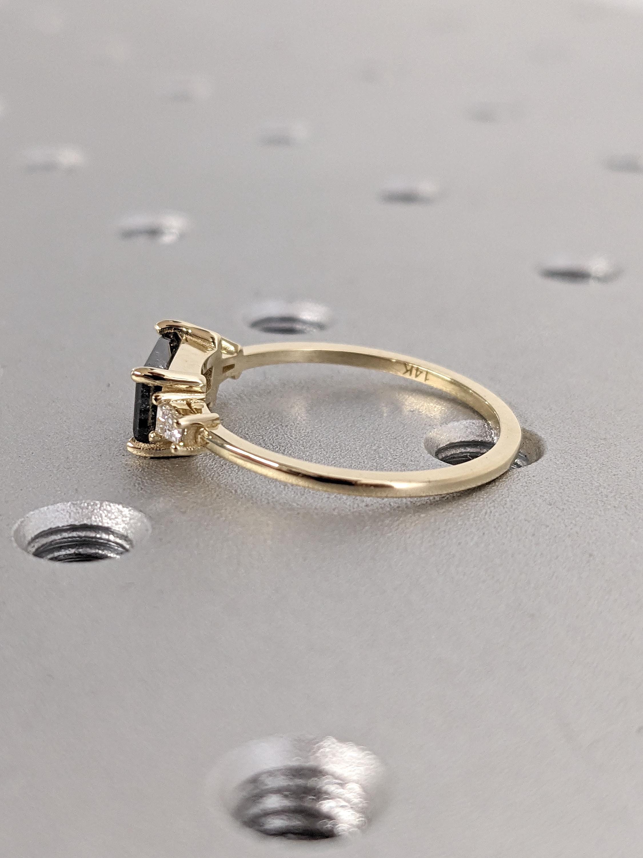 Genuine Diamond Baguette cut Engagement Ring | Salt and Pepper Galaxy Diamond Dainty Ring | 14k Yellow Gold Three Stone Wedding Ring for Her