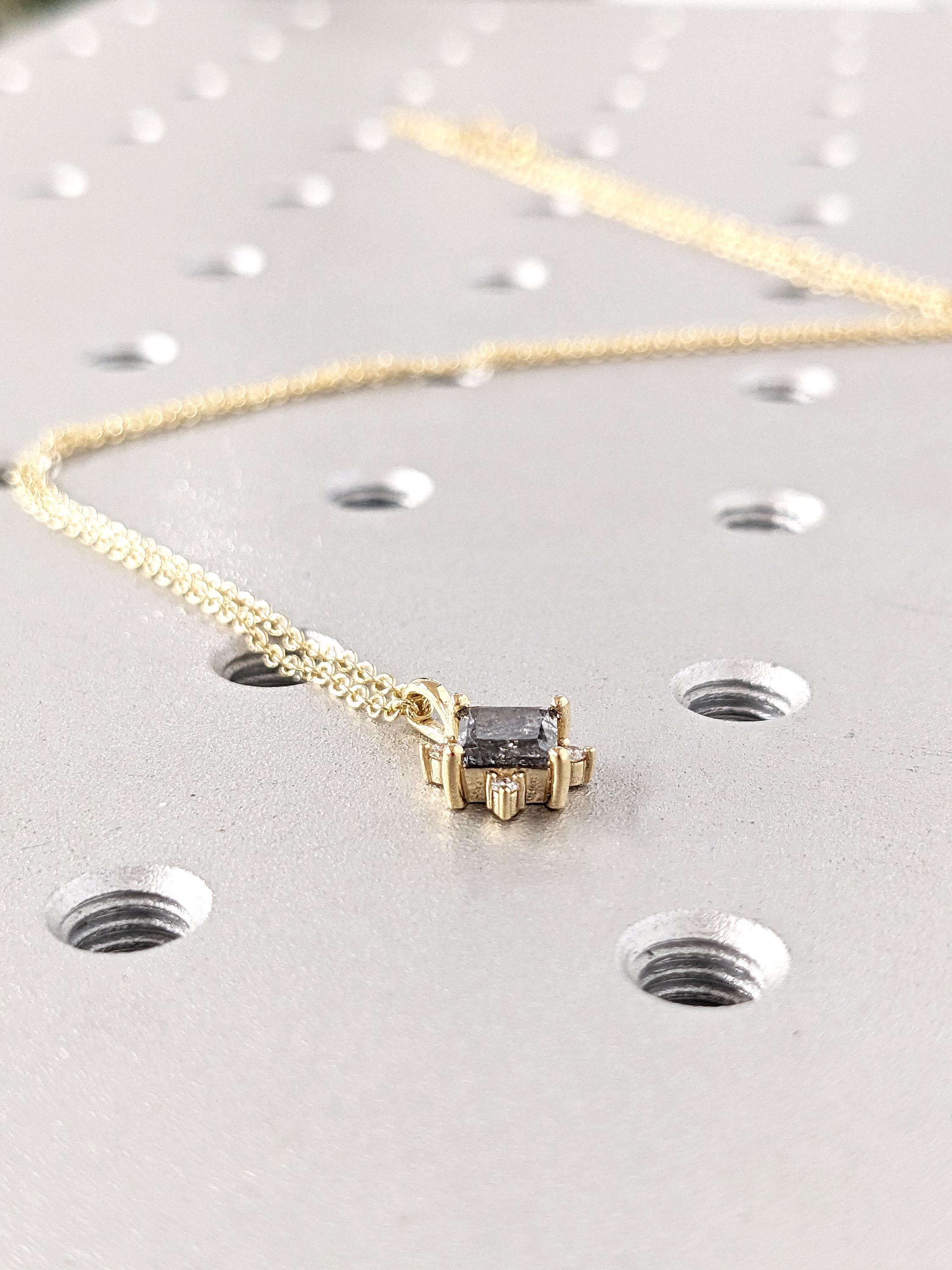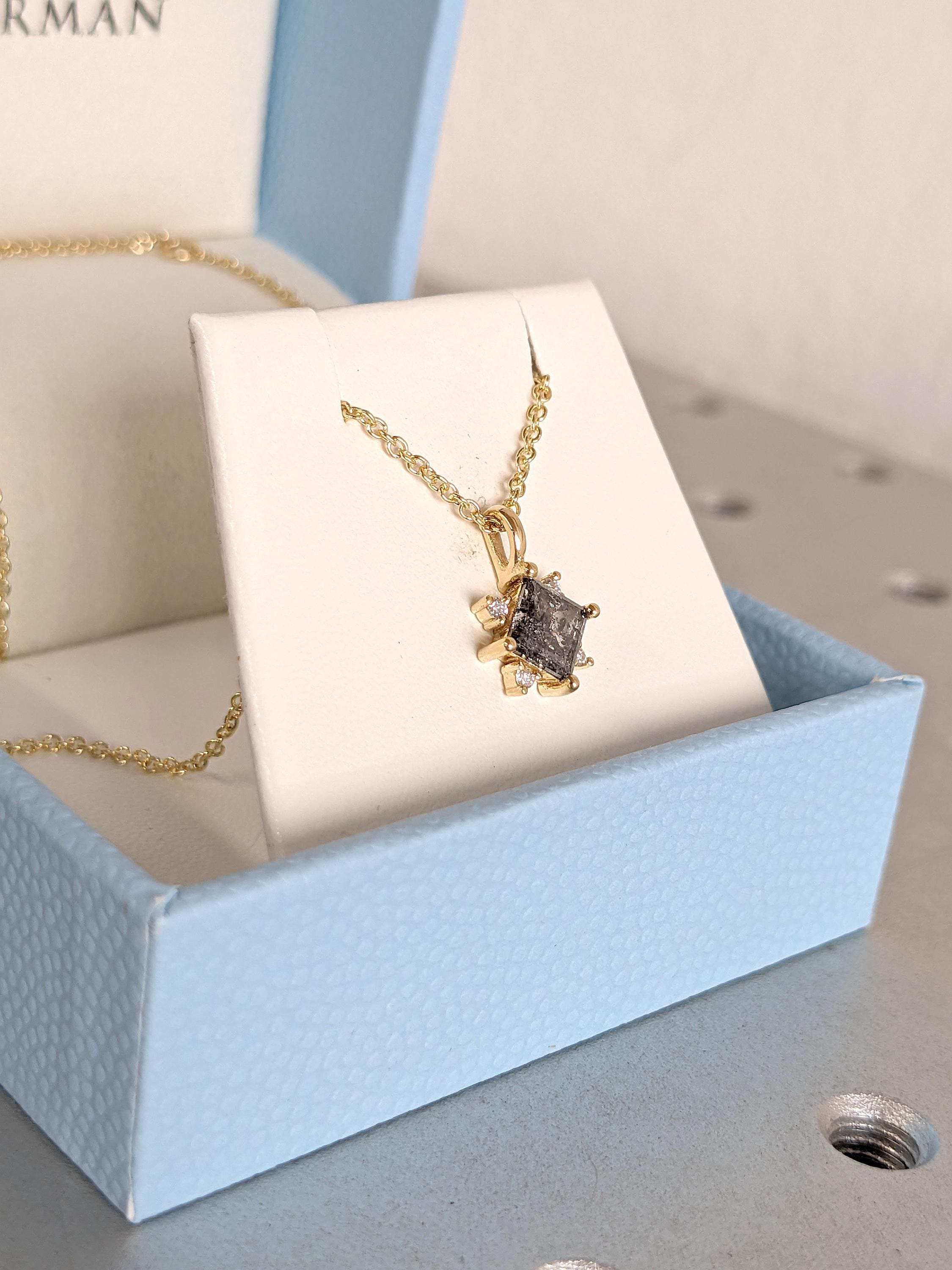 A beautiful handmade princess cut pendant, features a mesmerizing natural Salt and Pepper Diamond focal stone, accented by four dainty round cut side stones. The unique inclusion of the center stone resembling a dreamy galaxy, give this pendant necklace that celestial vibe. The perfect gift for star lovers.